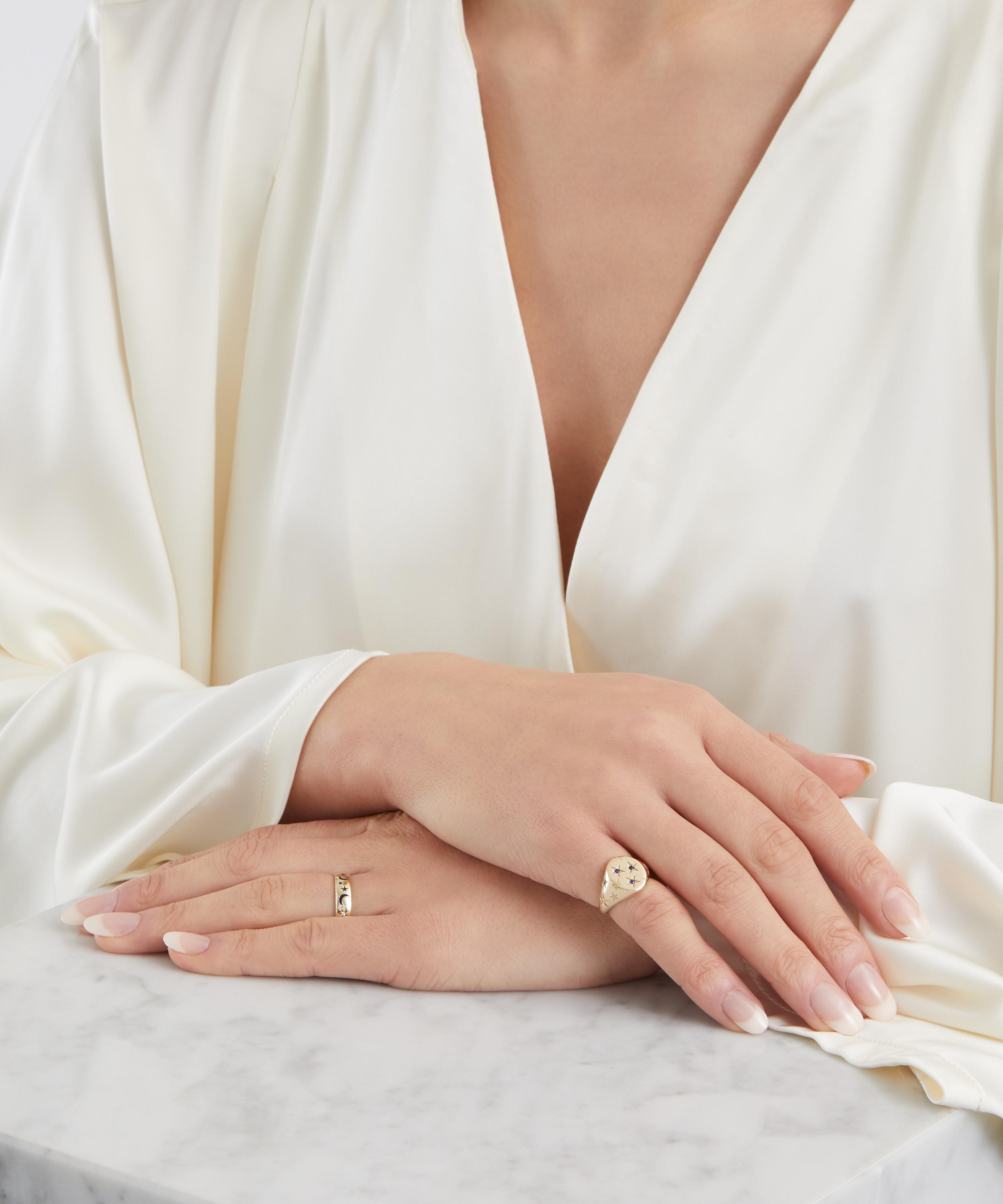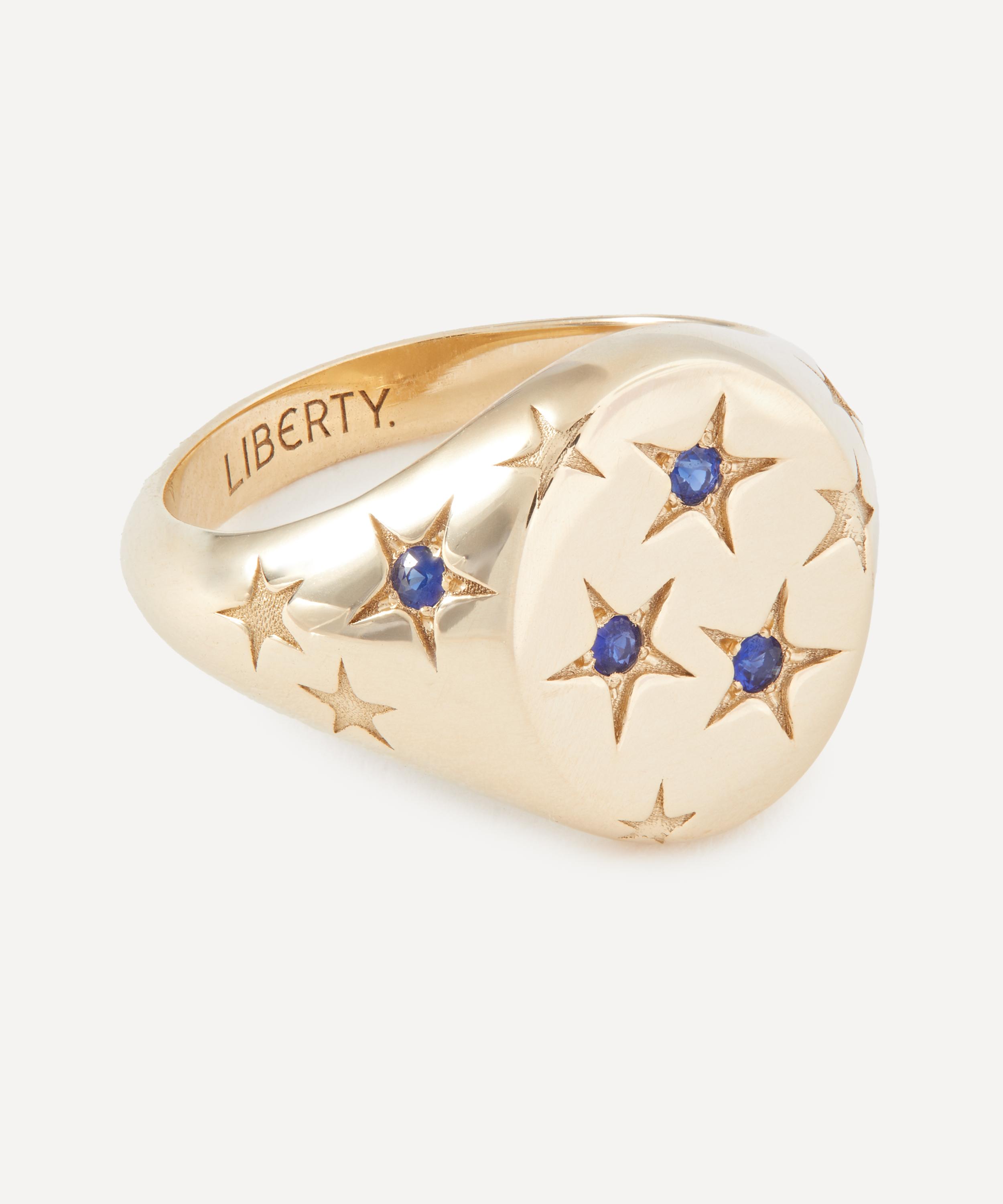 Translating print details and vintage shapes into luxuriously jewelled textures, the Ianthe Star Signet Ring captures Liberty’s historic passion for artists and artisans. Crafted from solid 9ct gold, it features a classic, oval-shaped signet silhouette, decorated with delicately star-set blue sapphires scattered across the surface – boasting a twinkling modern heirloom that pays tribute to Liberty’s collector spirit. Style it solo, incorporate it into a curated ring stack or mix and match with other pieces from the Ianthe Star collection.