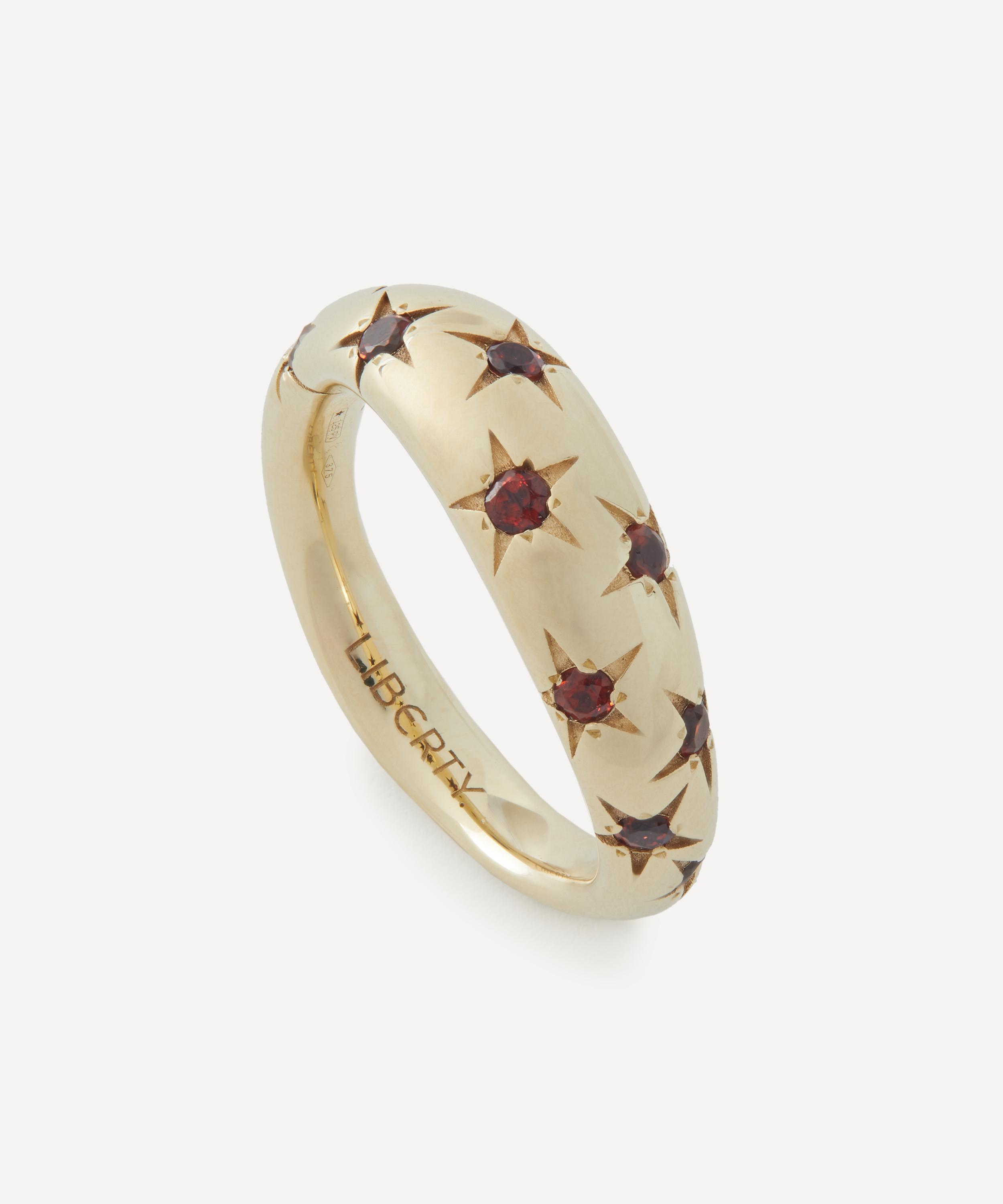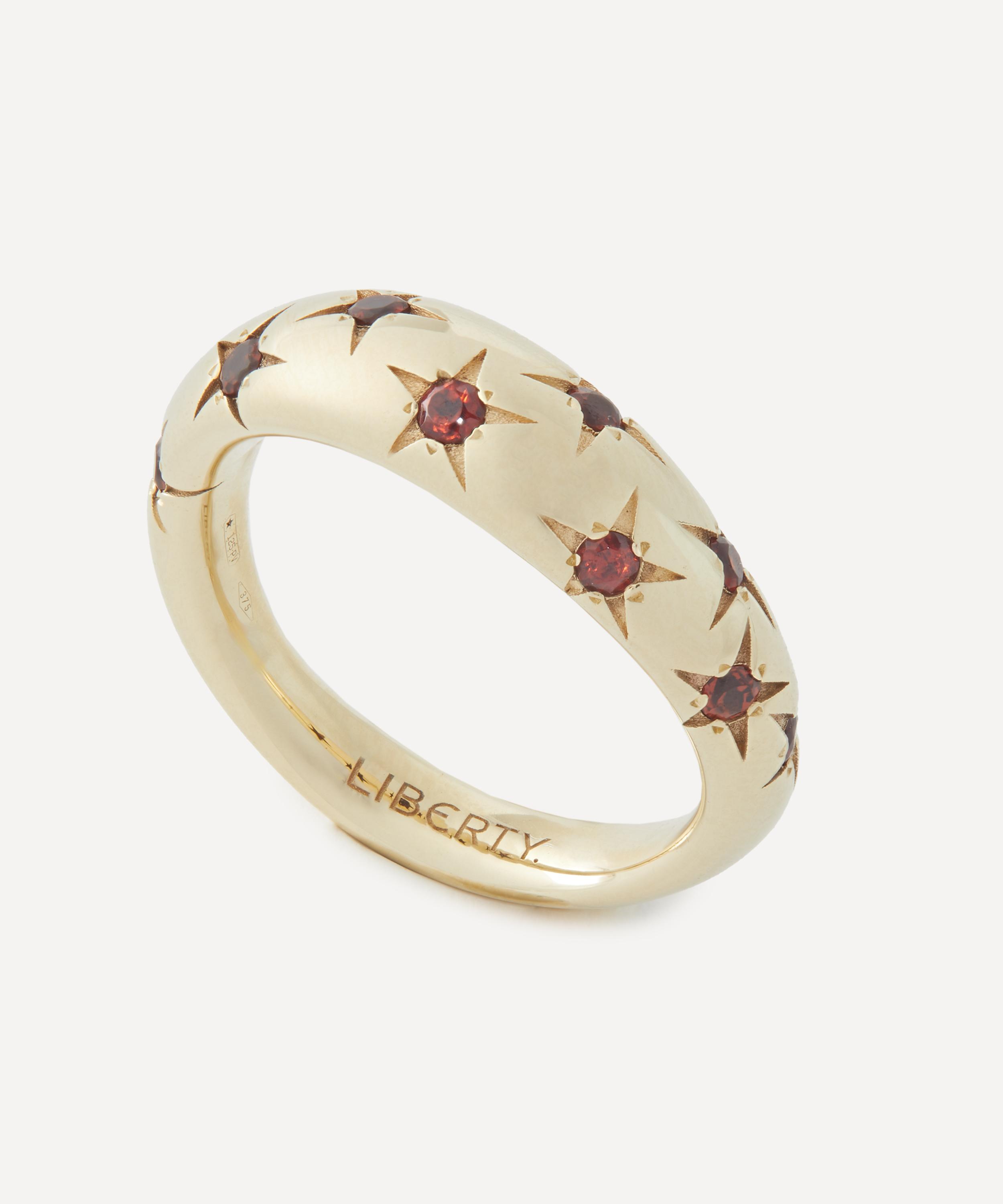 Translating print details and vintage shapes into luxuriously jewelled textures, the Ianthe Star ring captures our studio’s historic passion for artists and artisans. Crafted from 9ct gold, it features a dome-shaped band in a polished finish, intricately decorated with a scattering of star set garnet stones – boasting a twinkling modern heirloom that pays tribute to Liberty’s collector spirit.