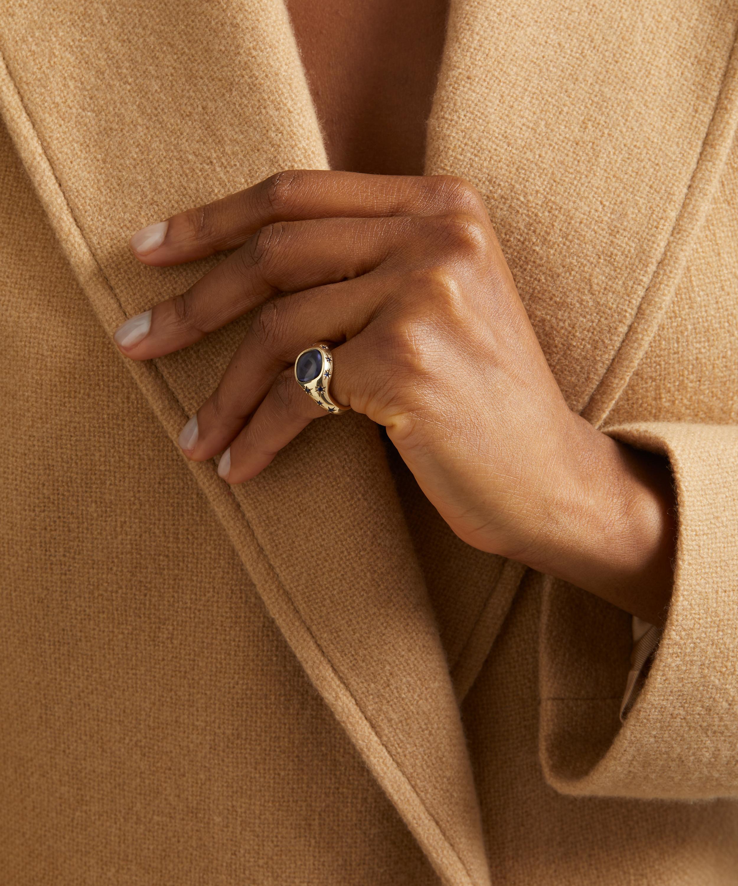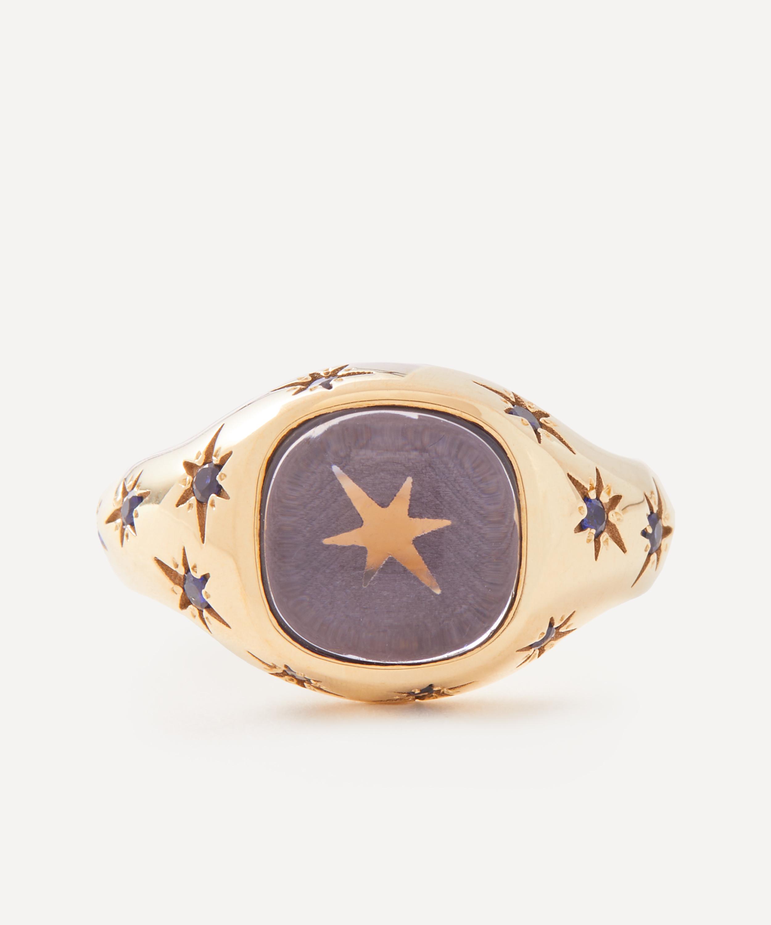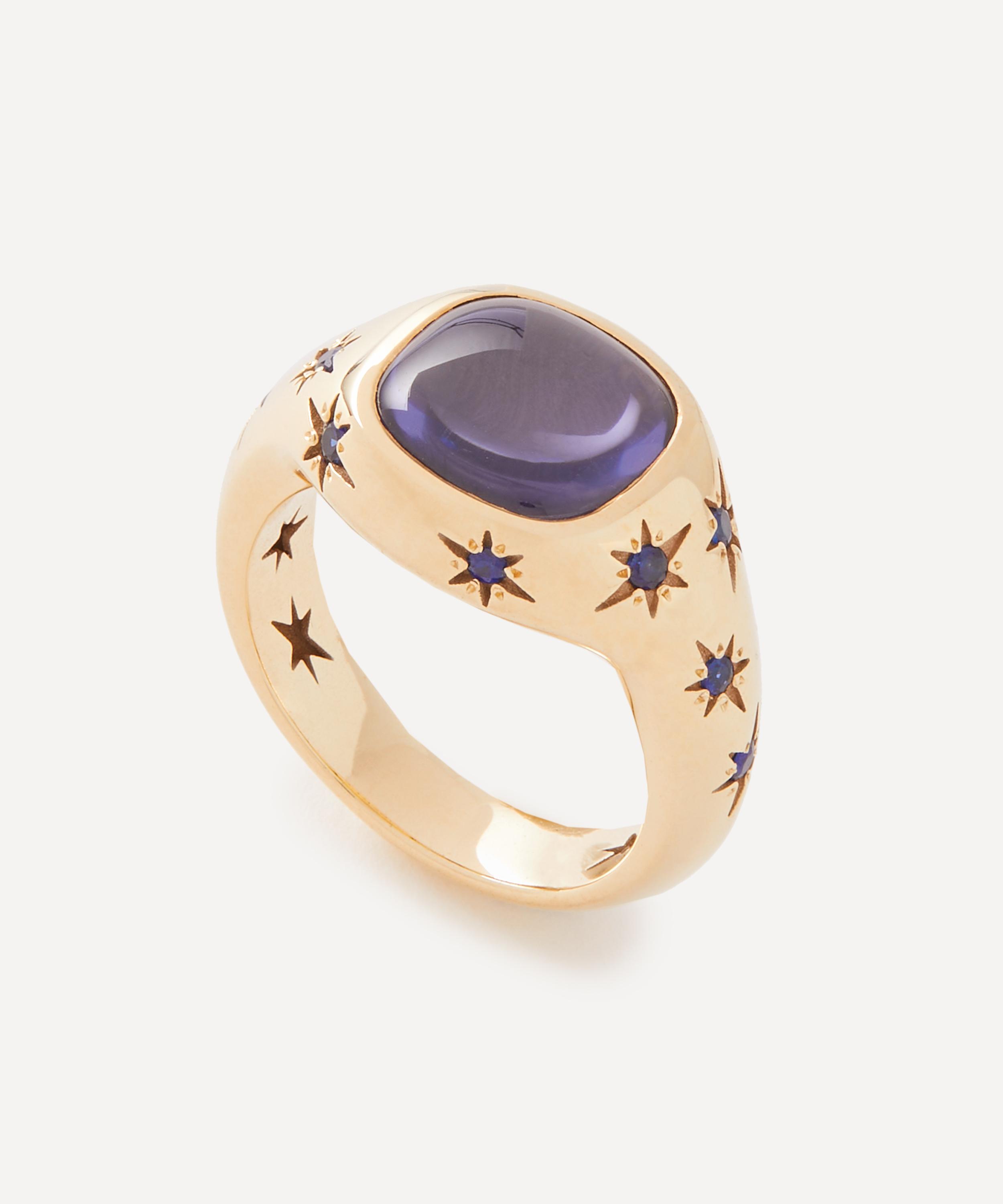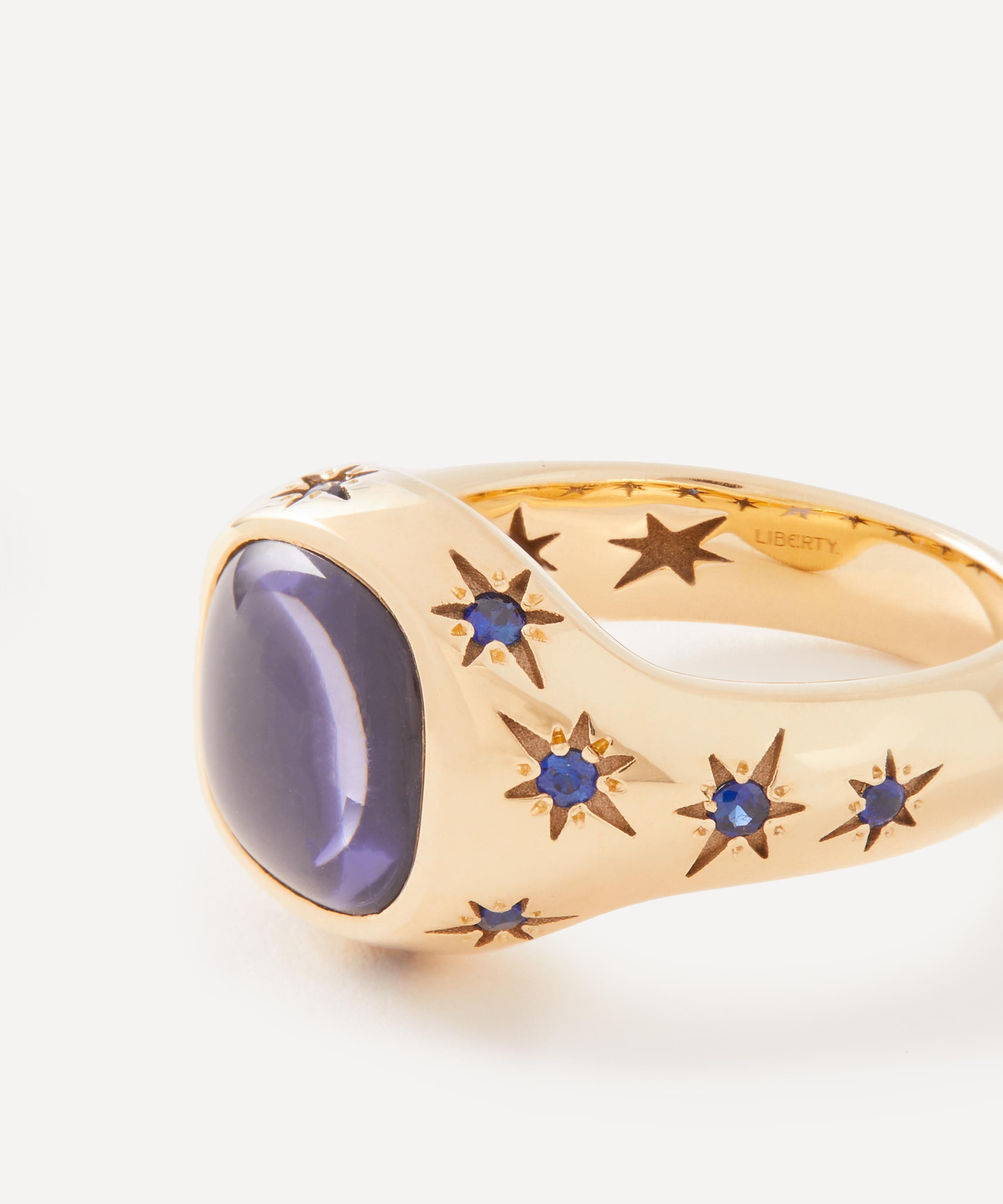 Translating print details and vintage shapes into luxuriously jewelled textures, the Ianthe Star cocktail ring captures our studio’s historic passion for artists and artisans. Decorated with a blue iolite centre stone accented with sapphire and amethyst set stars on the sides, this twinkling modern heirloom pays tribute to Liberty’s collector spirit.