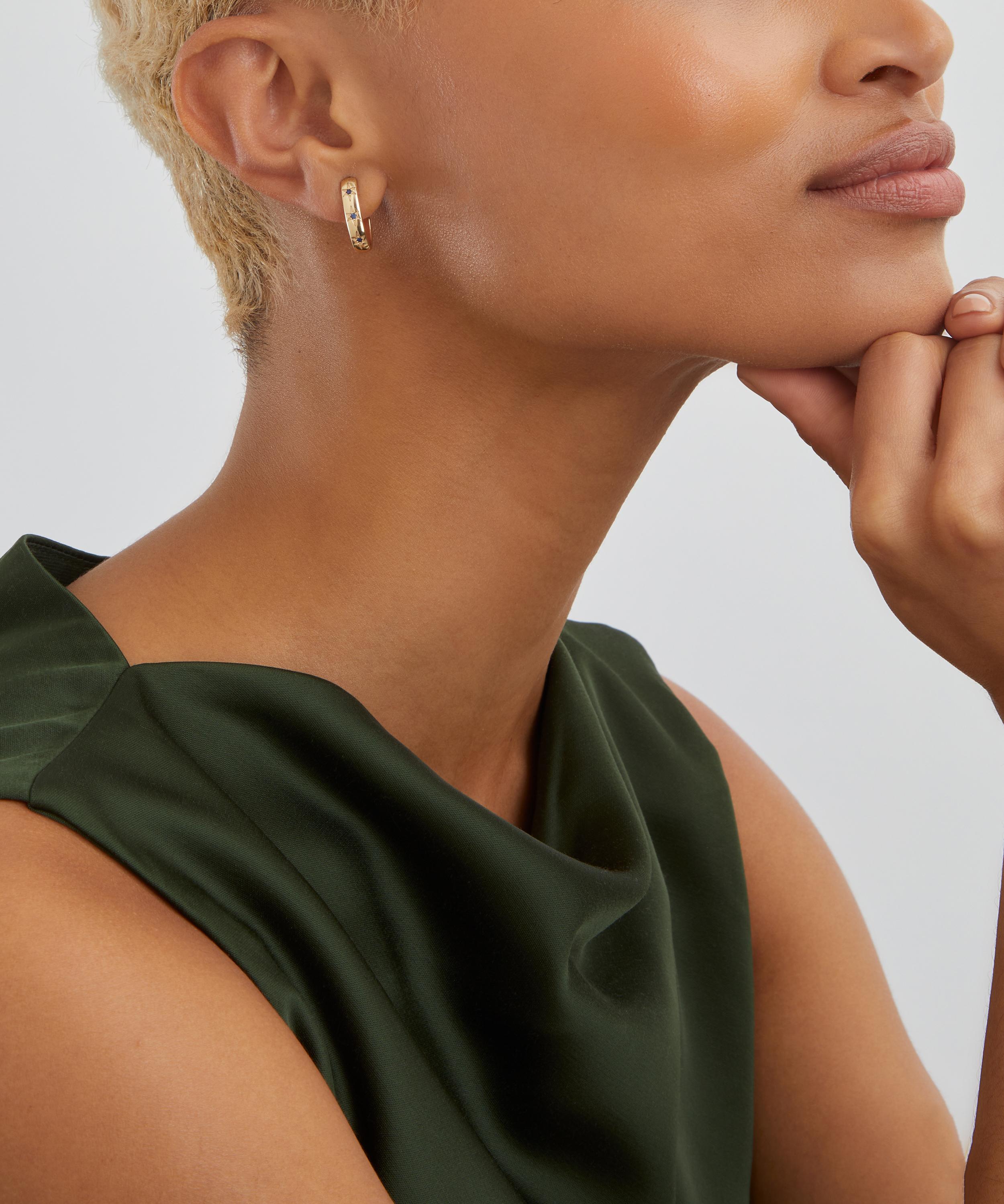 Translating print details and vintage shapes into luxuriously jewelled textures, the Ianthe Star creole hoop earrings capture our studio’s historic passion for artists and artisans. Crafted from 9ct gold, each earring features a polished half hoop, intricately decorated with star set blue sapphires – boasting a twinkling modern heirloom that pays tribute to Liberty’s collector spirit. Style them as they are, incorporate into a curated ear stack or mix and match with other pieces from the Ianthe Star collection.