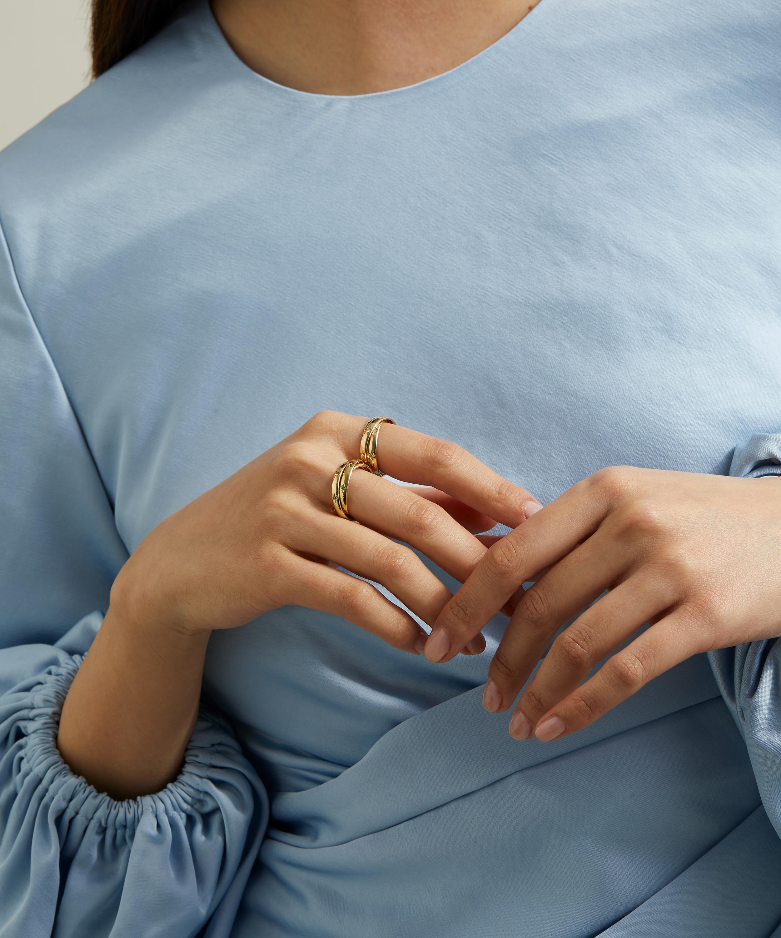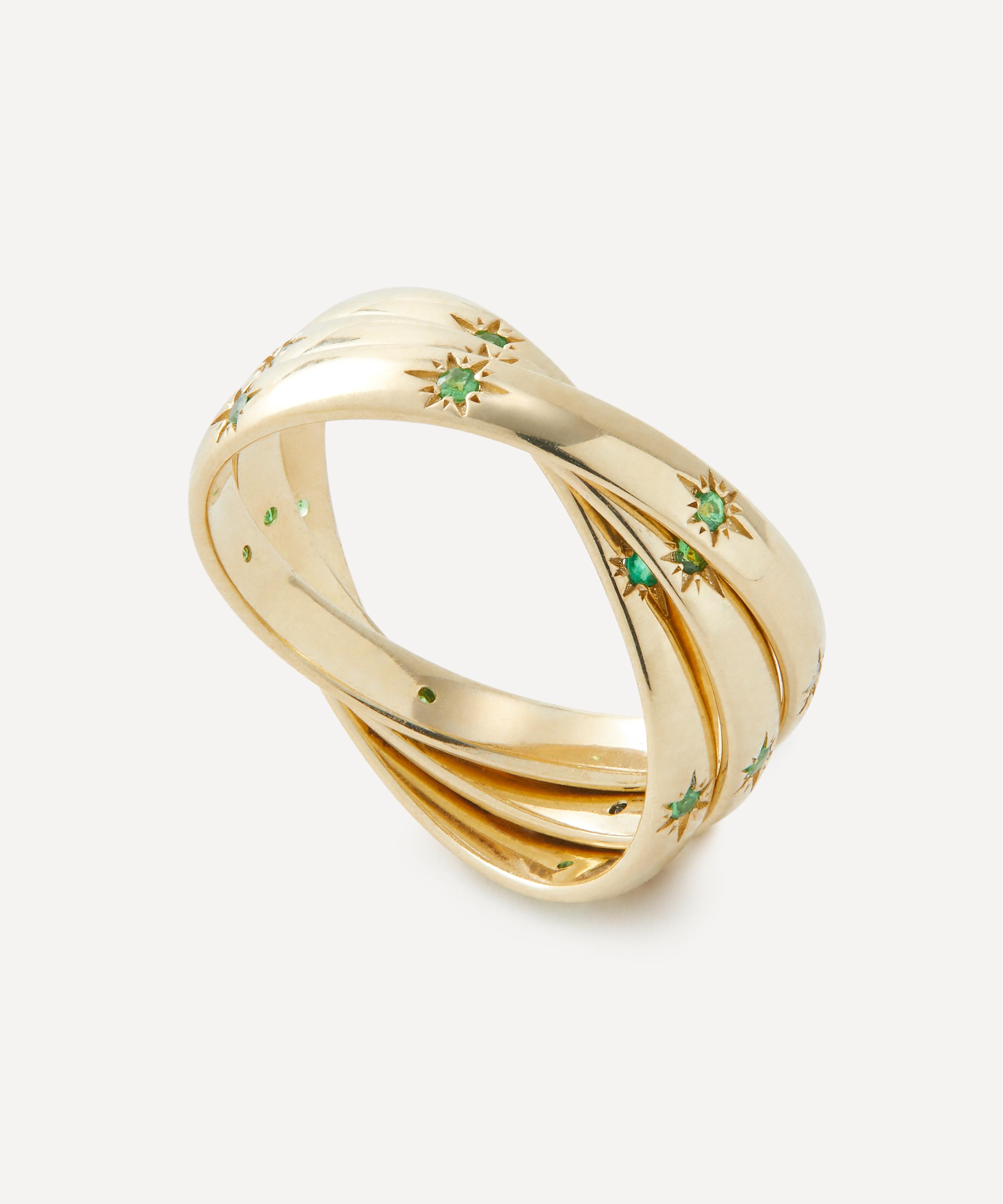 Translating print details and vintage shapes into luxuriously jewelled textures, the Ianthe Star Trilogy ring captures our studio’s historic passion for artists and artisans. Crafted from 9ct gold, it features three interconnected bands in a polished finish, skilfully decorated with star set tsavorite accents – boasting a twinkling modern heirloom that pays tribute to Liberty’s collector spirit.