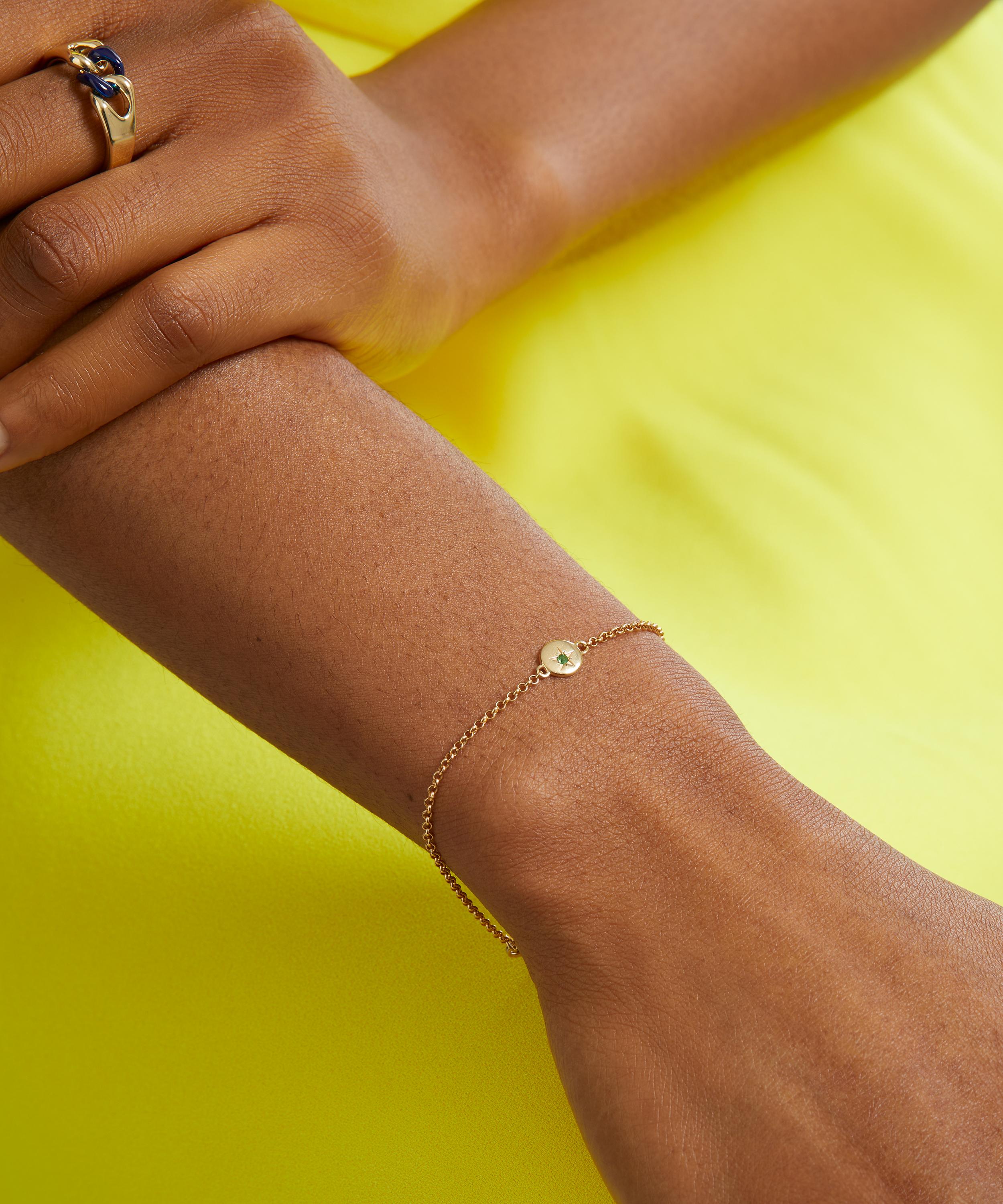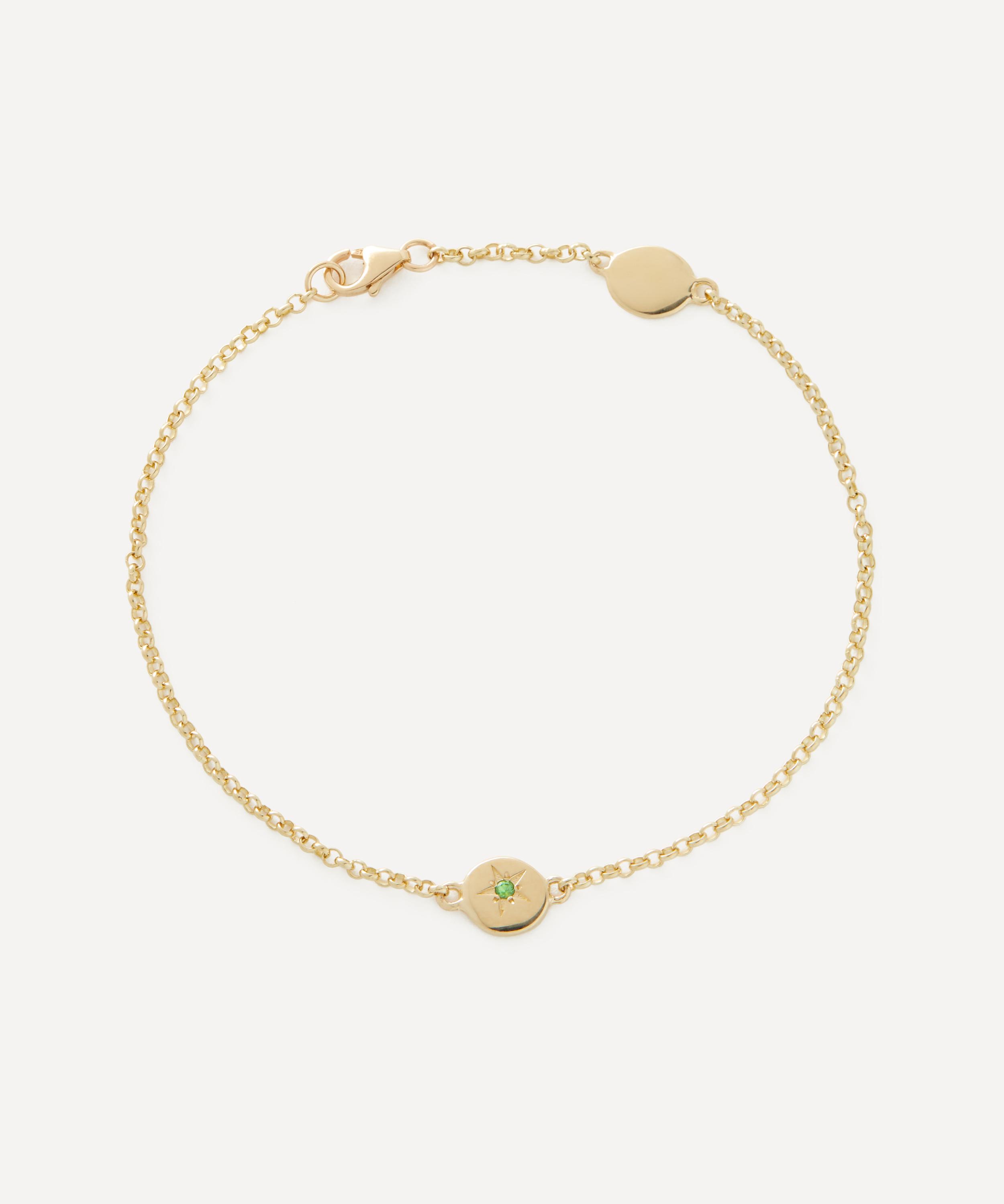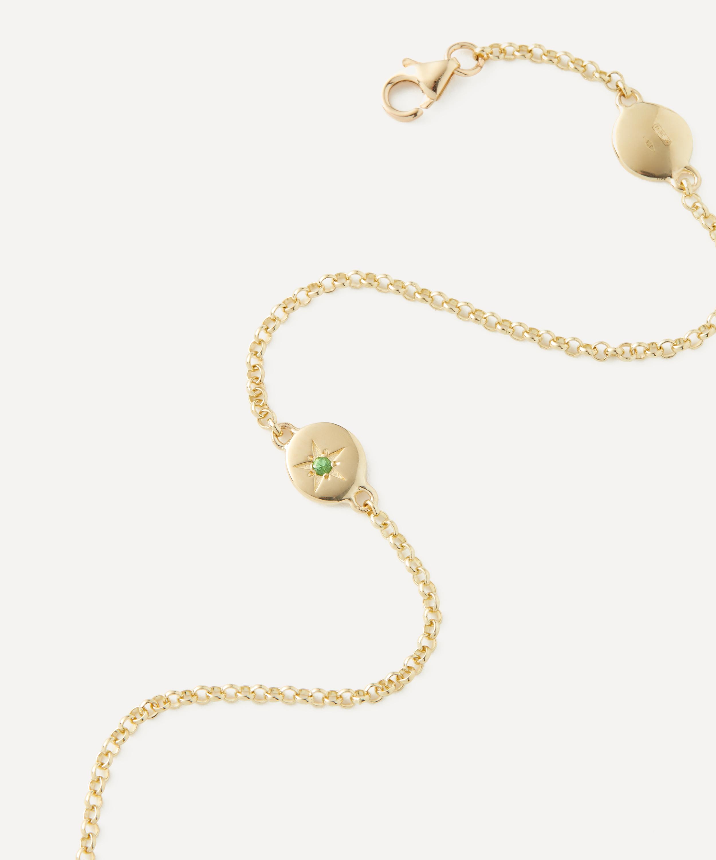 Translating print details and vintage shapes into luxuriously jewelled textures, the Ianthe Star tsavorite bracelet captures our studio’s historic passion for artists and artisans. Featuring a delicate trace chain and round charm embellished with a tsavorite set star accent, this twinkling modern heirloom pays tribute to Liberty’s collector spirit.
