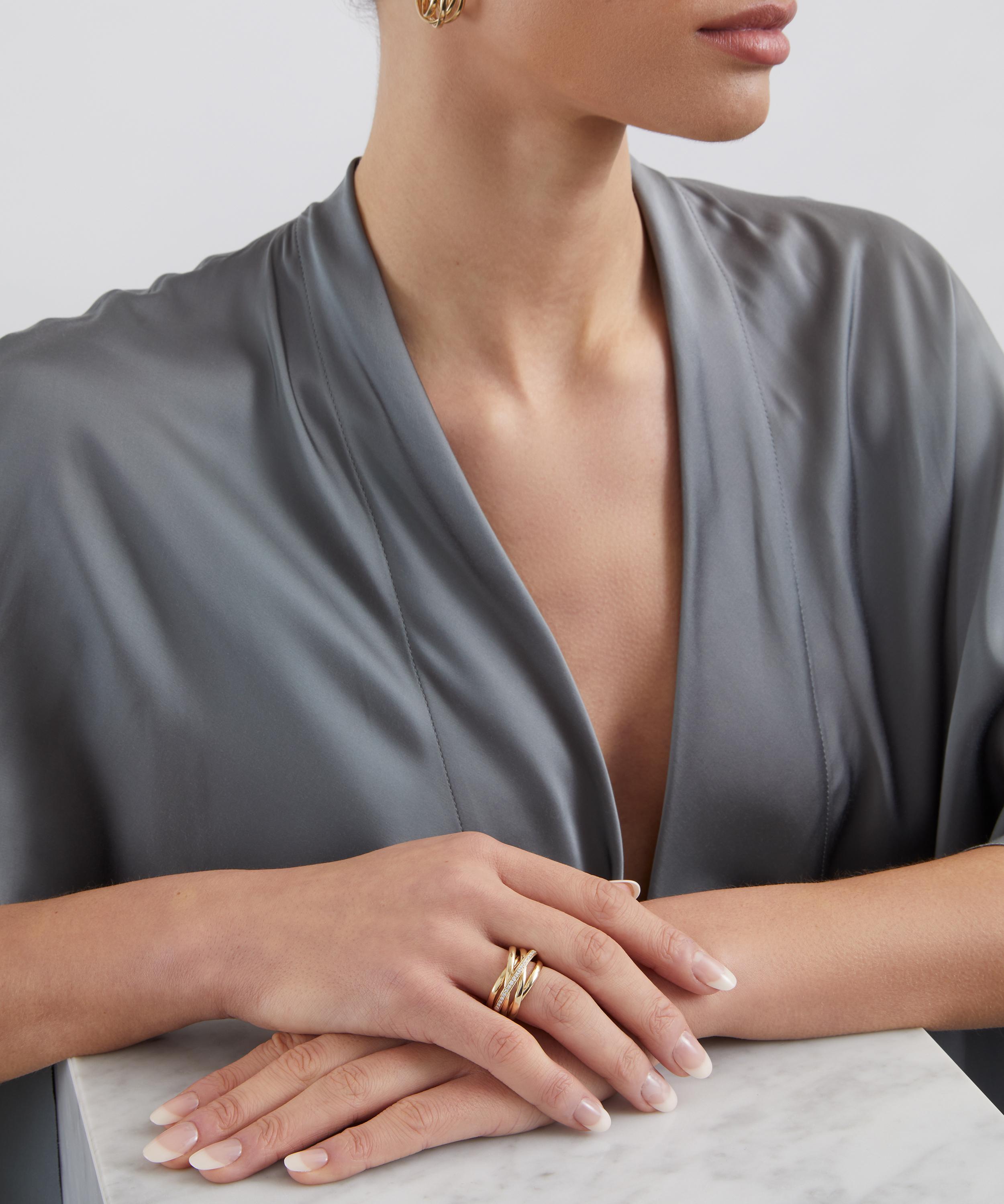 Handmade in Italy from solid 9ct gold, it draws upon clean, contemporary lines, expressed through multiple polished bands that gently fold and weave around one another, accented with delicately set diamonds. The result is a layered, sculptural silhouette that speaks to unity and enduring refinement. Ideal for those seeking a meaningful yet understated piece, it offers a subtle statement that feels both confident and timeless. Designed to transition seamlessly from day to evening, it pairs beautifully with the coordinating Intertwined Earrings or the plain gold edition for a sophisticated interplay of simplicity and elevated elegance.