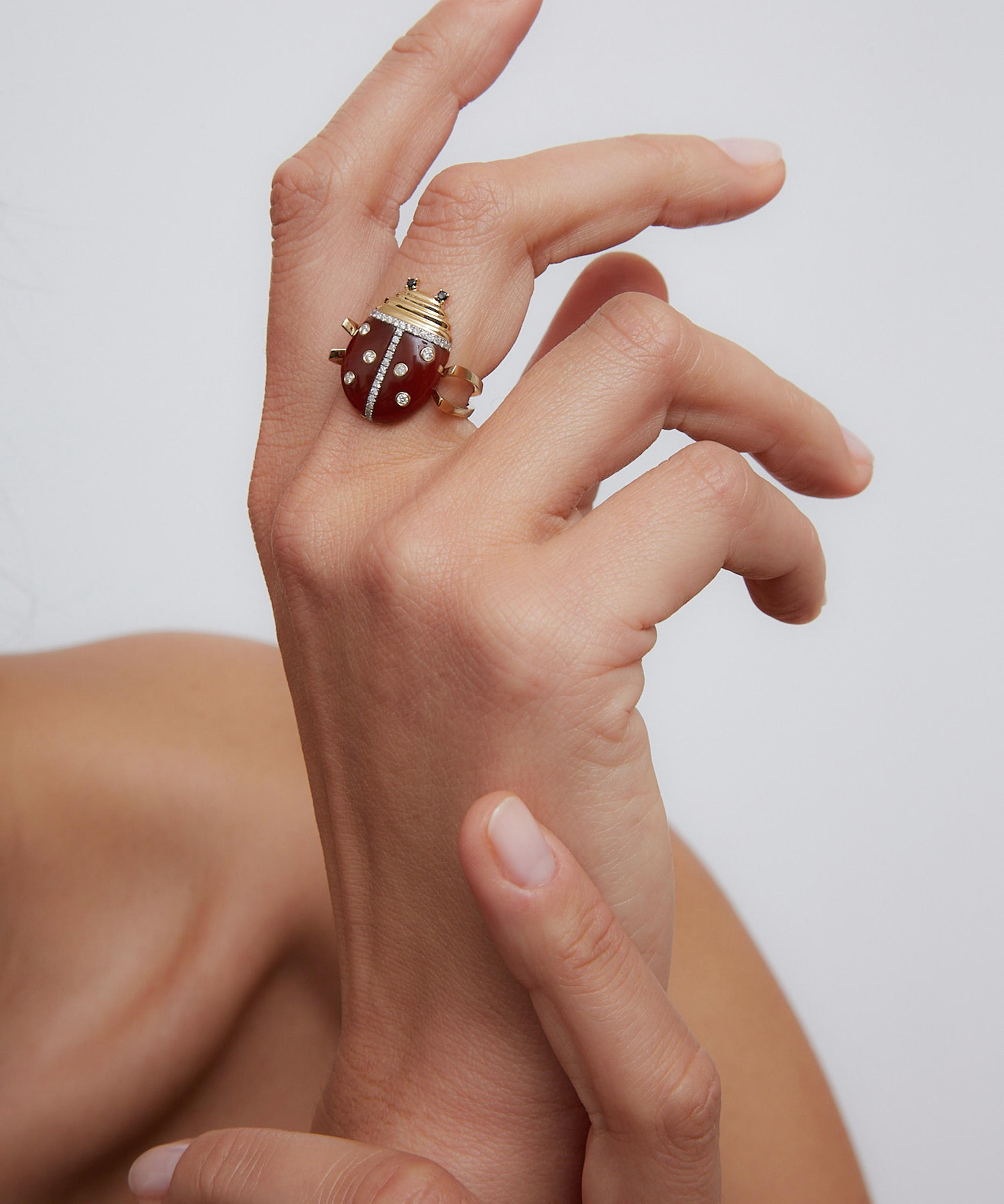 Delve into a world of vintage classics and tie your whole look together with this ring from Yvonne Léon. Crafted from 9ct gold, the designer beautifully unites vintage charm with a modern reinvention in this piece – featuring a sweet ladybug design composed of red agate with grey and black diamonds. Wear it on its own, incorporate it into a stack, or mix and match with other pieces from the brand.