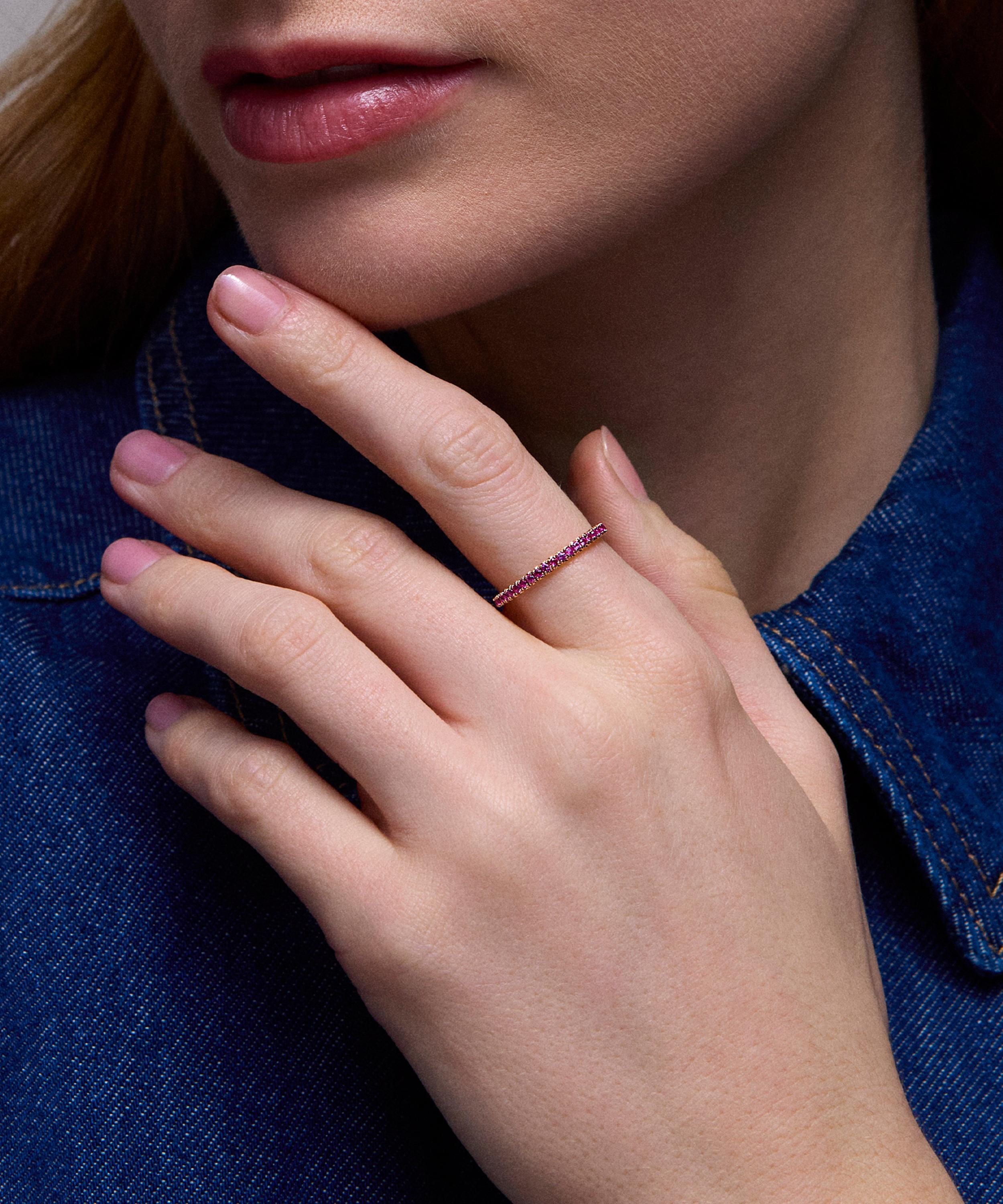 Redefining timeless jewellery with a contemporary twist, it features a 9ct gold eternity band lined with fishtail-set rubellite tourmaline. Boasting a unique token of commemoration, it’s designed for effortless layering – try stacking it with the other colourful Minnow rings for a kaleidoscopic curation.