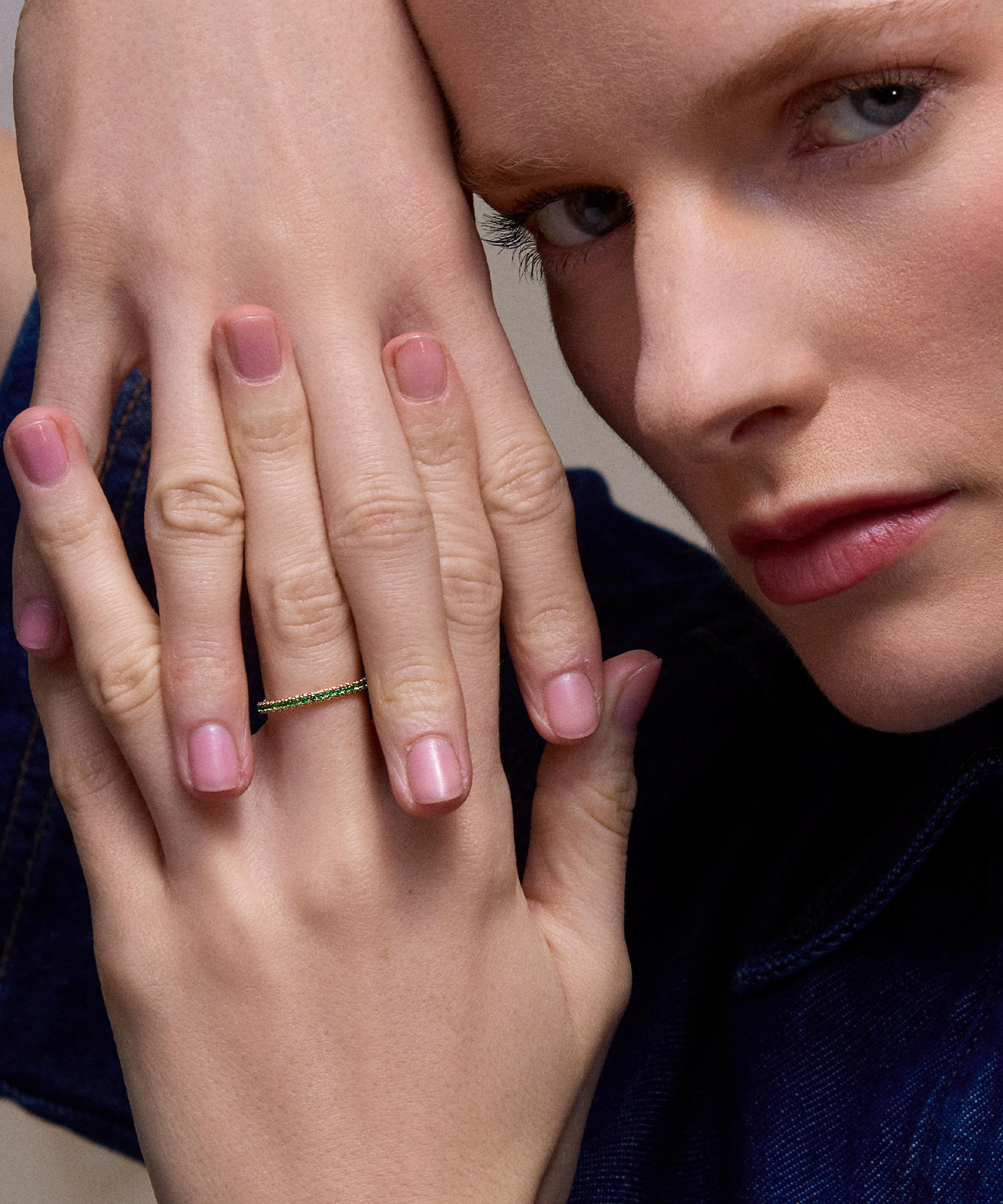 Redefining timeless jewellery with a contemporary twist, it features a 9ct gold eternity band lined with fishtail-set tsavorite garnet. Boasting a unique token of commemoration, it’s designed for effortless layering – try stacking it with the other colourful Minnow rings for a kaleidoscopic curation.