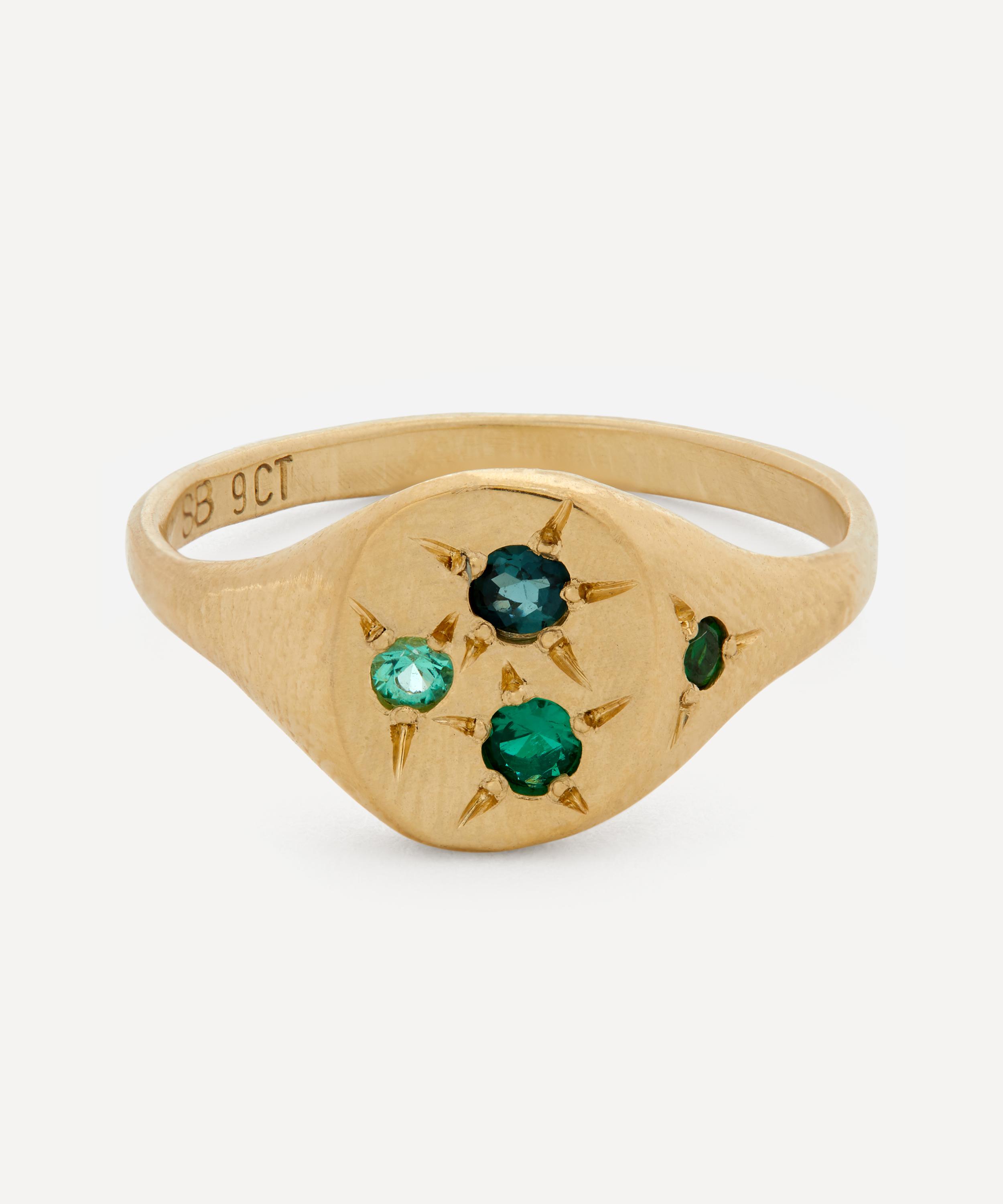 Showcasing the designer's distinctive, roughly refined aesthetic, this Neapolitan ring is a green-tone version of Seb Brown's signature multi-stone signet ring.