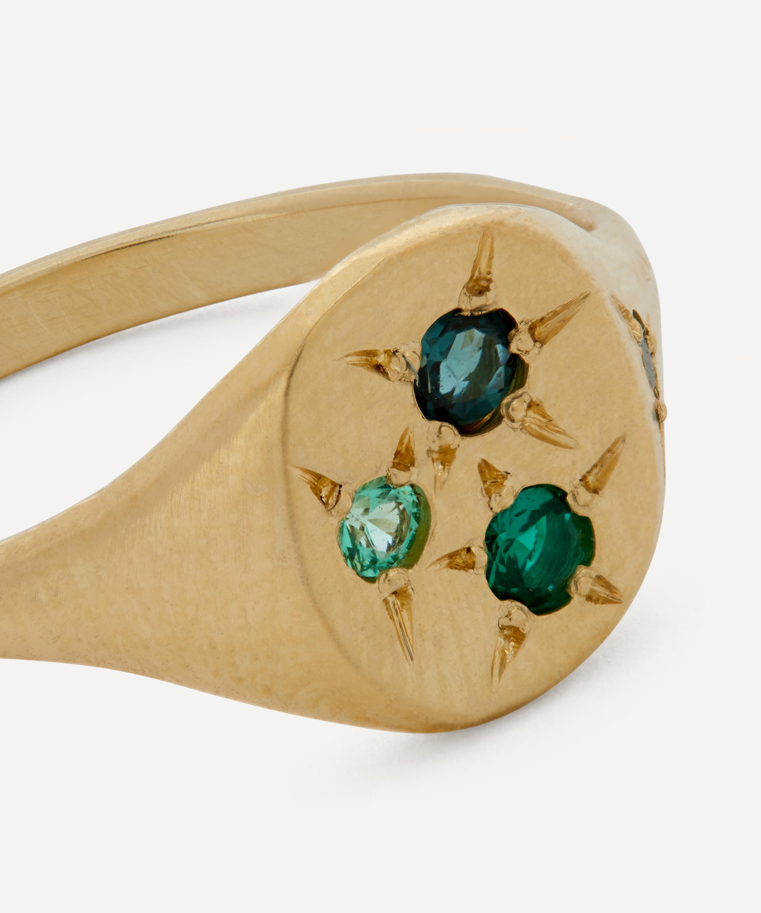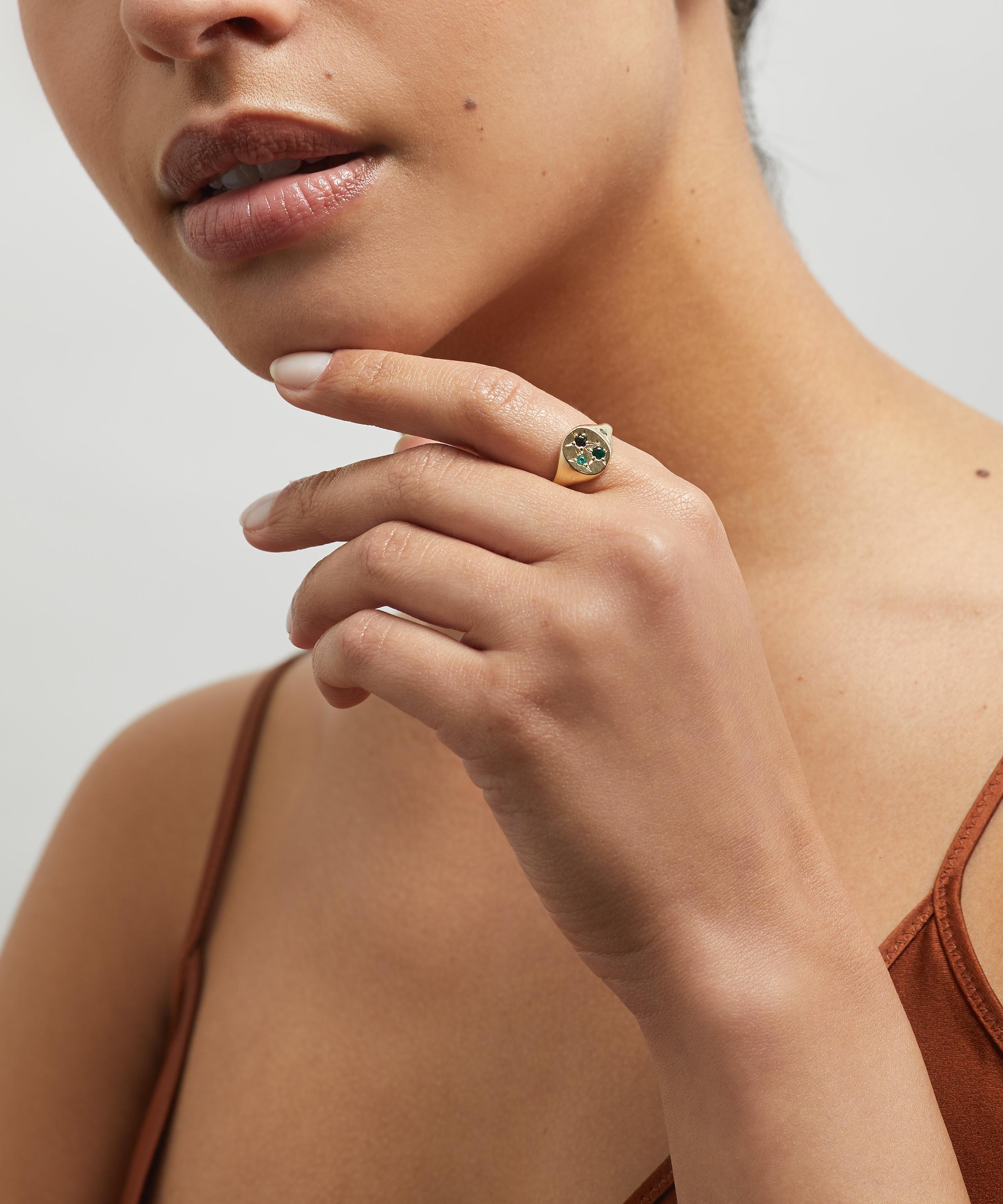 Handmade in Melbourne from solid 9 carat gold, this small, round signet ring is cast with contrasting tourmaline, hydrothermal emerald and tsavorite garnet stones for a richly coloured sparkle that changes in different lights. The designer’s experimental design process means every piece is unique - often varying in colour, shape and texture for an organic finish that's perfect for injecting a burst of individuality into your everyday jewellery line-up.