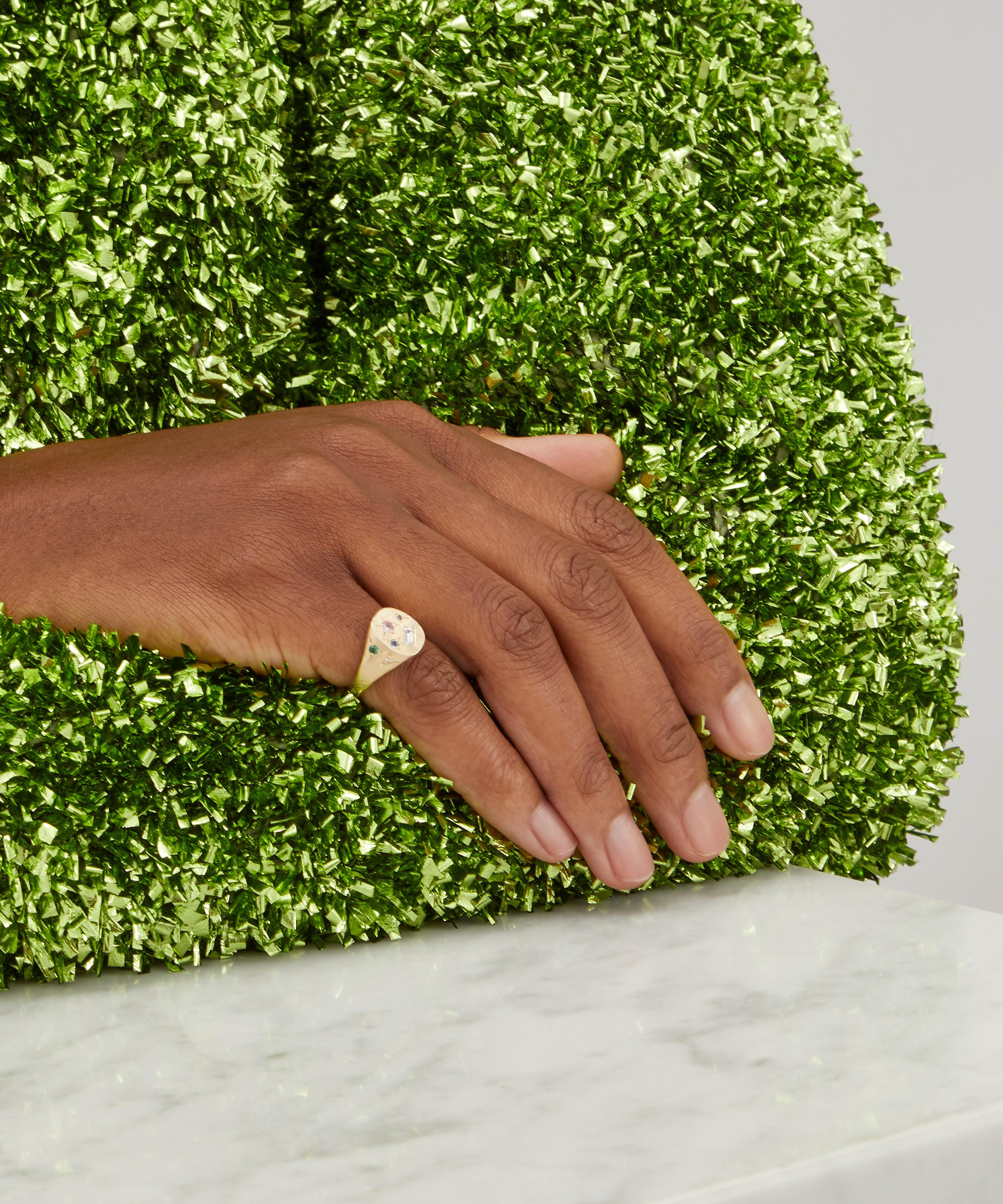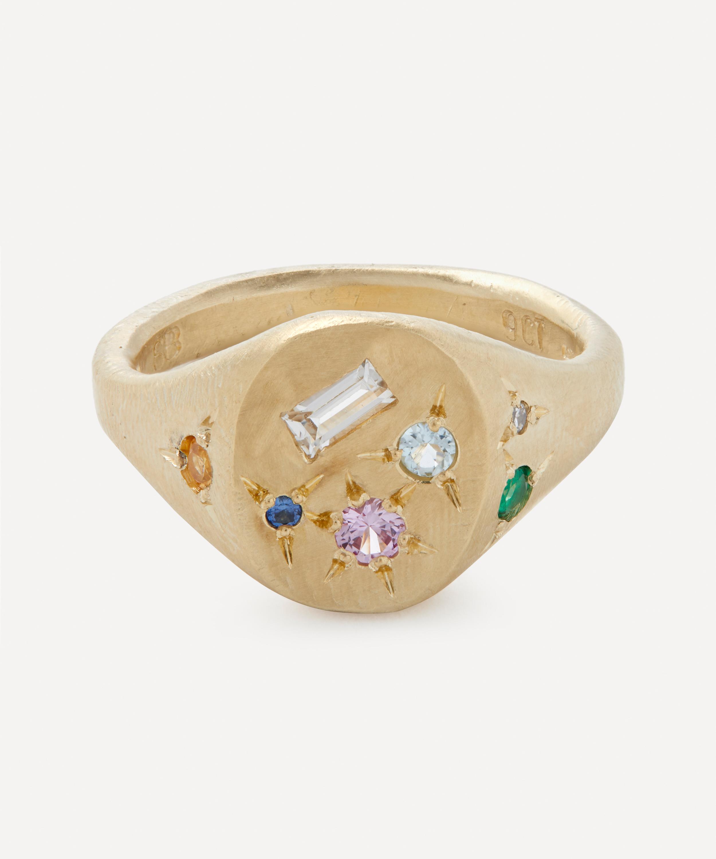 Handmade in Melbourne from solid 9 carat gold, this round signet ring is cast with seven mixed-cut emerald, diamond, aquamarine and multi-coloured sapphire stones for a soft, pastel-toned sparkle that changes under different lights.