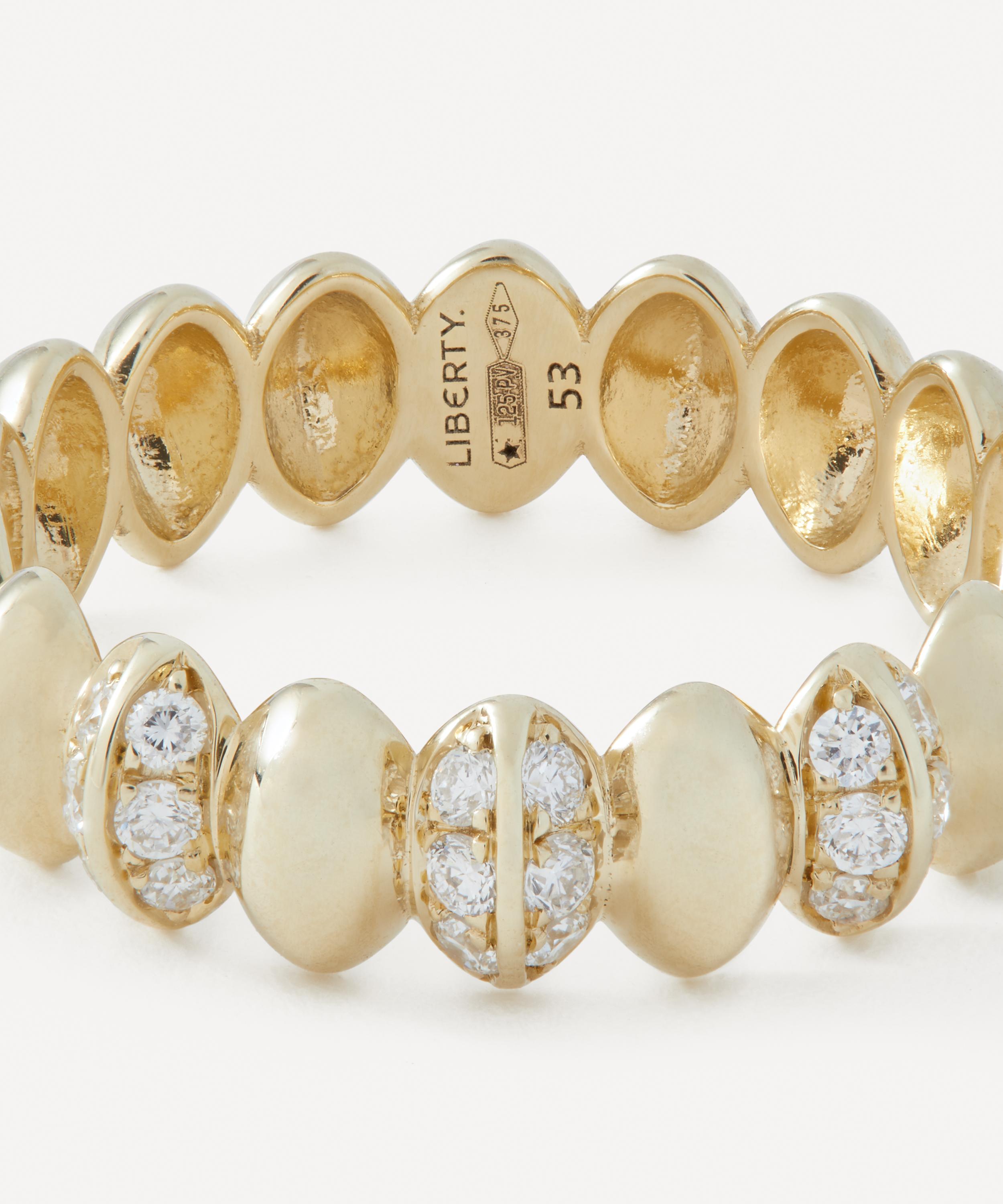 Handcrafted in Italy from solid 9ct gold, its softly rounded silhouette is shaped to echo the smooth, naturally worn beauty of pebbles. The tactile surface reflects light with a gentle radiance, celebrating understated design and timeless appeal. Available in plain gold for a refined finish or adorned with semi-pavé diamonds for a subtle touch of brilliance, the ring balances fluidity with contemporary craftmanship. Wear alone for a considered statement or pair with the matching pieces from the collection to create a harmonious, layered look grounded in quiet strength and serenity.