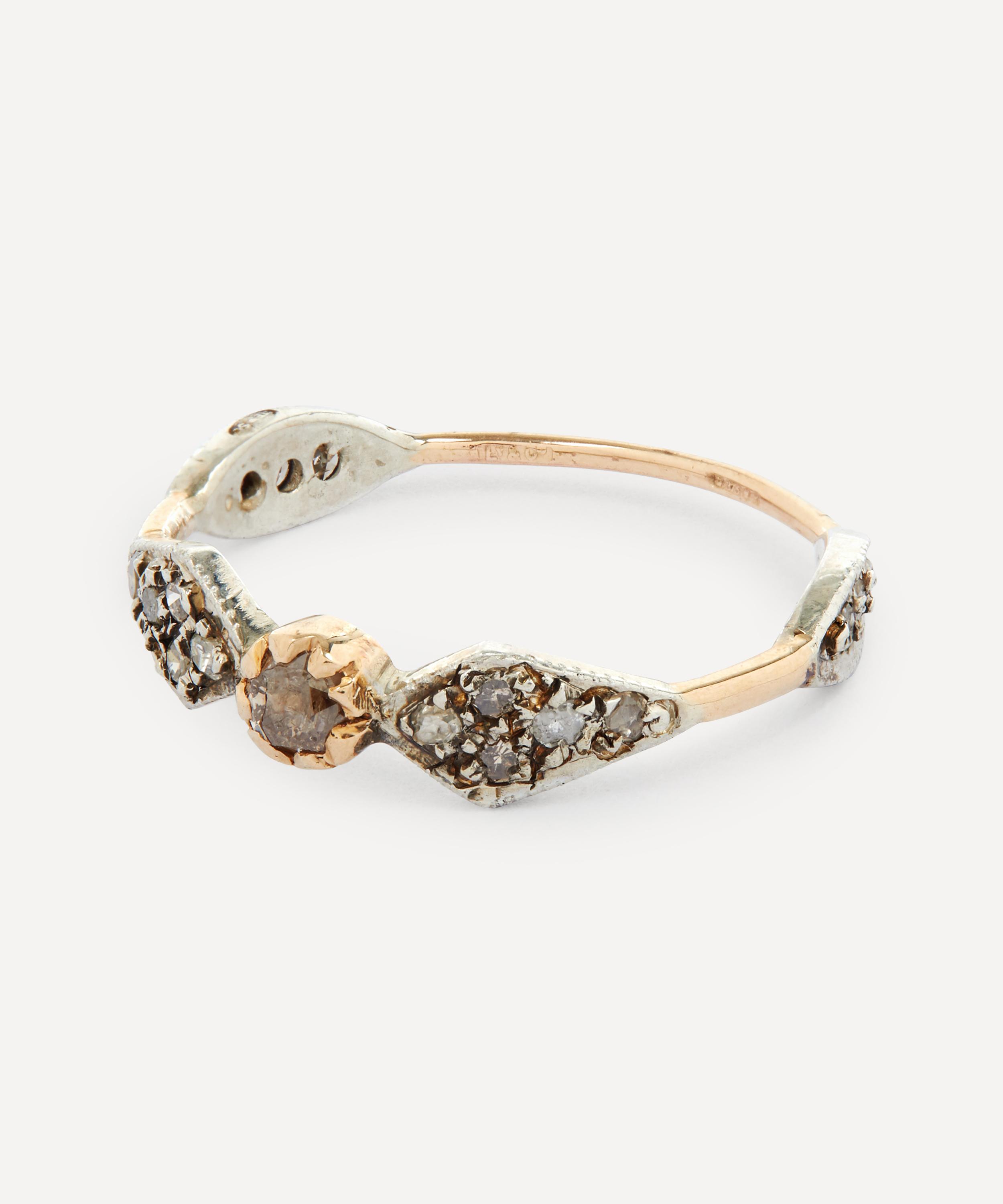 Handcrafted from 9ct gold-plated silver, this desirable ring features a brown diamond centre stone, welded into a slightly melted gold setting. The designer’s appreciation for natural imperfection is clear in the sparkling diamond pave’ that is encrusted into abstract silver settings along the slim band. Wear this precious, personal talisman alone for a statement appeal, or stack yours with other organically-inspired bands from the designer’s extensive collections.