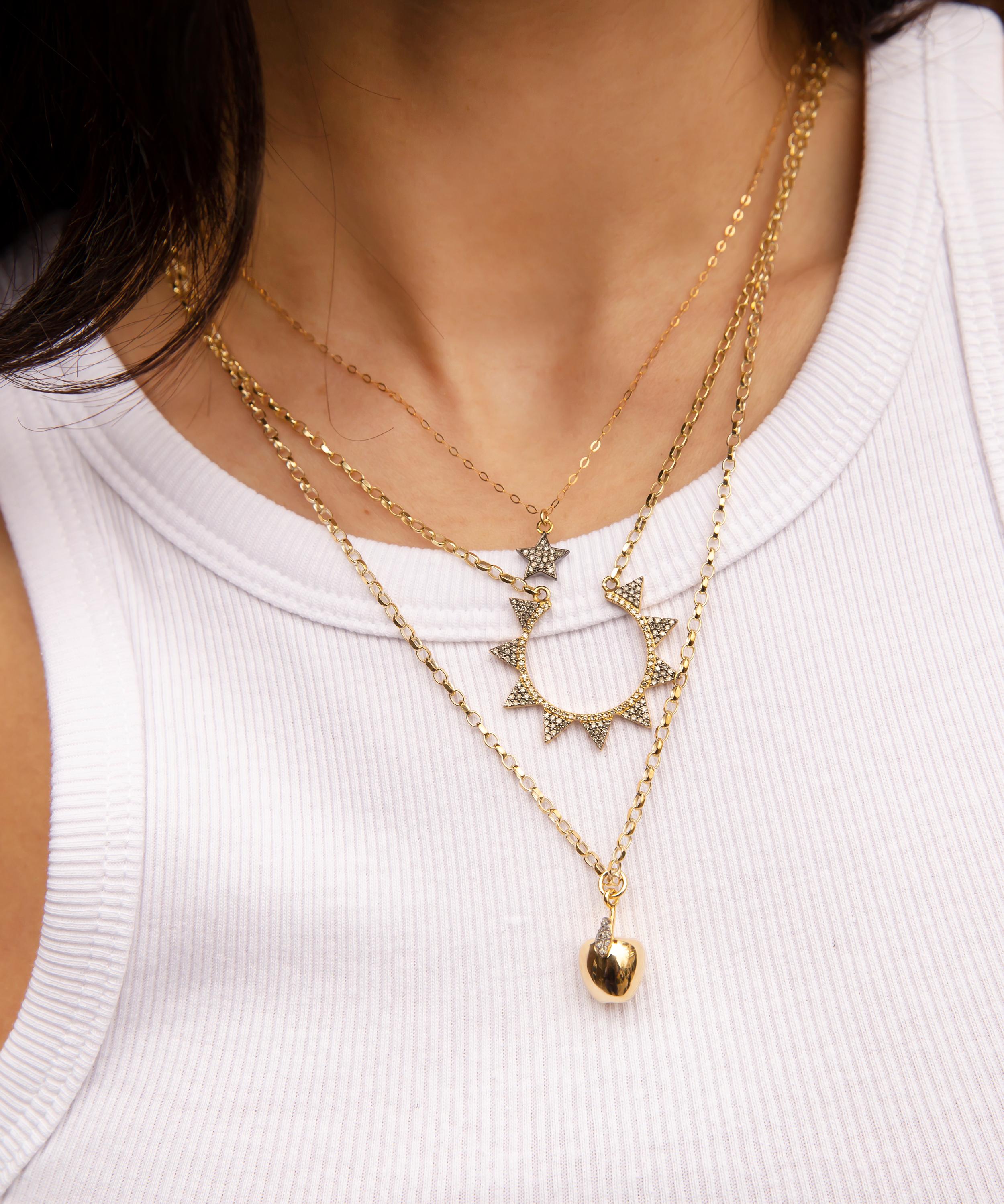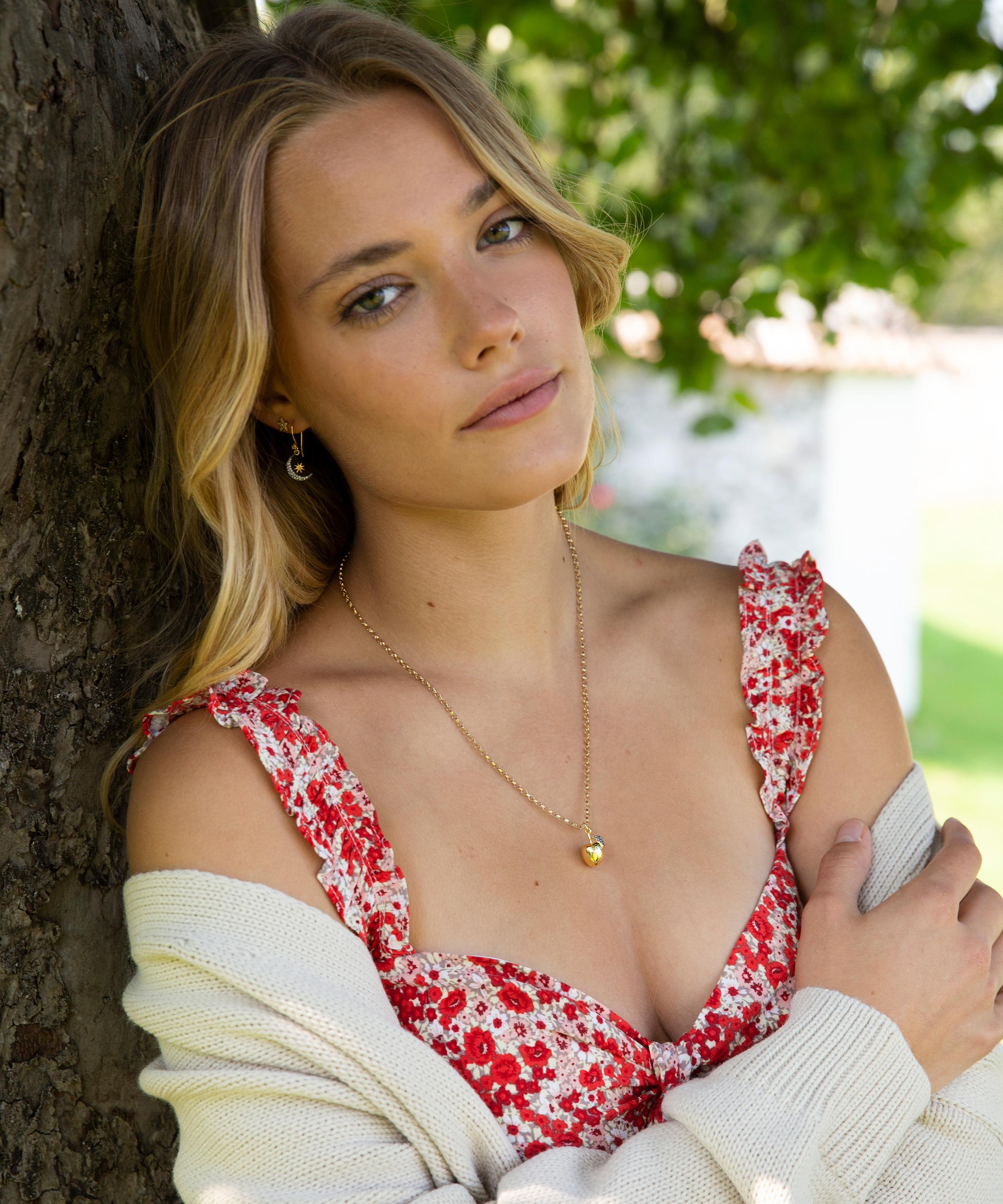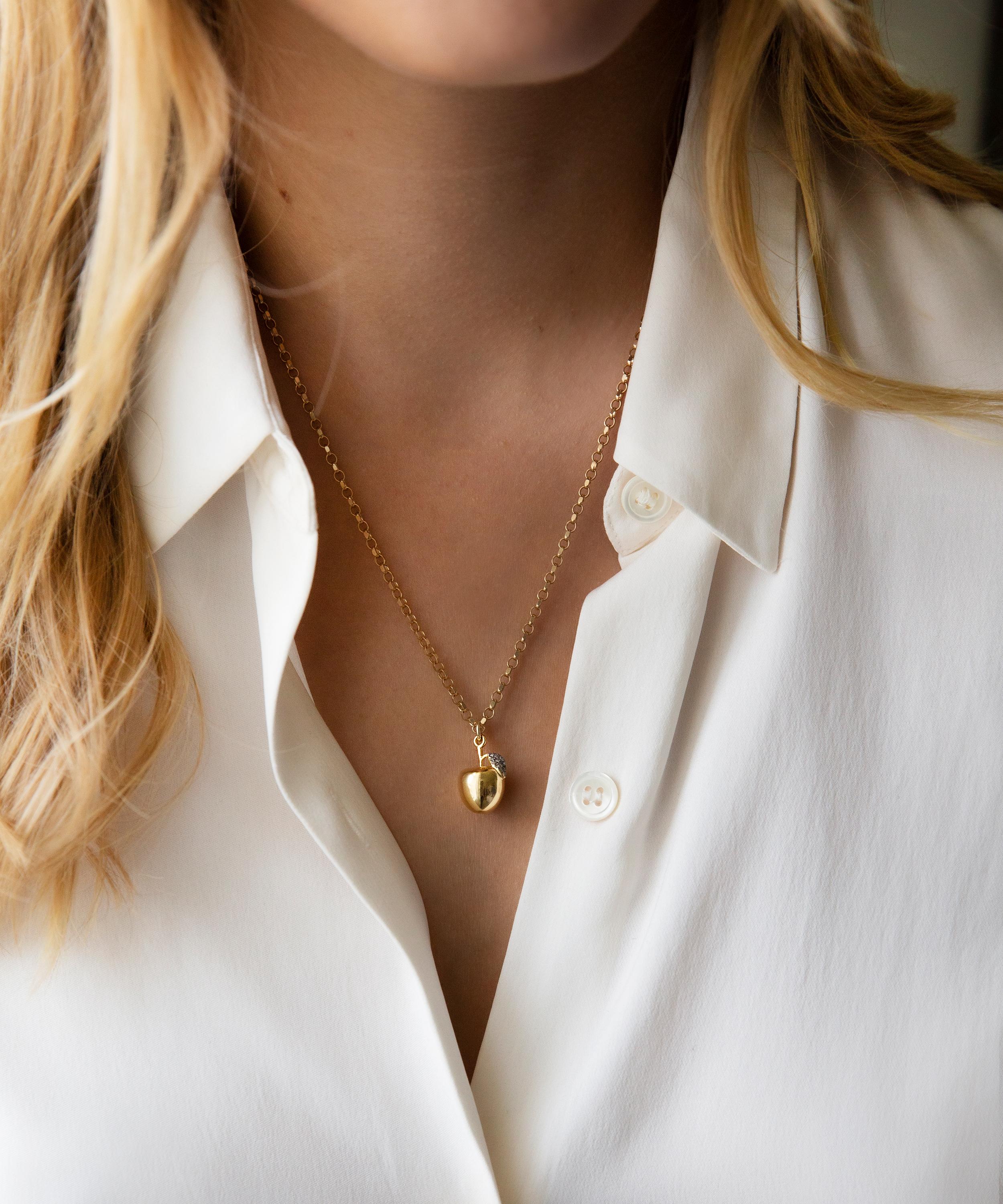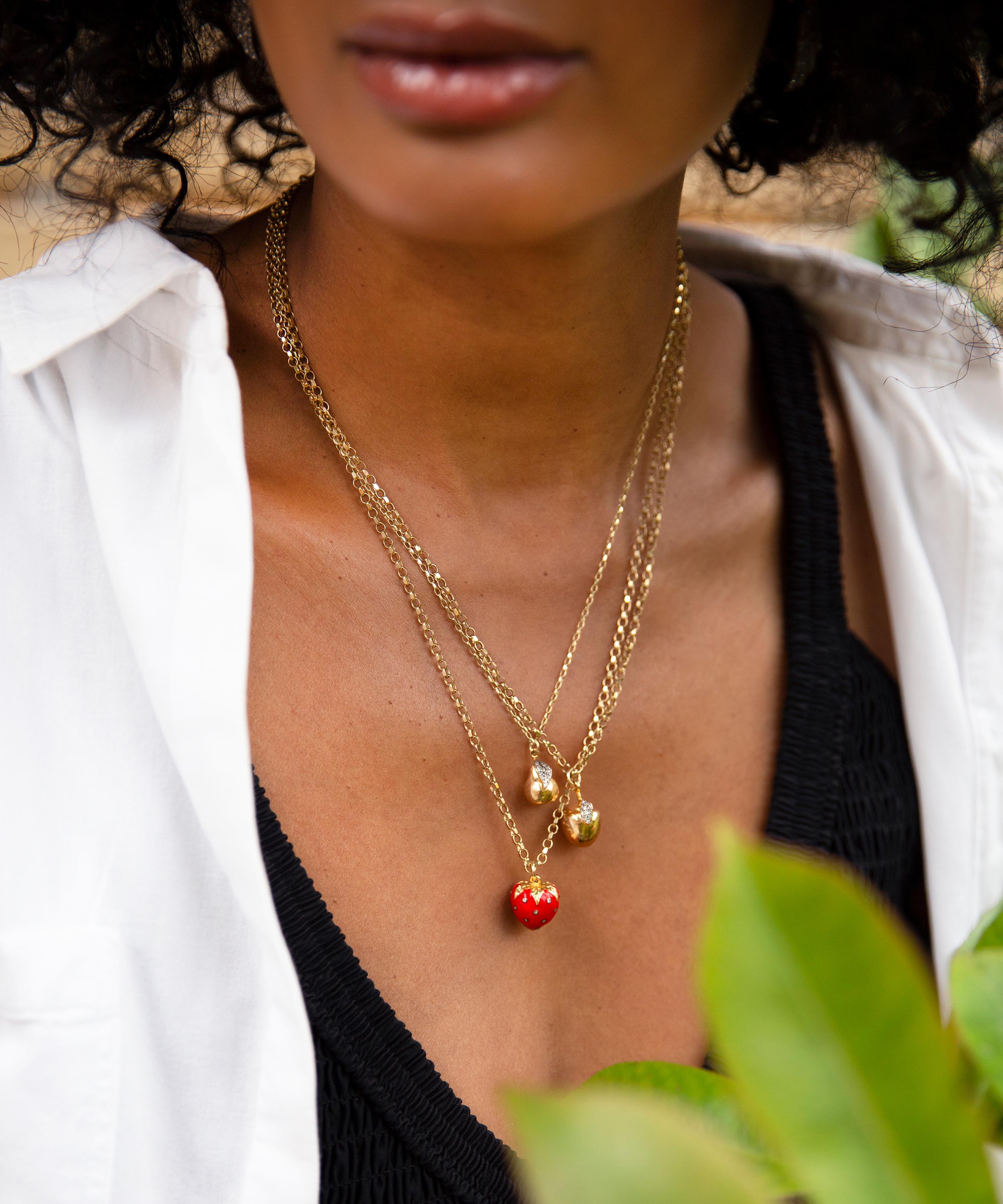 A stand-out addition to your jewellery line-up, this delicious necklace is characterised by a golden apple charm, adorned with a diamond pave’ leaf – showcasing the brand’s signature sparkle. Lending a playful twist to fine jewellery, the juicy fruit hangs from a 9ct gold-plated belcher chain, ideal for mixing and matching. Wear this piece alone for a sweet touch, or layer it with the brand’s additional chains.