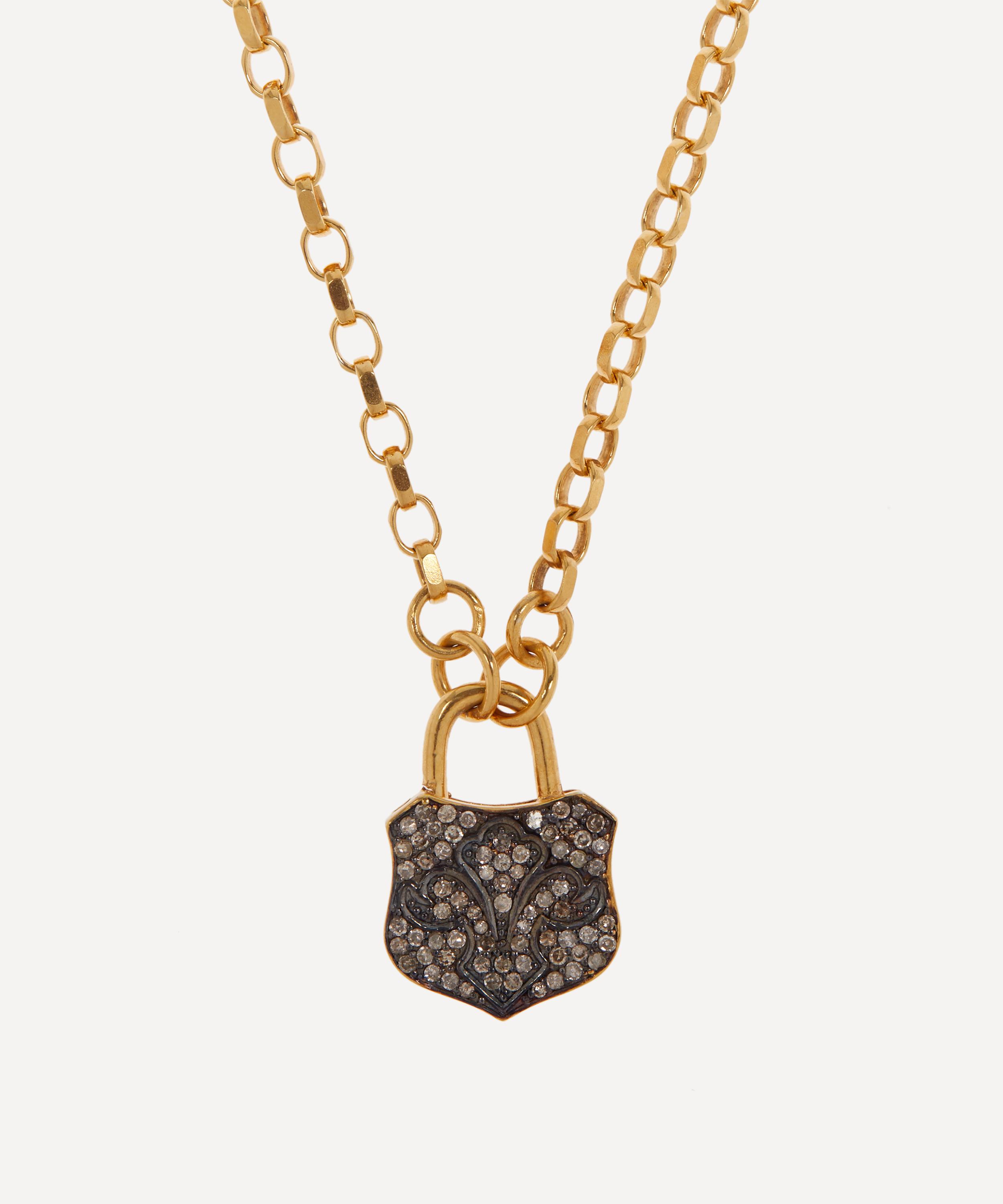 Kirstie Le Marque’s Diamond Chunky lock pendant necklace perfectly encapsulates the brand’s contemporary take on vintage bling. p>