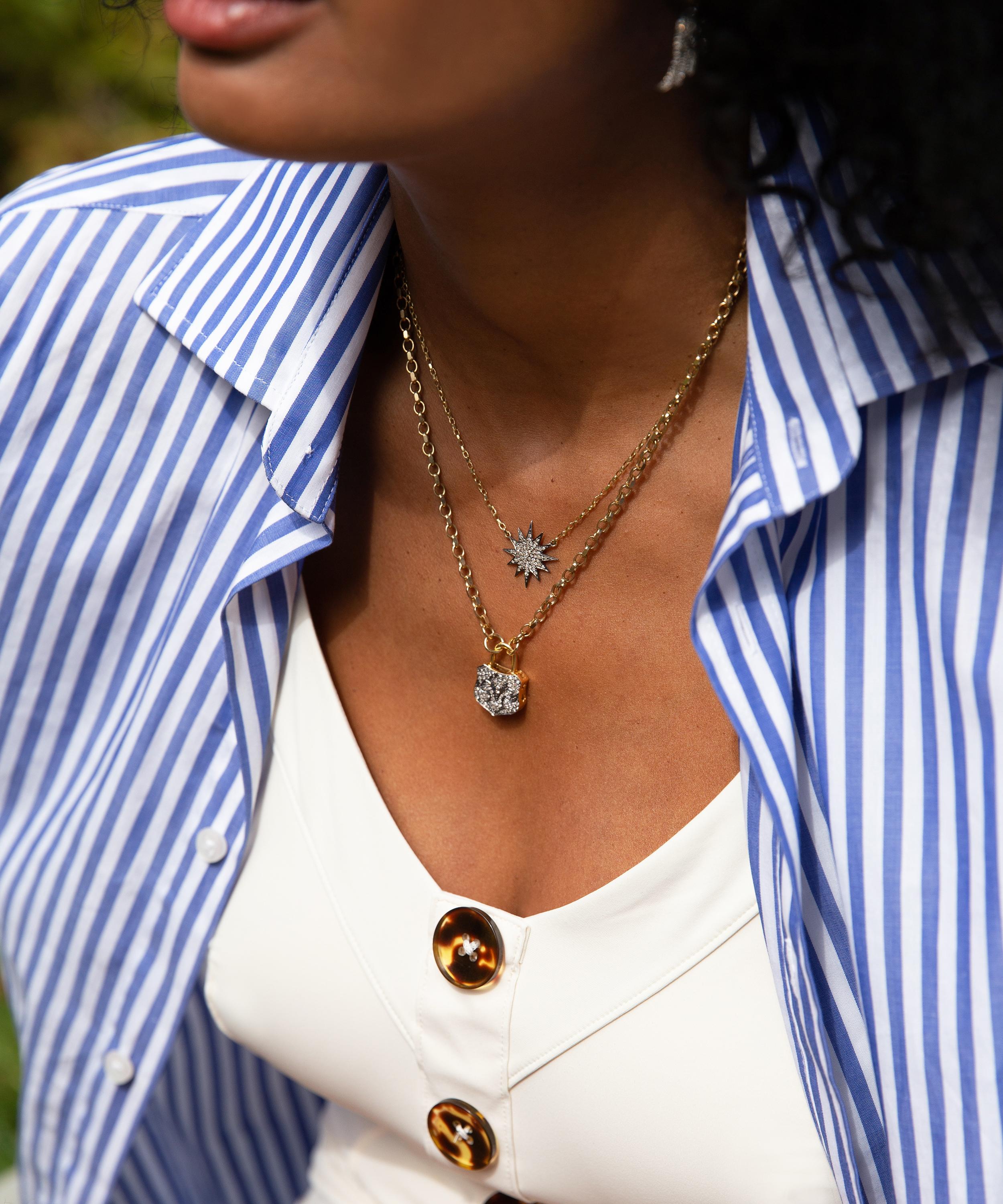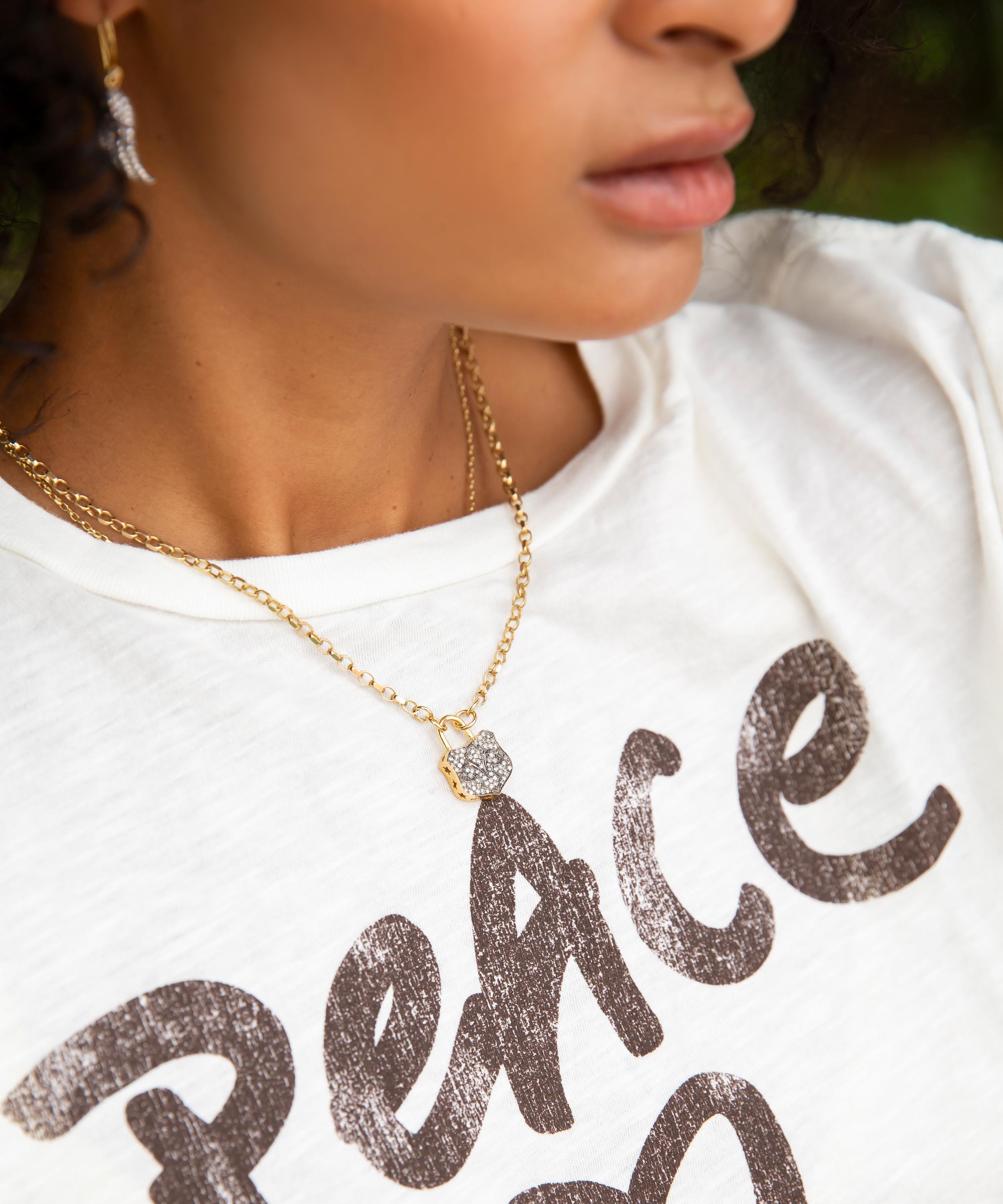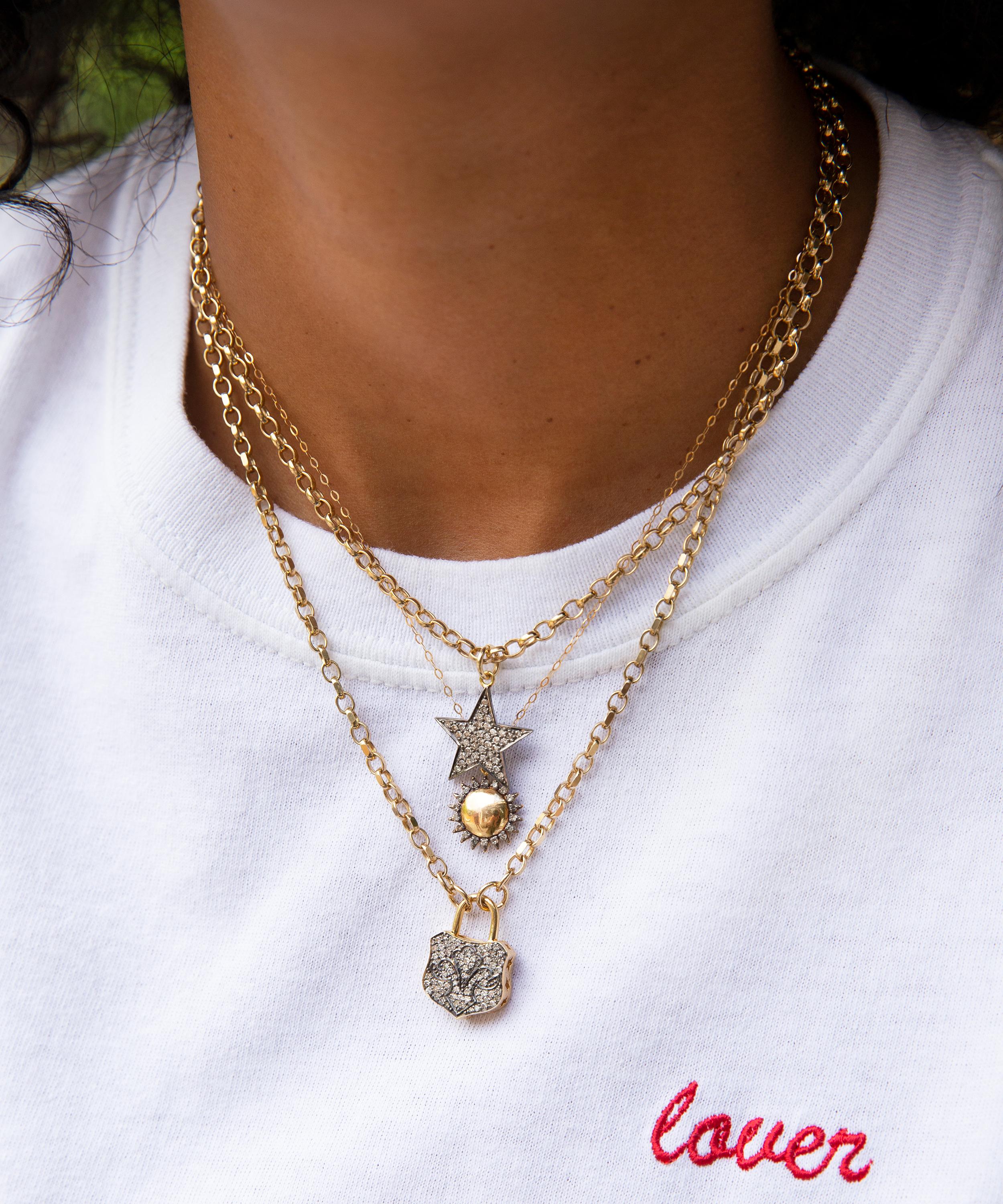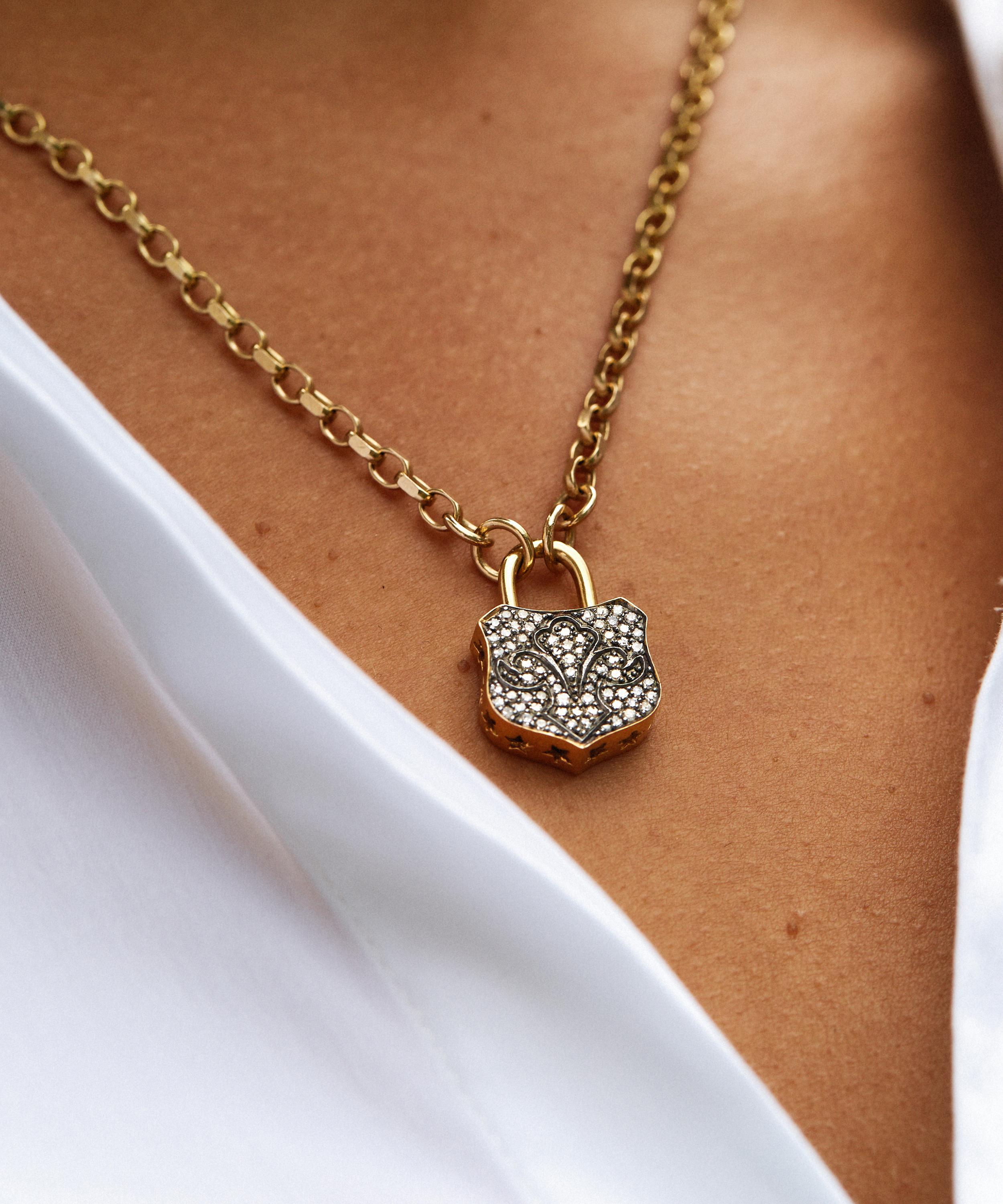 Interlacing edgy style with a soft femininity, this statement necklace features a chunky lock pendant adorned with a sparkling diamond pave’ atop a plate of sterling silver. The gorgeous charm showcases a subtly embossed crest in the centre, accompanied by hollow, cut-out stars along a gold-plated edge, leading to two large rings at the front that fastens on a classic belcher chain. Decorate your decolletage with this irridecent jewel and elevate your everyday attire in seconds.