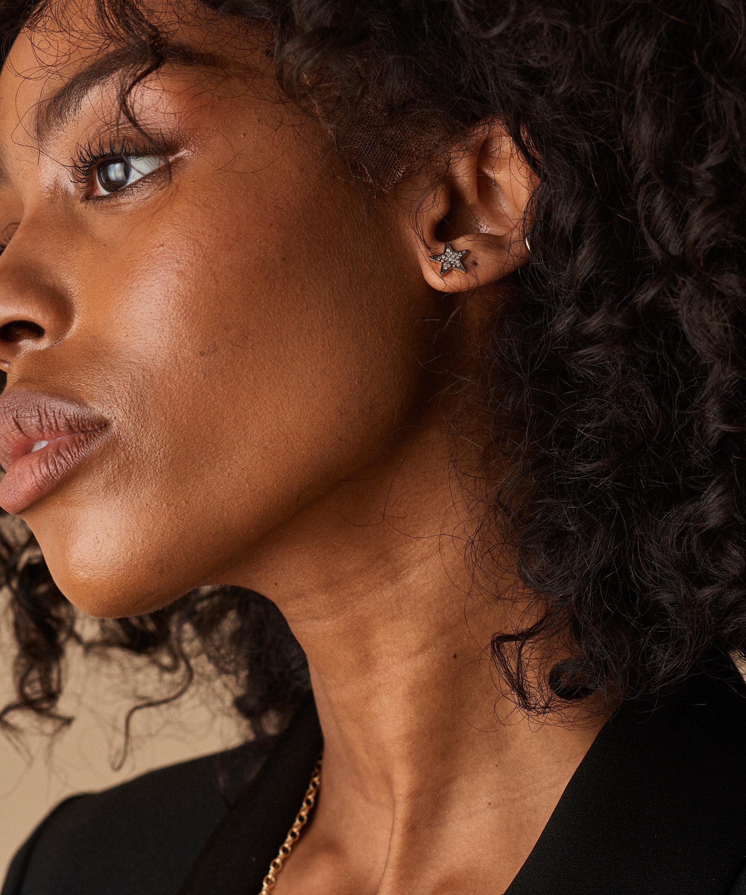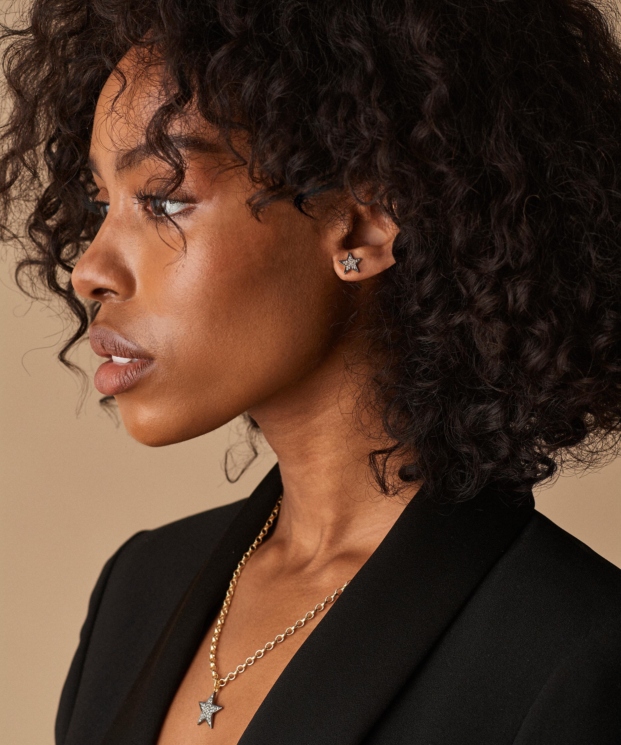 Interlacing edgy style with a soft femininity, these statement earrings feature a chunky star shape, covered in a beautiful diamond pave’ setting at the front, accompanying a 9ct gold-plate at the back – forging a cool mix-metal edge. Wear them on their own or team up with any of the matching Diamond Chunky Star necklaces for a truly ethereal glow.