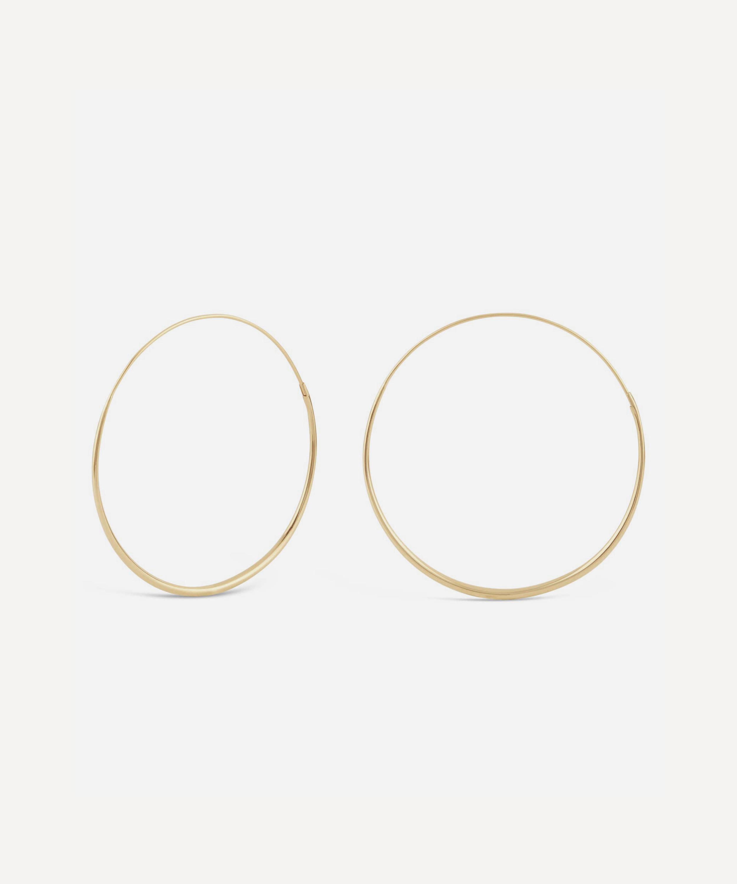 Designed with comfort and minimalism in mind, the Queenie hoop earrings are Dinny Hall's largest hoop to date. Handcrafted from high-polished 9 carat gold, this sleek pair will slot seamlessly into your existing jewellery collection for both day and night dressing. Wear them alone or styled with an assortment of other hoops in varying sizes for understated, contemporary appeal.