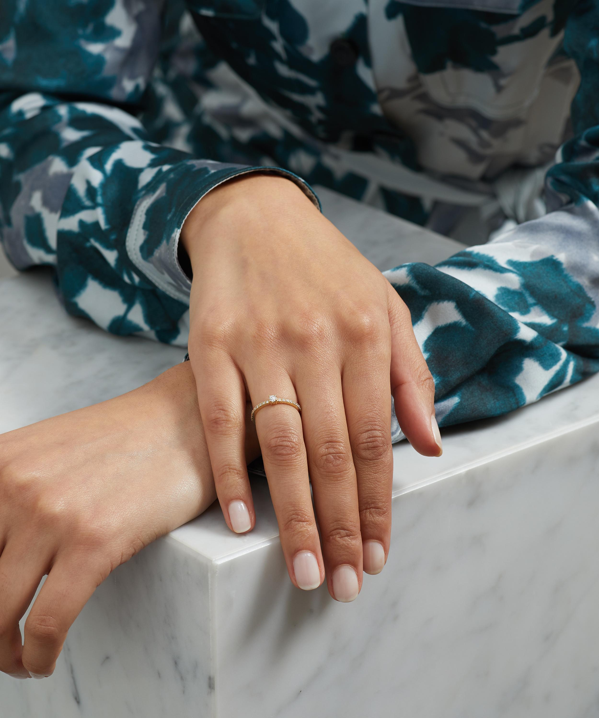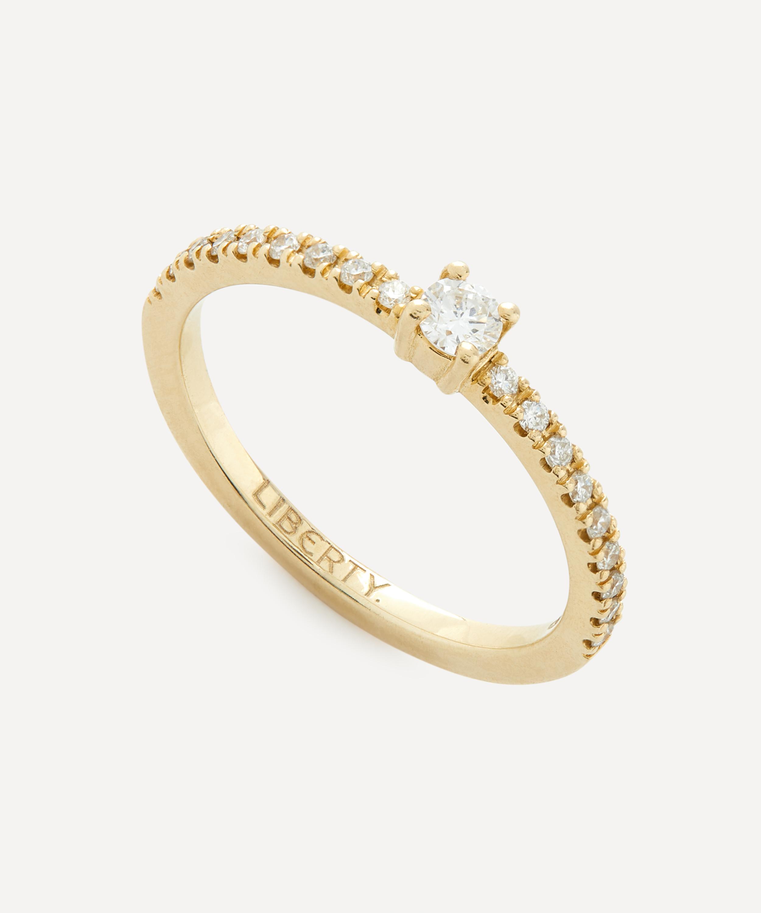 Encrusted with lab-grown diamonds around the band, this beautiful ring features a round, brilliant cut diamond that takes centre stage, accented by a high-polished finish and engraved Liberty logo on the inside band. Each ring is made in a small batch and is perfect as an engagement option, wedding band or anniversary gift.