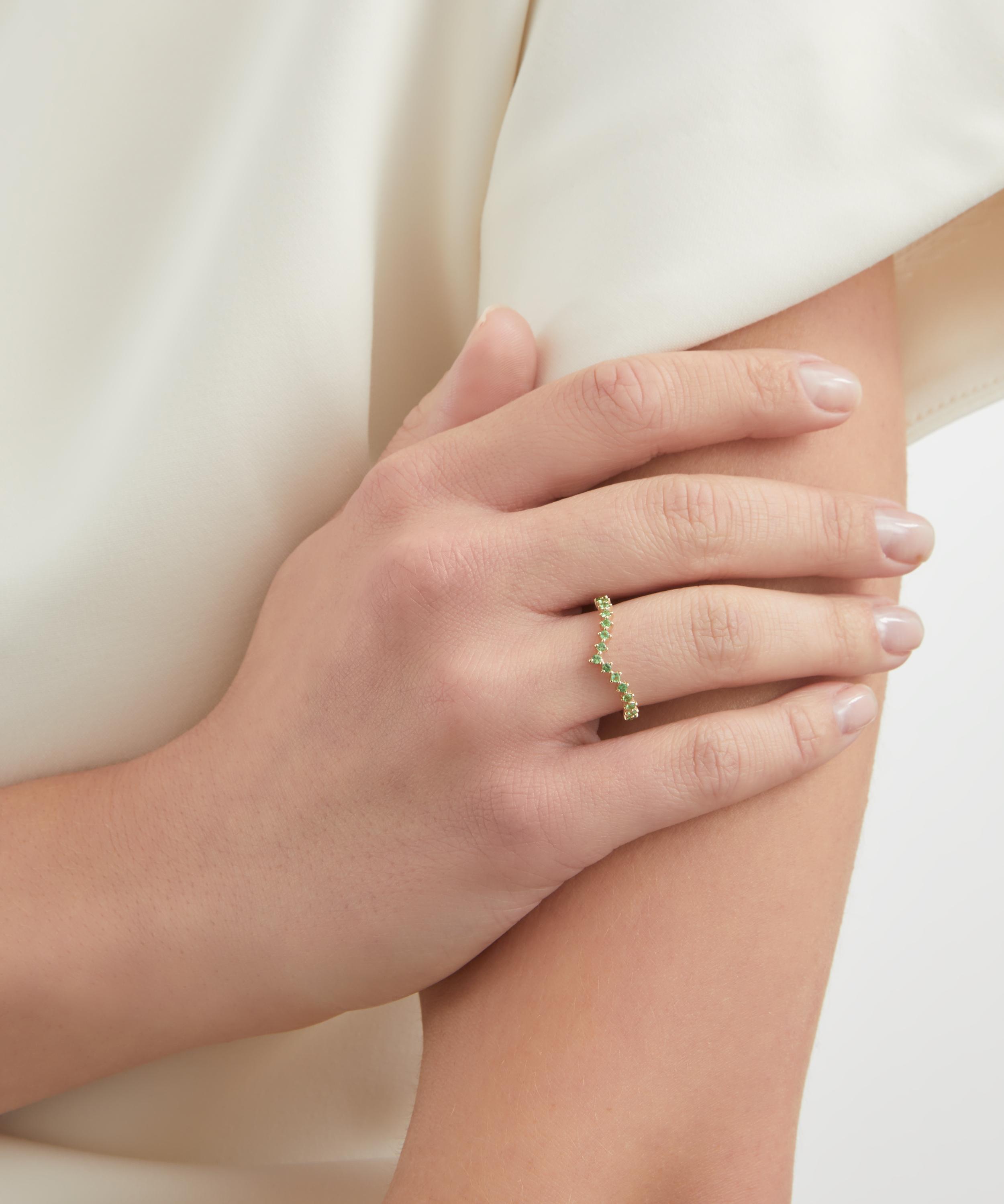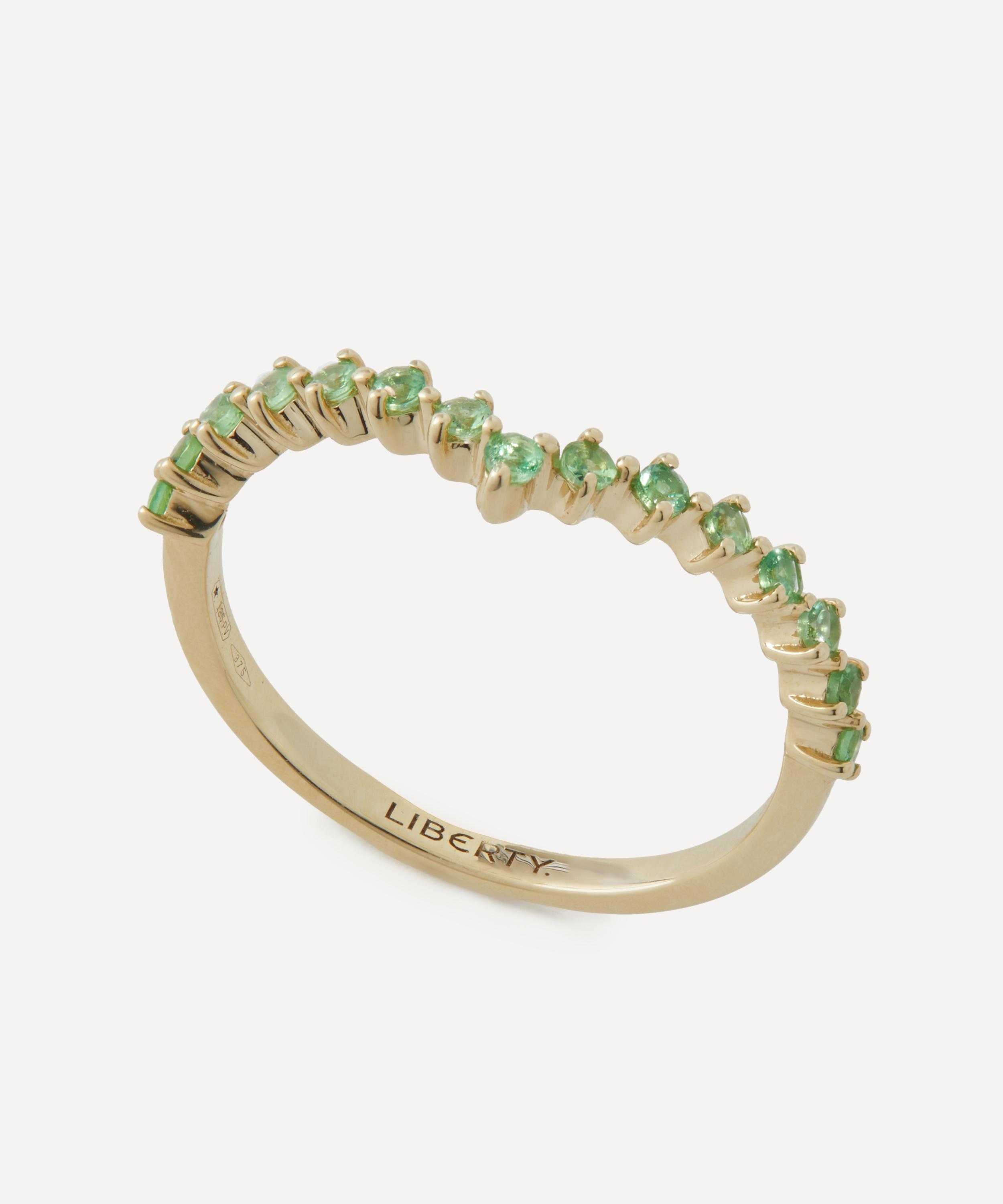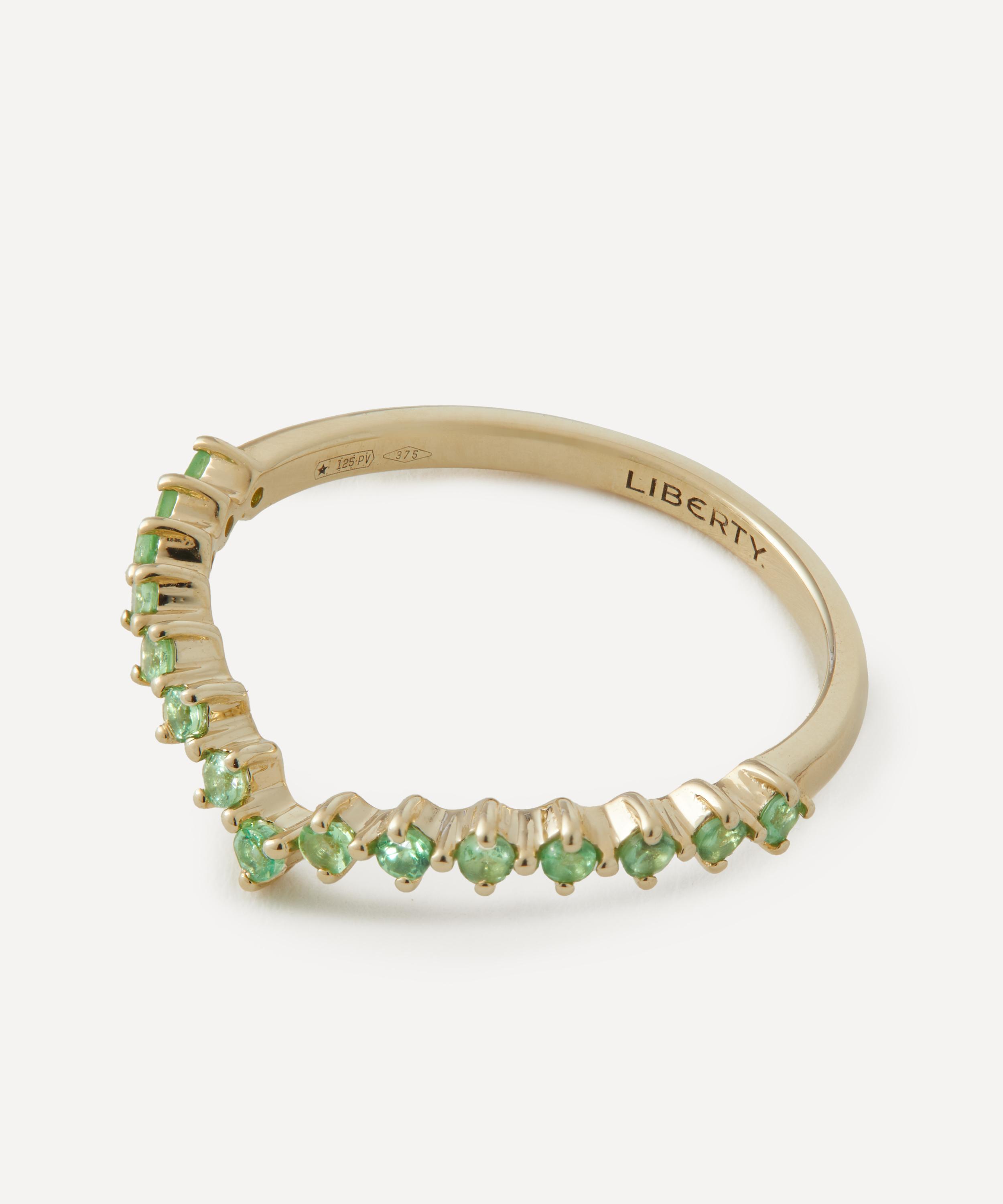 Exquisitely crafted from solid 9ct gold, it features a linear, V-shaped silhouette, set with green tsavorites that creates a seamless flow of colour. Offering an endless array of styling options, this modern heirloom pays tribute to Liberty’s collector spirit - it can be worn alone as an understated addition to your everyday line-up or stacked with your chosen Liberty rings for a fully personalised curation.