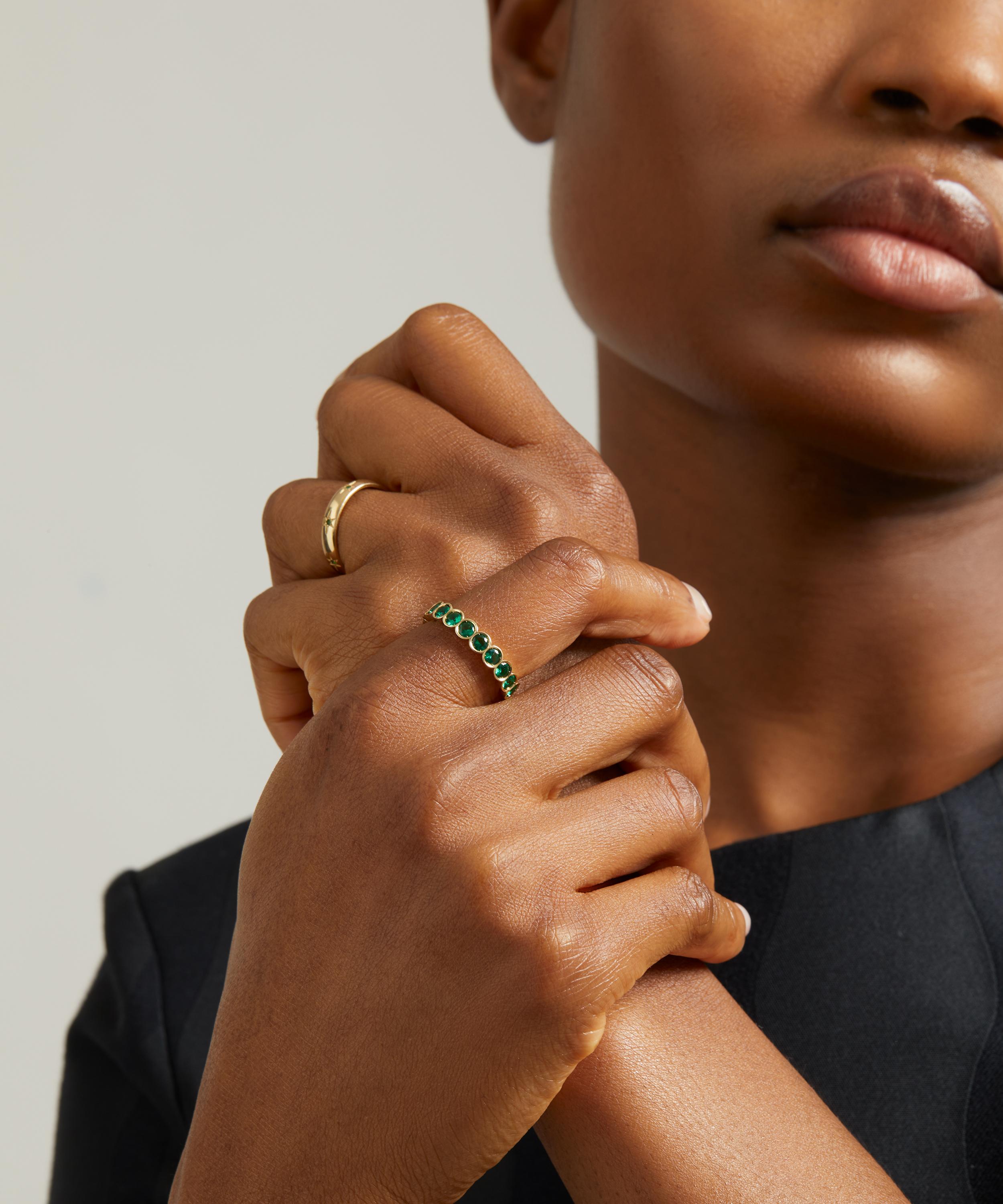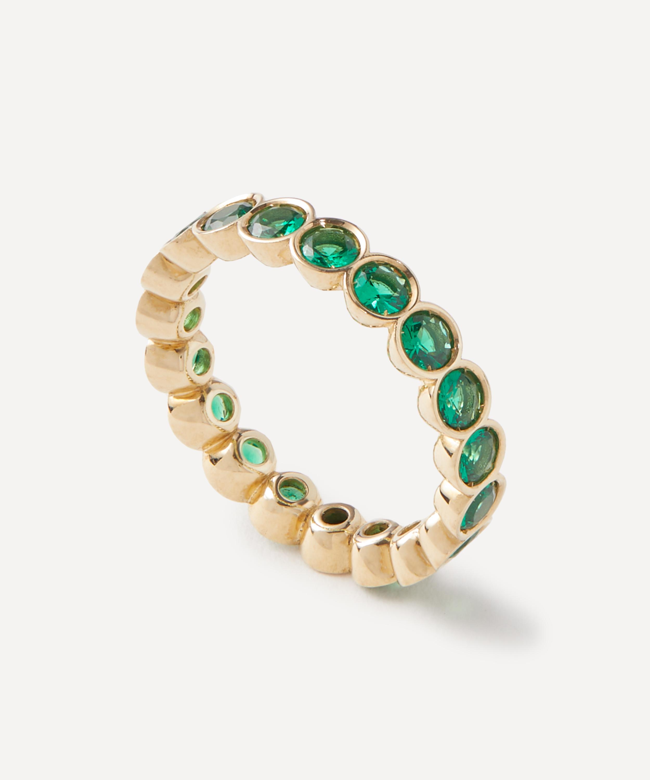 Lean into mood boosting summer colours with Liberty’s Riviere ring. Crafted from 9ct gold, this refined yet joyful design takes its inspiration from a 60s fabric in the Liberty archive, featuring a slim, polished band lined with vivid tsavorite stones. Wear yours solo, or stack multiple rings together for a truly kaleidoscope curation.