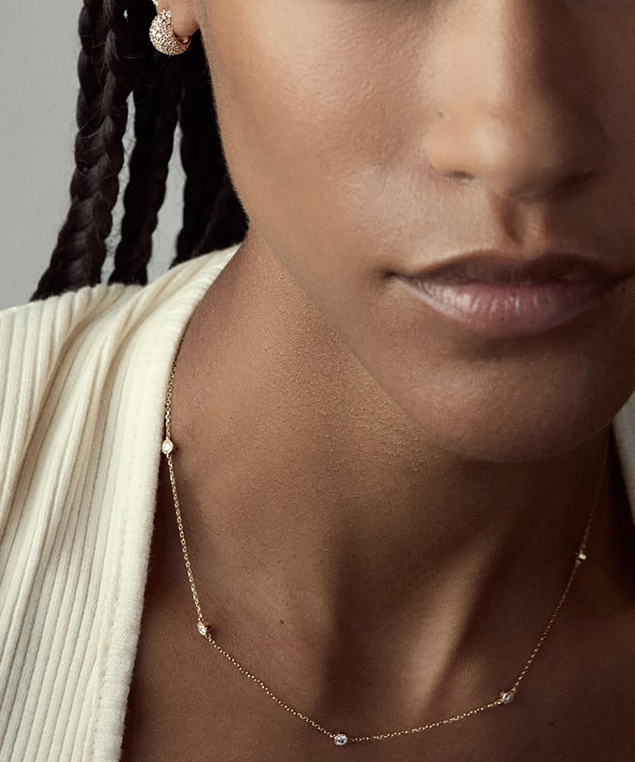 Presented on a 9ct gold faceted trace chain, this understated necklace is dotted with five dainty, radiant lab created diamond charms – catching the light from every angle. Designed to slot seamlessly into your everyday jewellery line-up, style solo, or pair with matching stud earrings for an effortlessly elegant curation that's perfect for both day and night dressing.