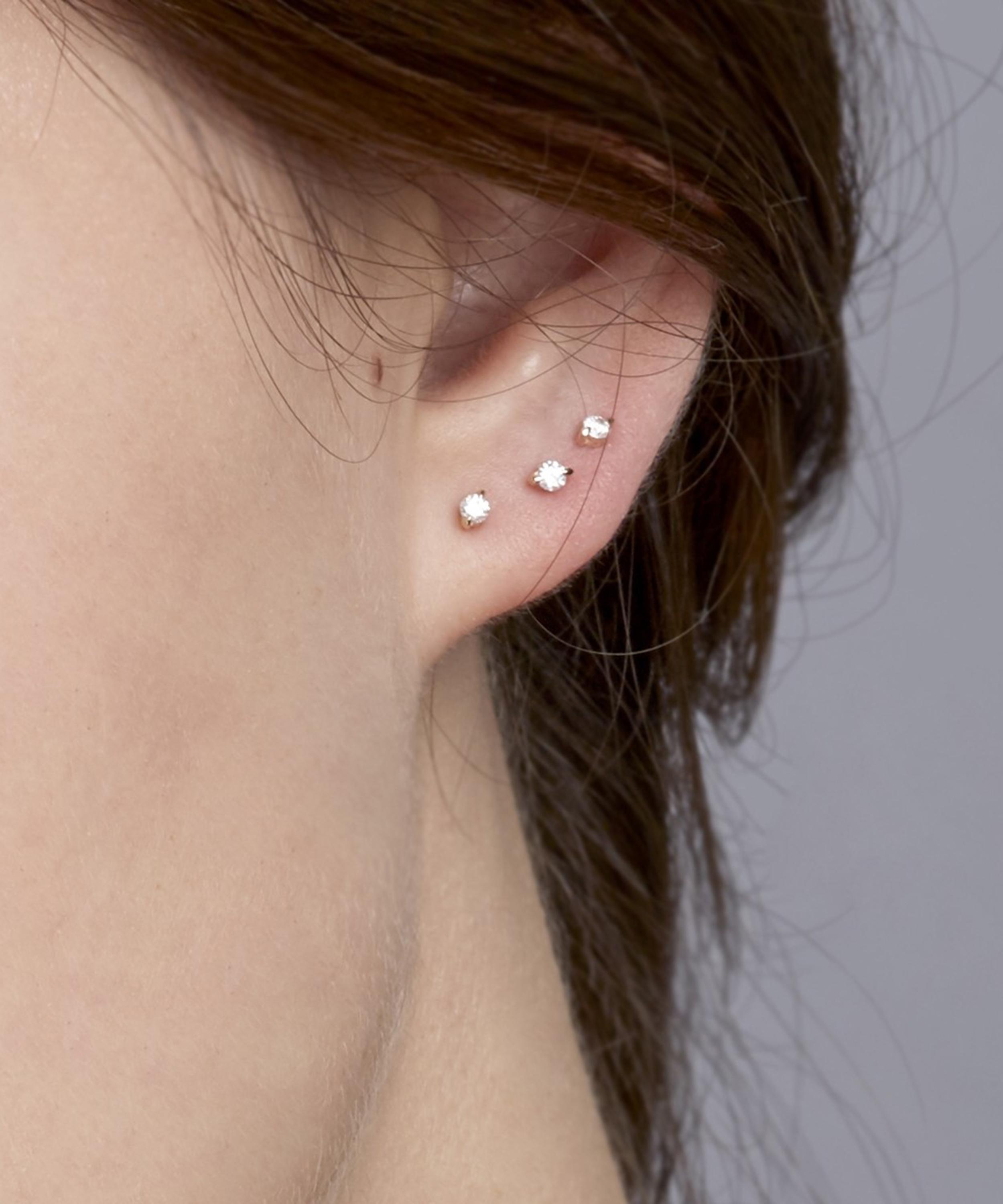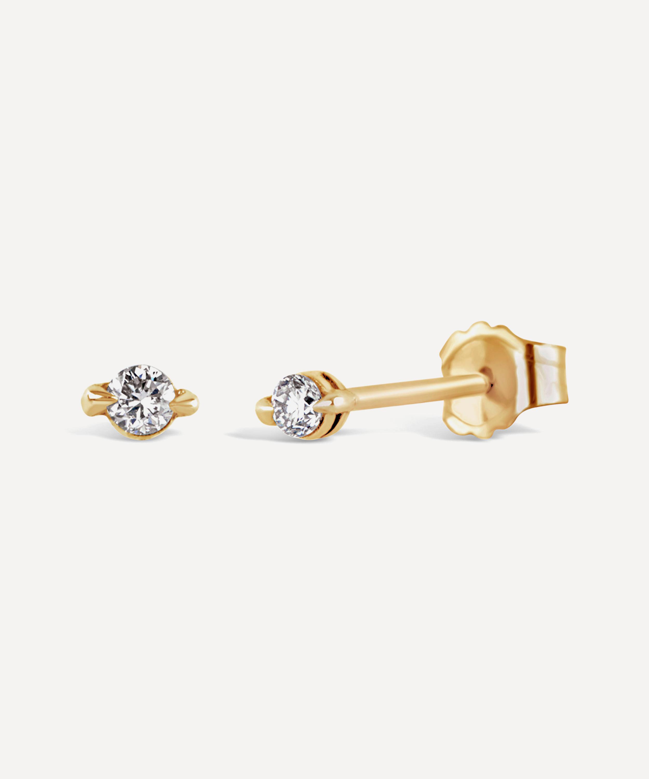 Originally inspired by the colourful jewelled costumes worn by traditional Sri Lankan dancers, Dinny Hall's Shuga collection has been stripped right back for an understated, contemporary approach. Crafted from solid 9 carat gold, each of these dainty stud earrings features a single brilliant cut white diamond in a delicate two-prong setting. Style them alone or incorporate them into a twinkling curation of single diamond studs for a dazzling dewdrop effect.