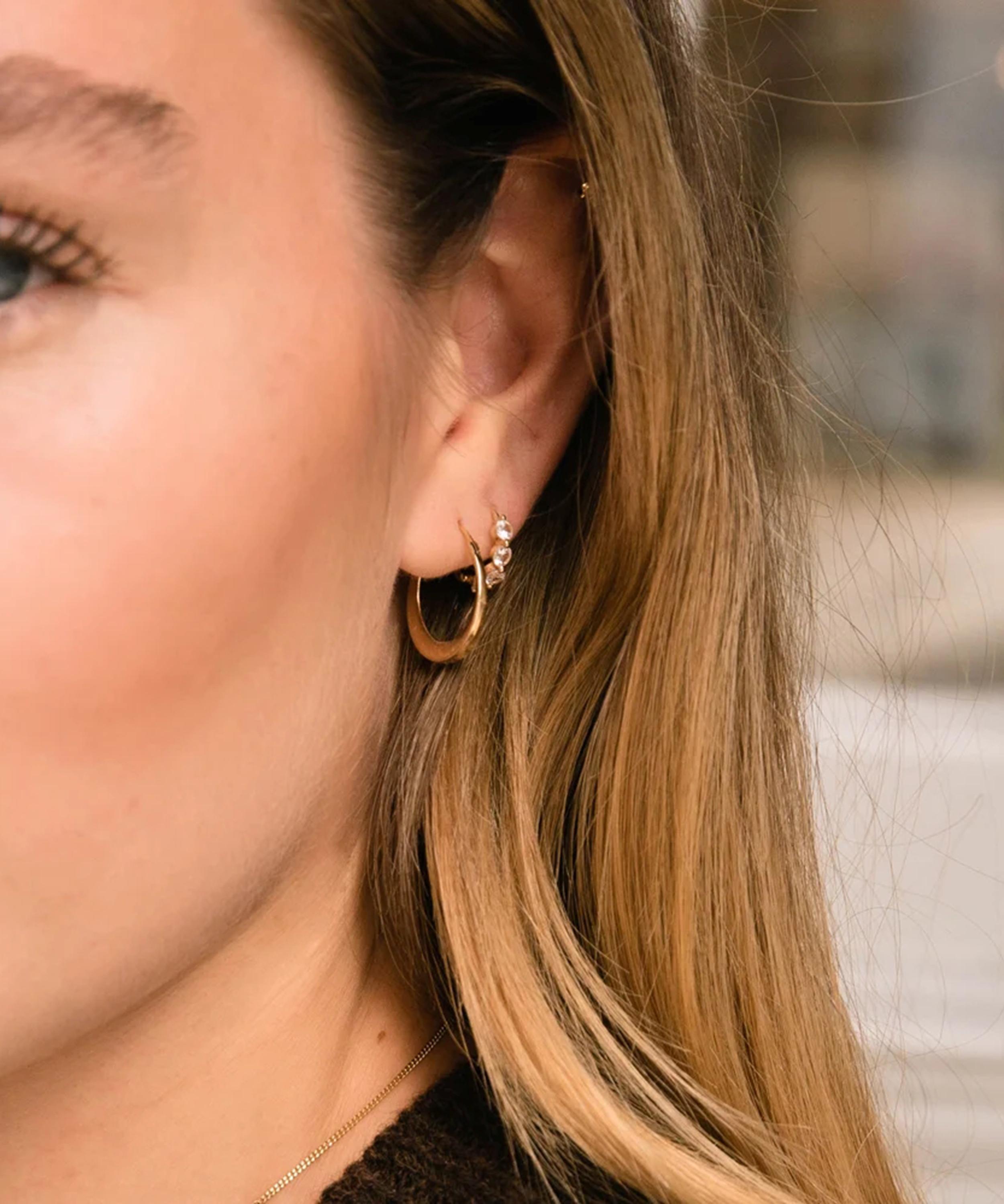 Part of the Signature collection, each earring is rendered in solid 9ct gold, featuring a small hoop, sculpted into a slim, tapering silhouette for a minimal but impactful design. Ultra-comfortable and exuding plenty of statement appeal, wear yours solo or pair with studs and smaller hoops to build a curated stack.
