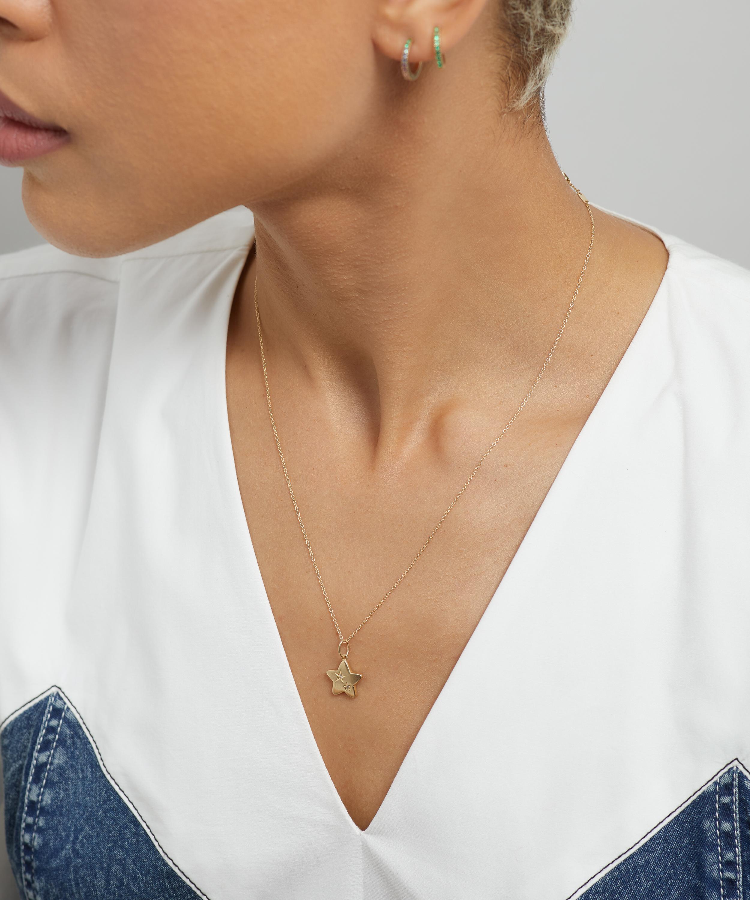 Perfect for gifting, spread the love and treat someone you care about, or yourself, to this large pendant charm from Liberty. Offering endless styling options, this pendant is crafted from 9ct solid gold, featuring a star-shaped charm adorned with two star-set, brilliant cut diamonds. Complete with a delicate bail clasp, pair it with one of our enchanting chains for a charming and simple edit.