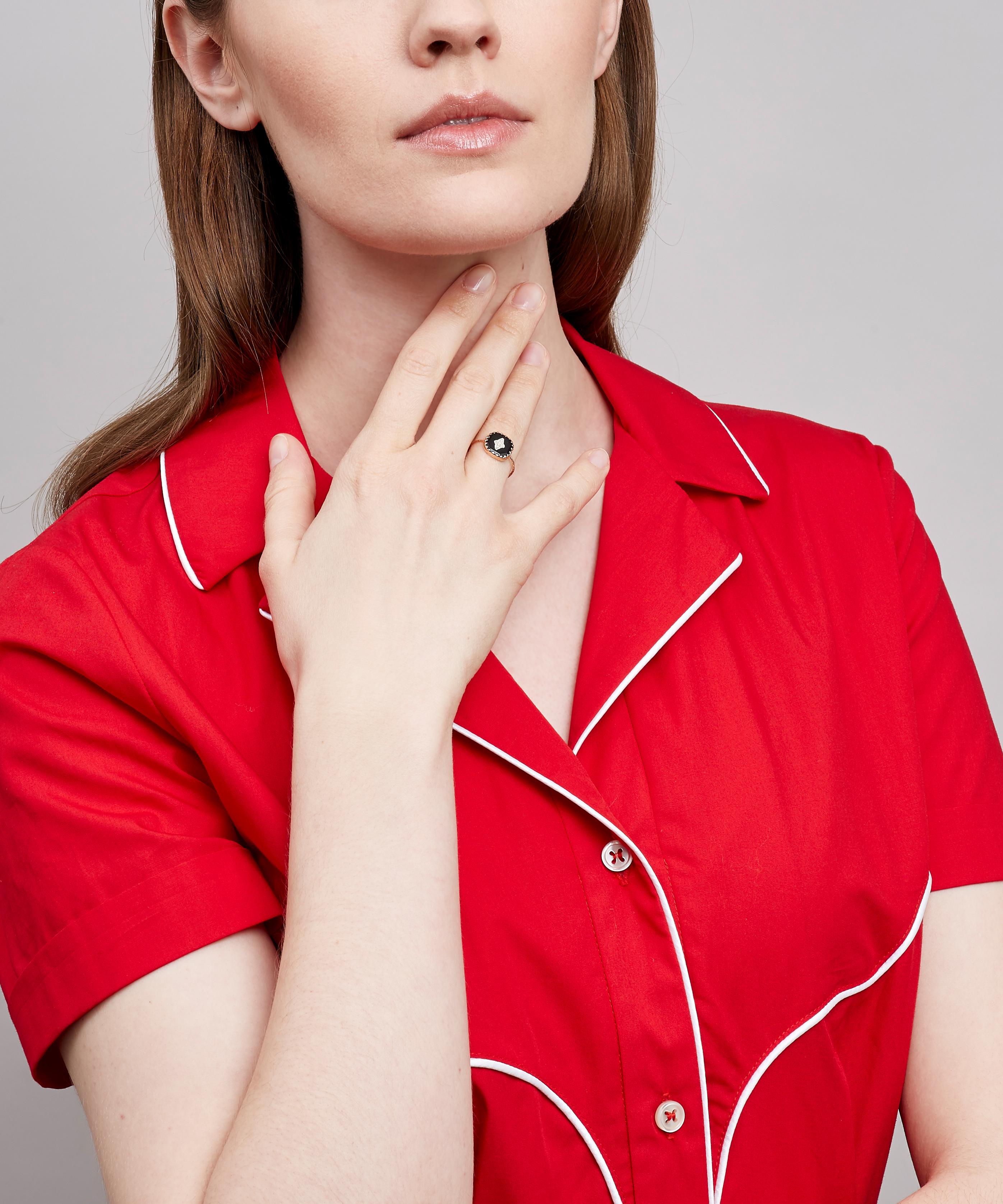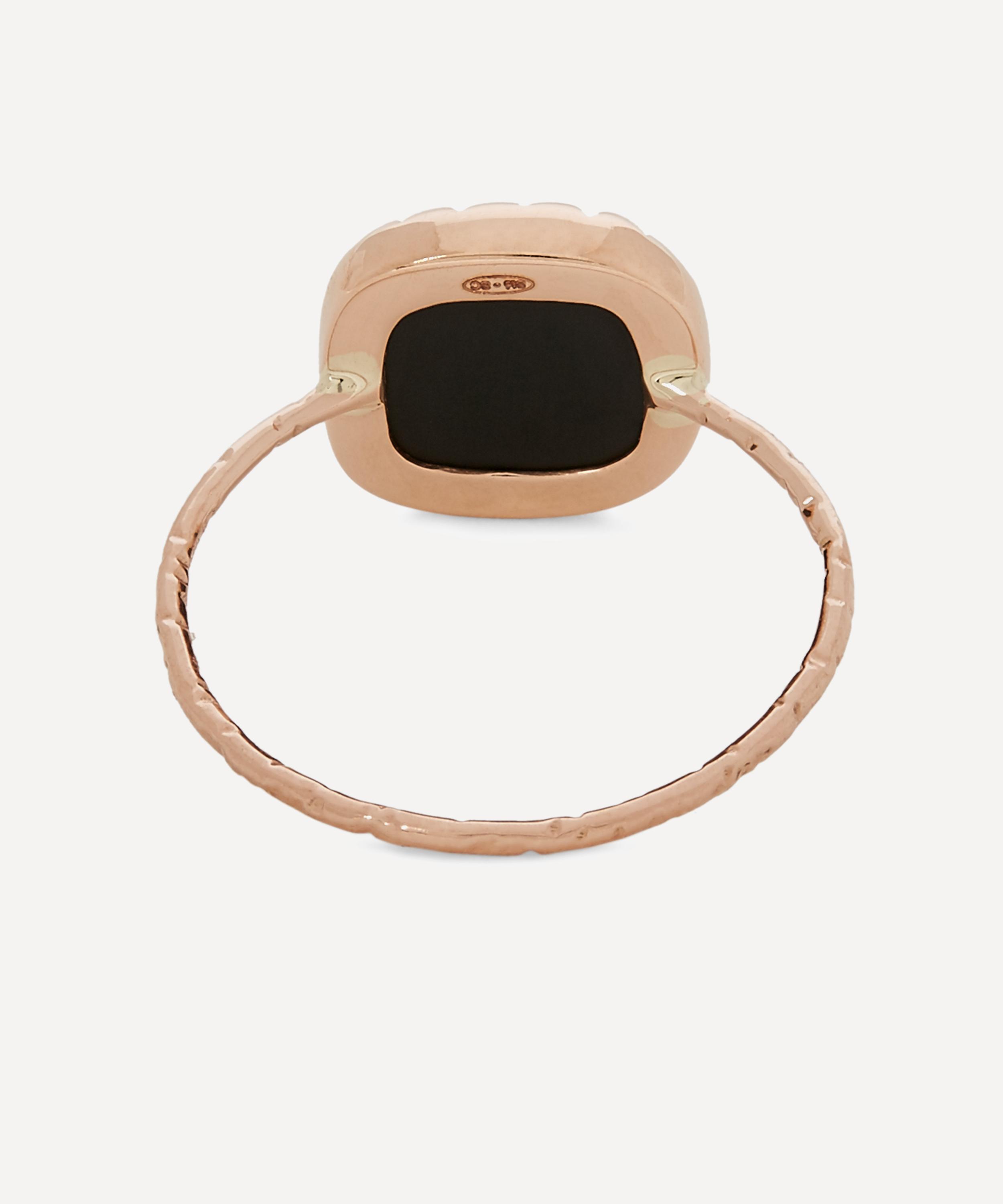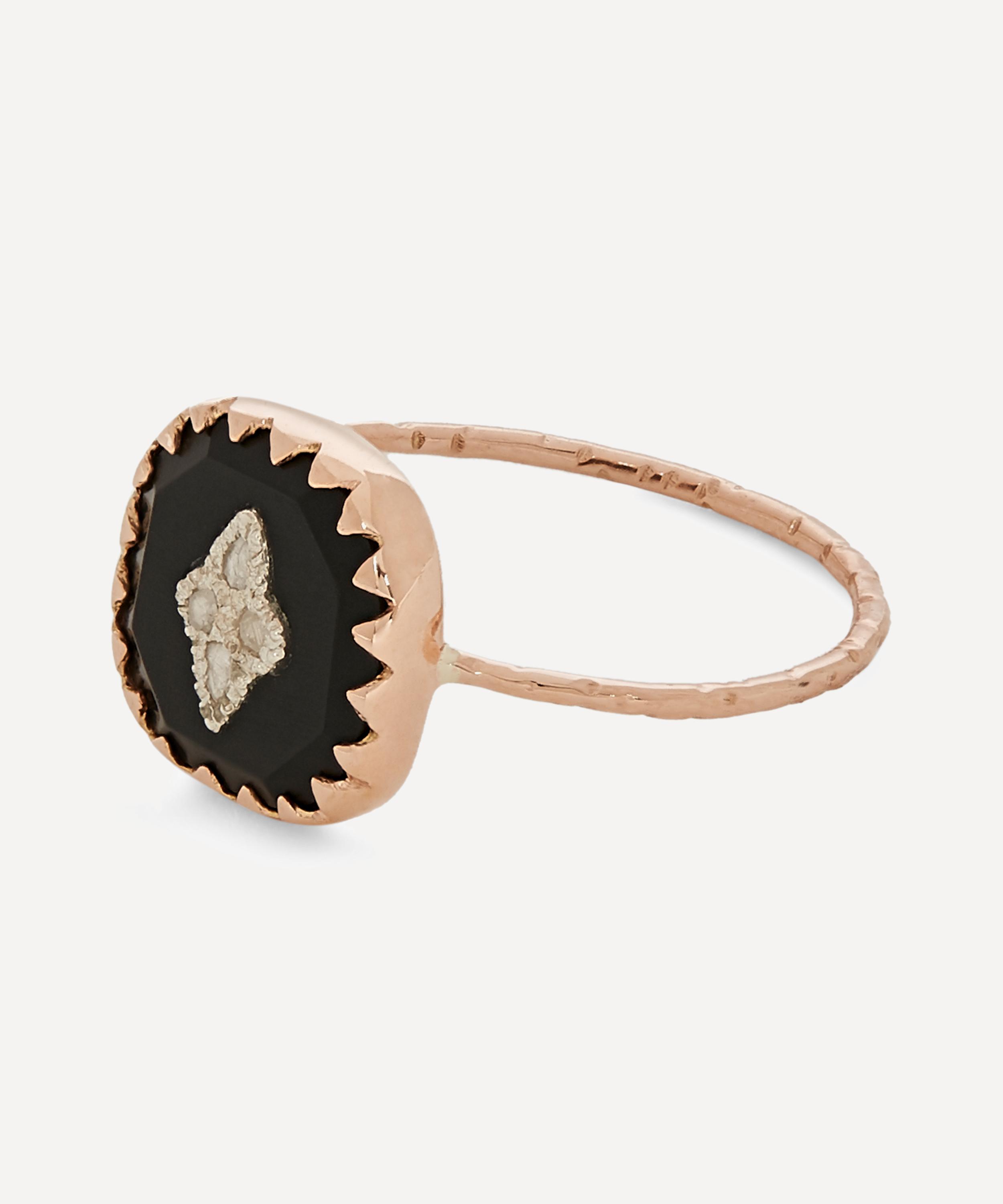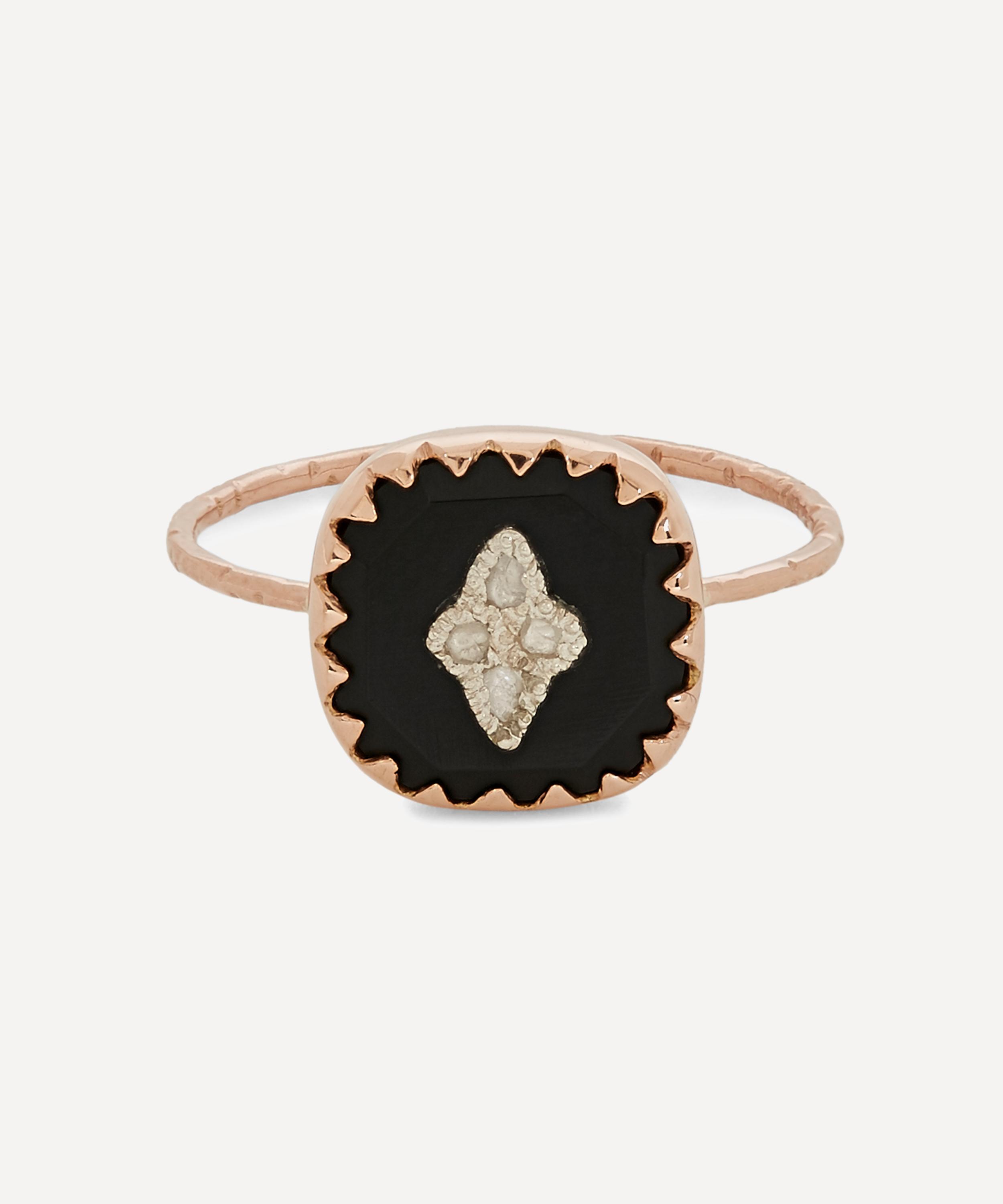 Perched on a slim, hammered rose gold band, this petite medallion is formed of a square-shaped fragment of glossy black bakelite in a polished, 9 carat rose gold claw setting. The designer's appreciation for natural imperfection is clear in the four raw, pavé polki diamonds sitting in clustered silver settings at the centre of the piece. Wear this precious personal talisman alone for statement appeal or stack yours with other organically-inspired bands from the designer's extensive collections.