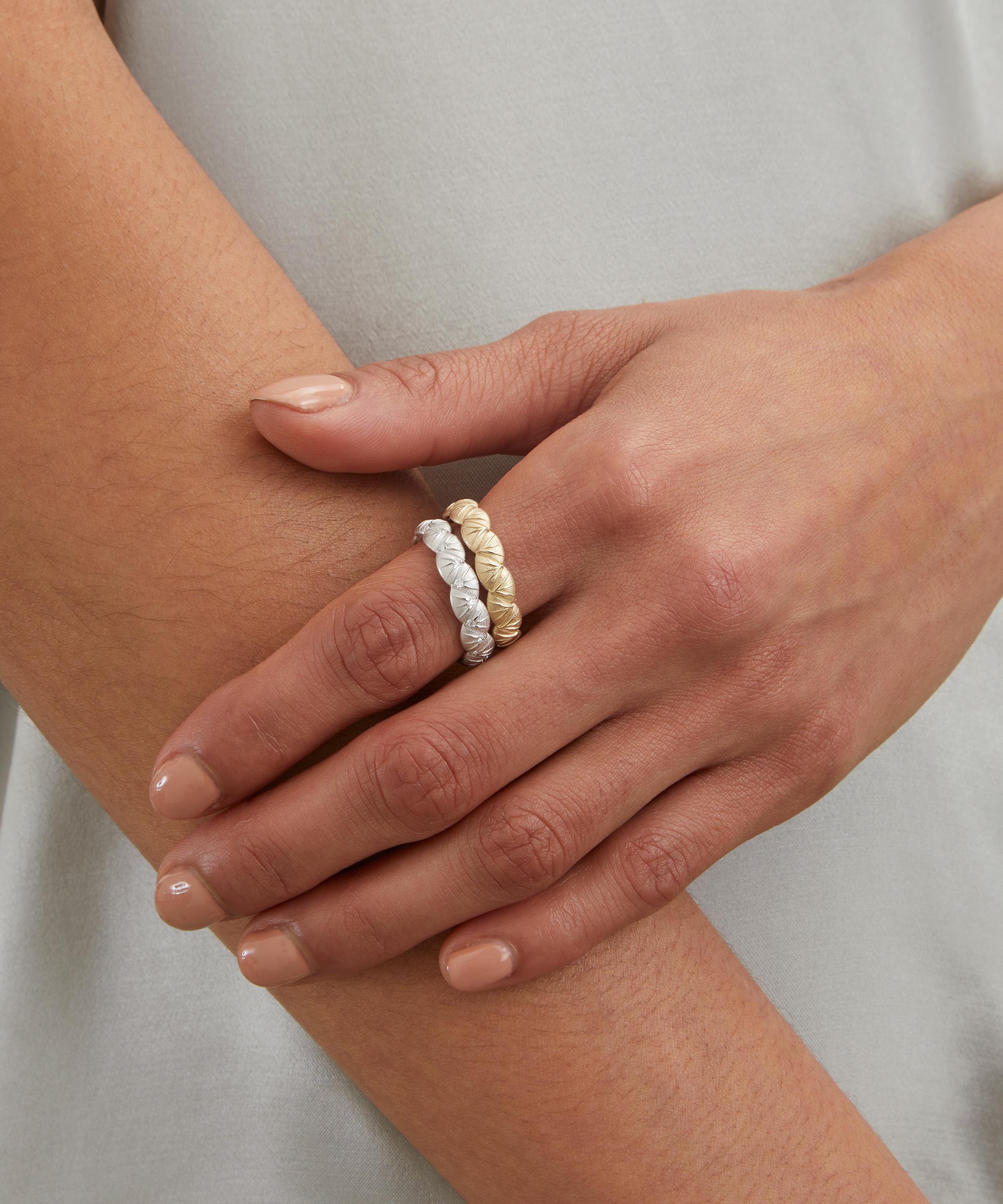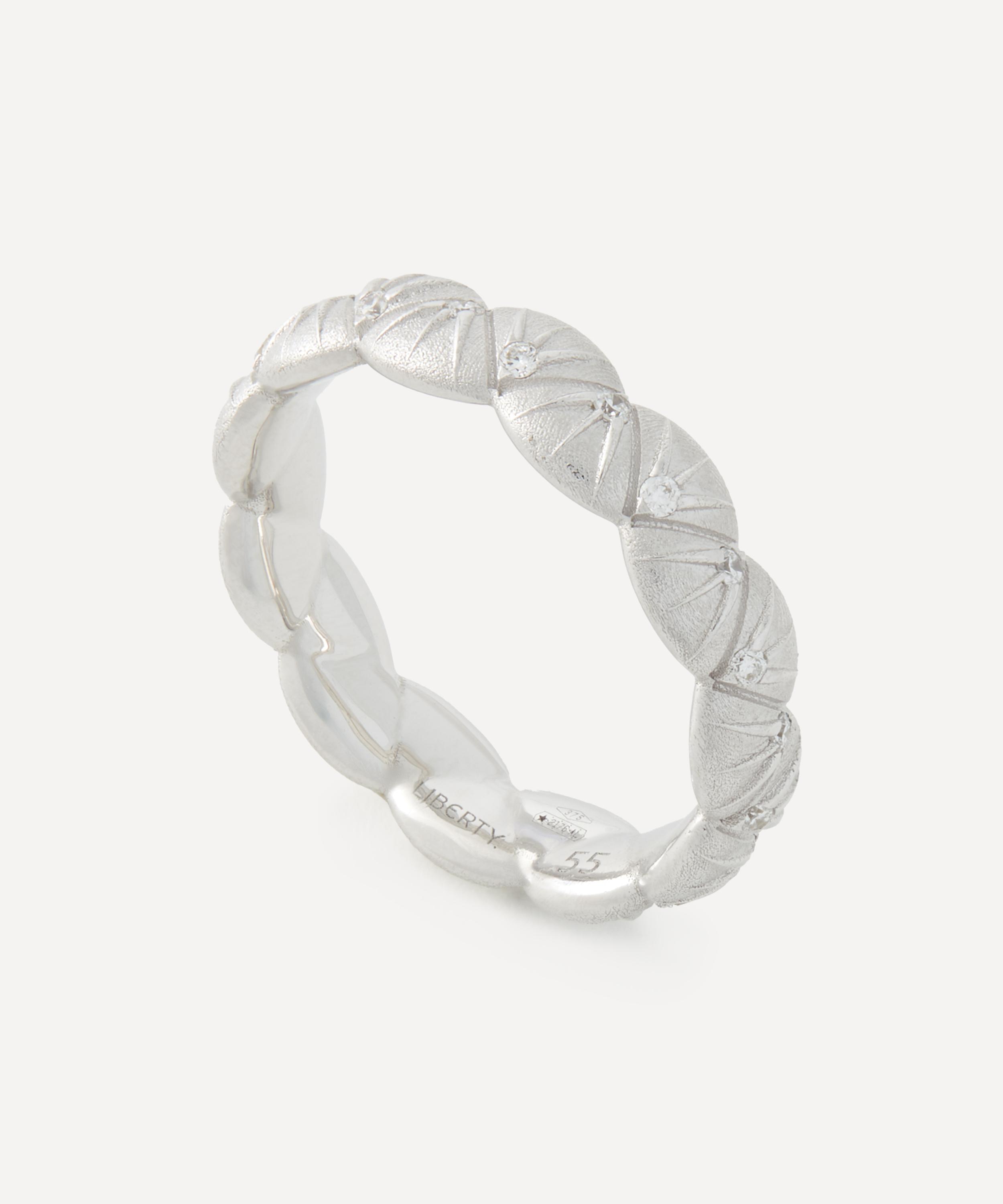 Crafted from 9ct white gold, it’s meticulously fashioned to emulate our Fanfare print – a sophisticated geometric pattern featuring a scalloped arrangement of Asian-style fan motifs. Boasting an elegant modern heirloom that pays tribute to Liberty’s collector spirit, style it solo, mix and match with other rings from your own collection, or try stacking it with the 9ct gold version for an eye-catching, two-tone look.
