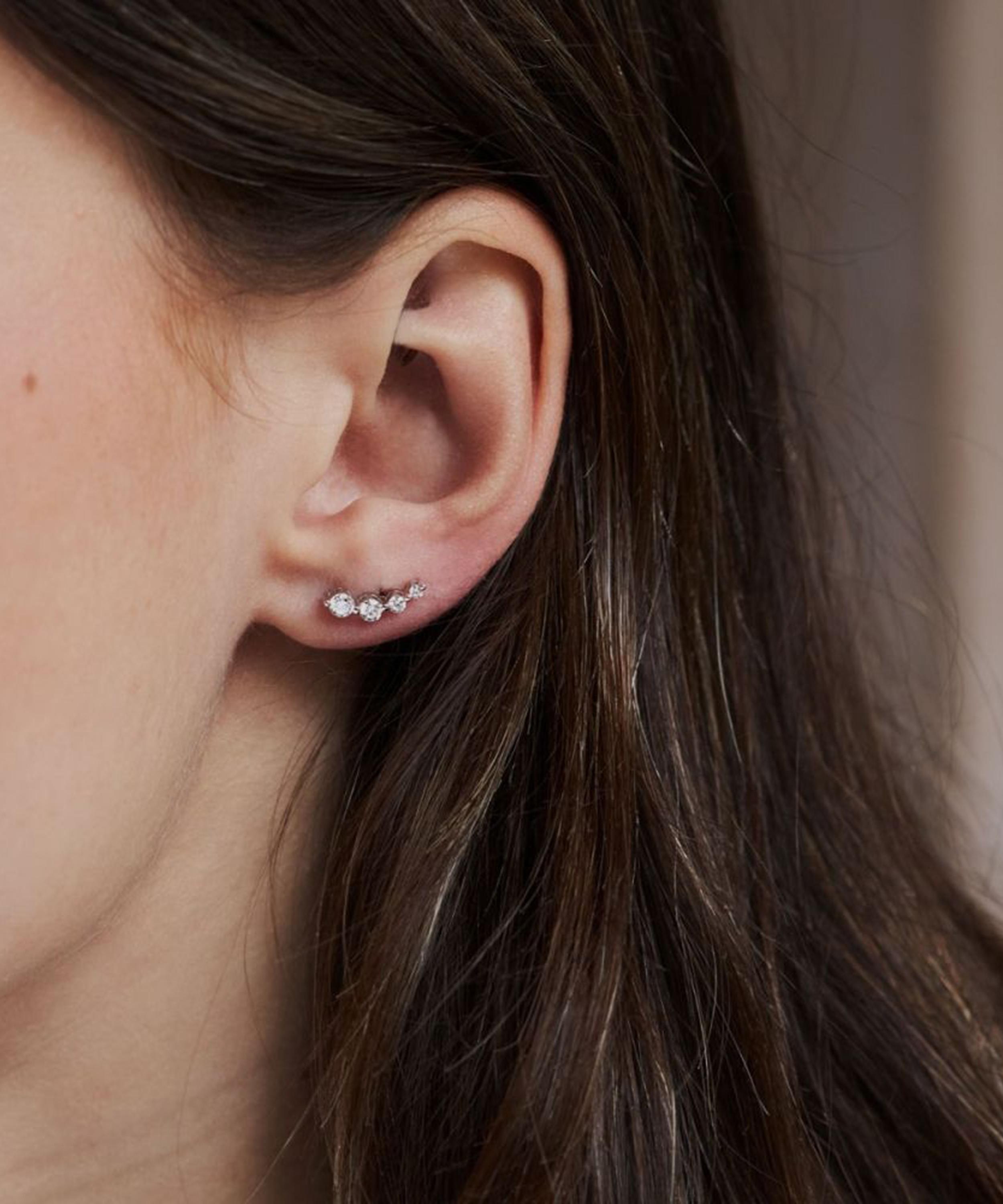 Crafted from 9ct white gold, each earring features a crawler set with brilliant cut created diamonds, graduating in size and mounted in the brand’s delicate Shuga setting, designed to mirror the contour of the ear. Wear them solo, paired with the matching necklace, or incorporate into a stack for more impact.