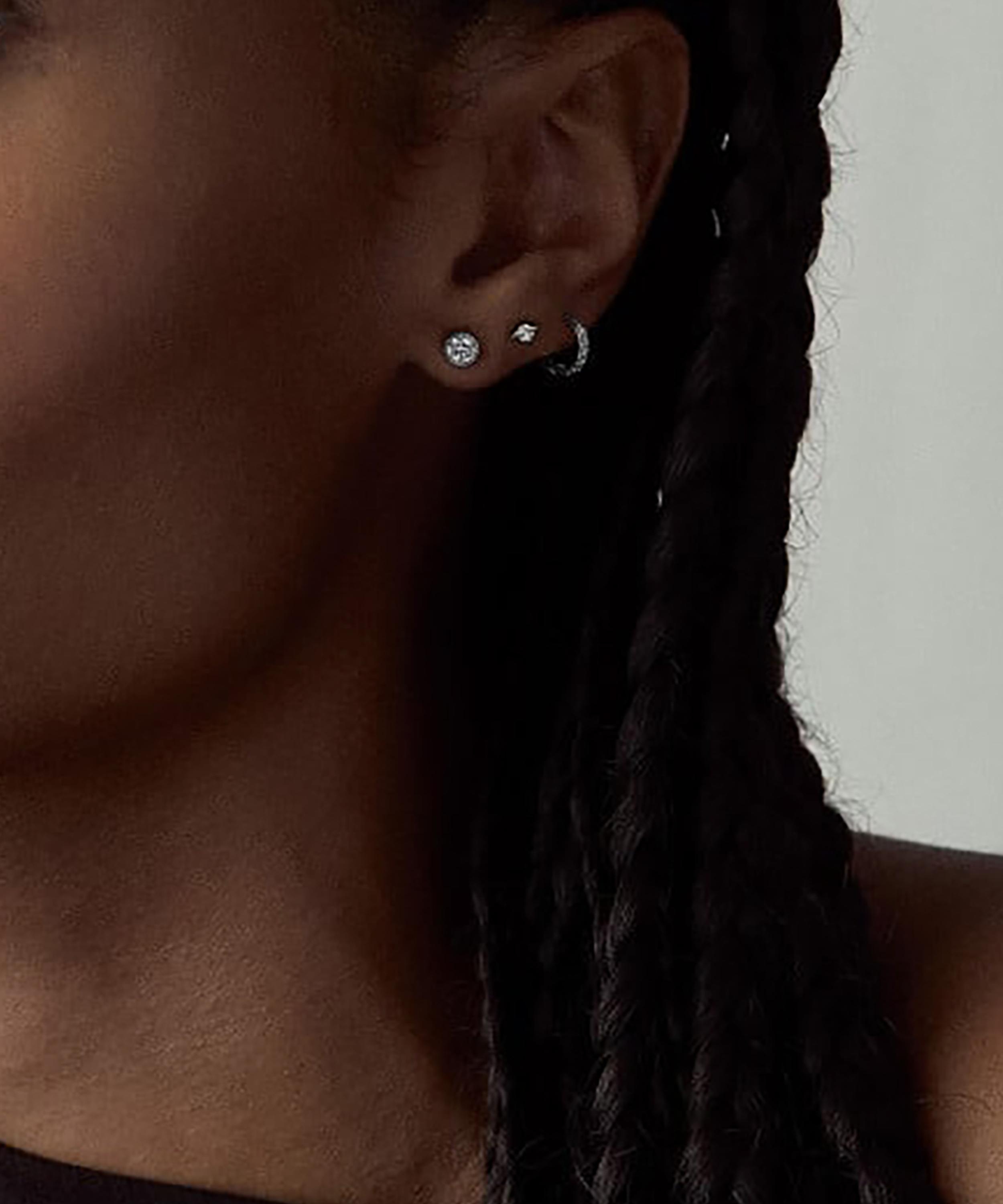 Each earring is cast in solid 9ct white gold to a round silhouette, and is illuminated by a single lab-grown diamond. This timeless pair are a jewellery box mainstay that look great in the lobes alone, or in any other piercing as part of a sparkling ear curation.
