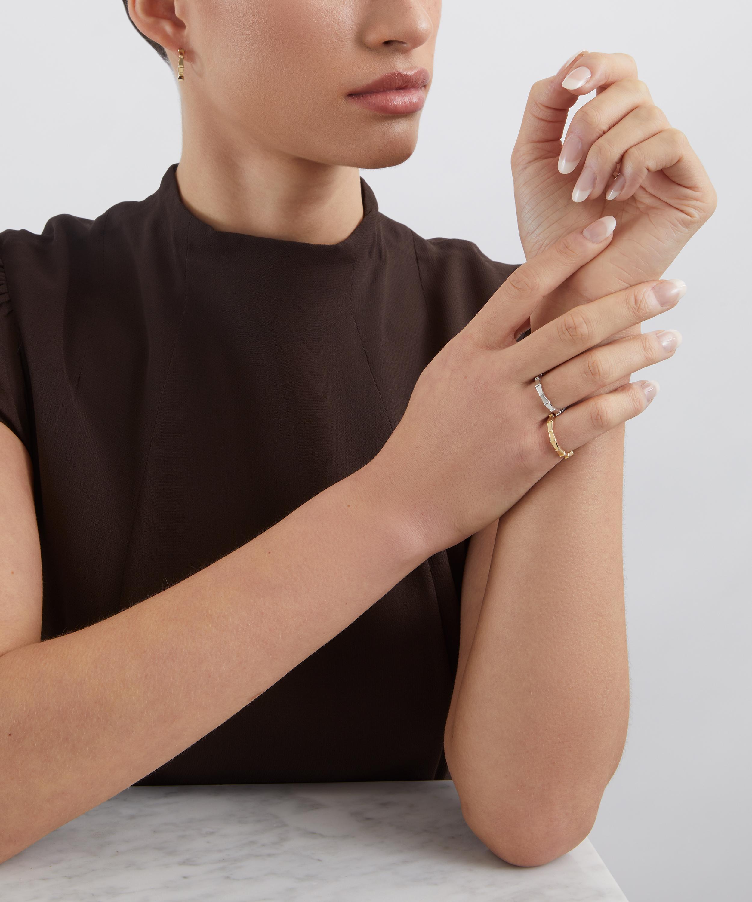 Handcrafted in Italy from solid 9ct white gold, the Tepper ring is defined by its angular, faceted silhouette, designed to echo the sculptural lines of Liberty’s iconic Waterfall collection, while catching the light from every angle. Balancing structure with luminosity, its clean, contemporary profile makes a confident yet quietly expressive statement. Wear it alone or pair with the coordinating rings and earrings from the collection for a cohesive, matching look.
