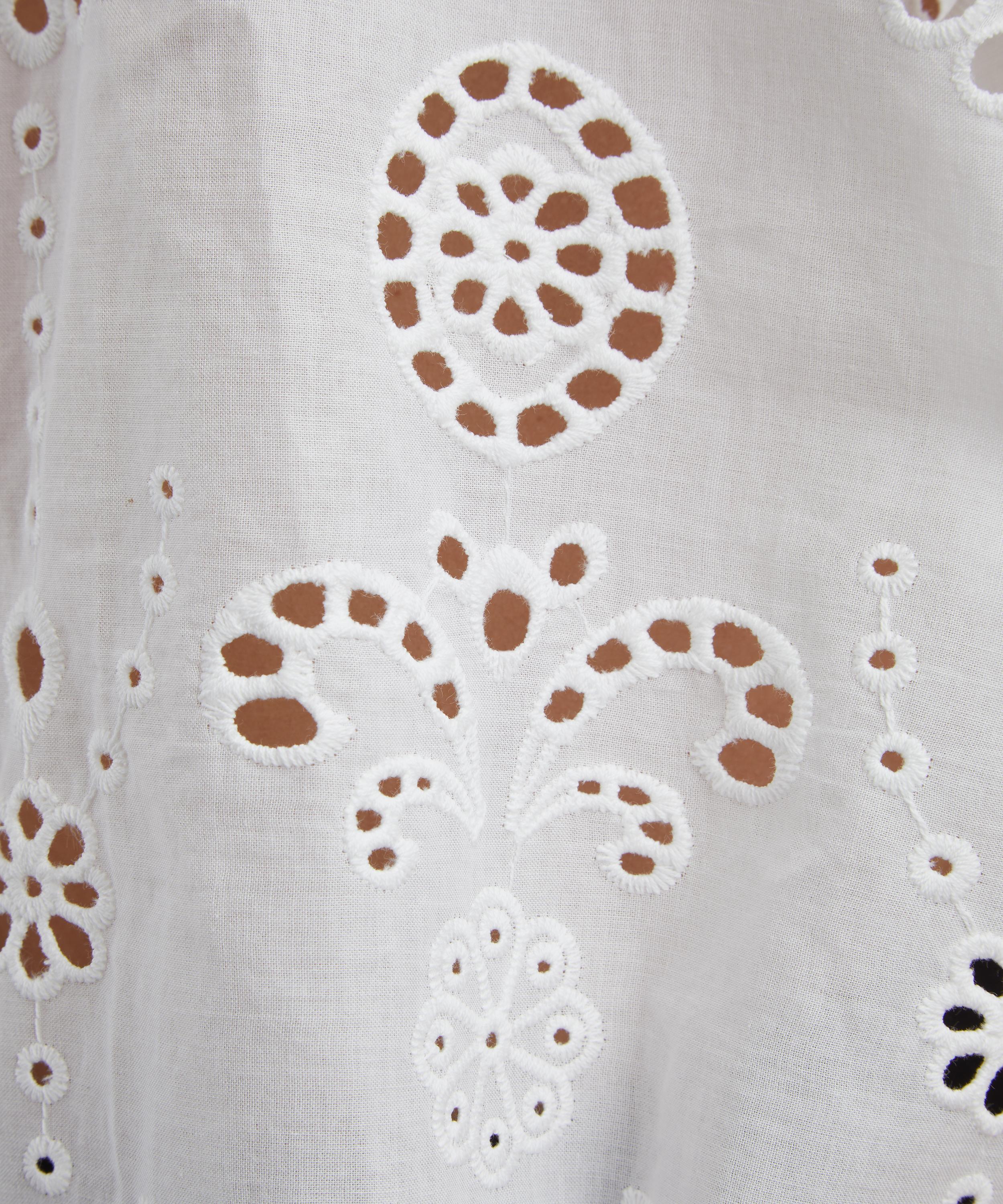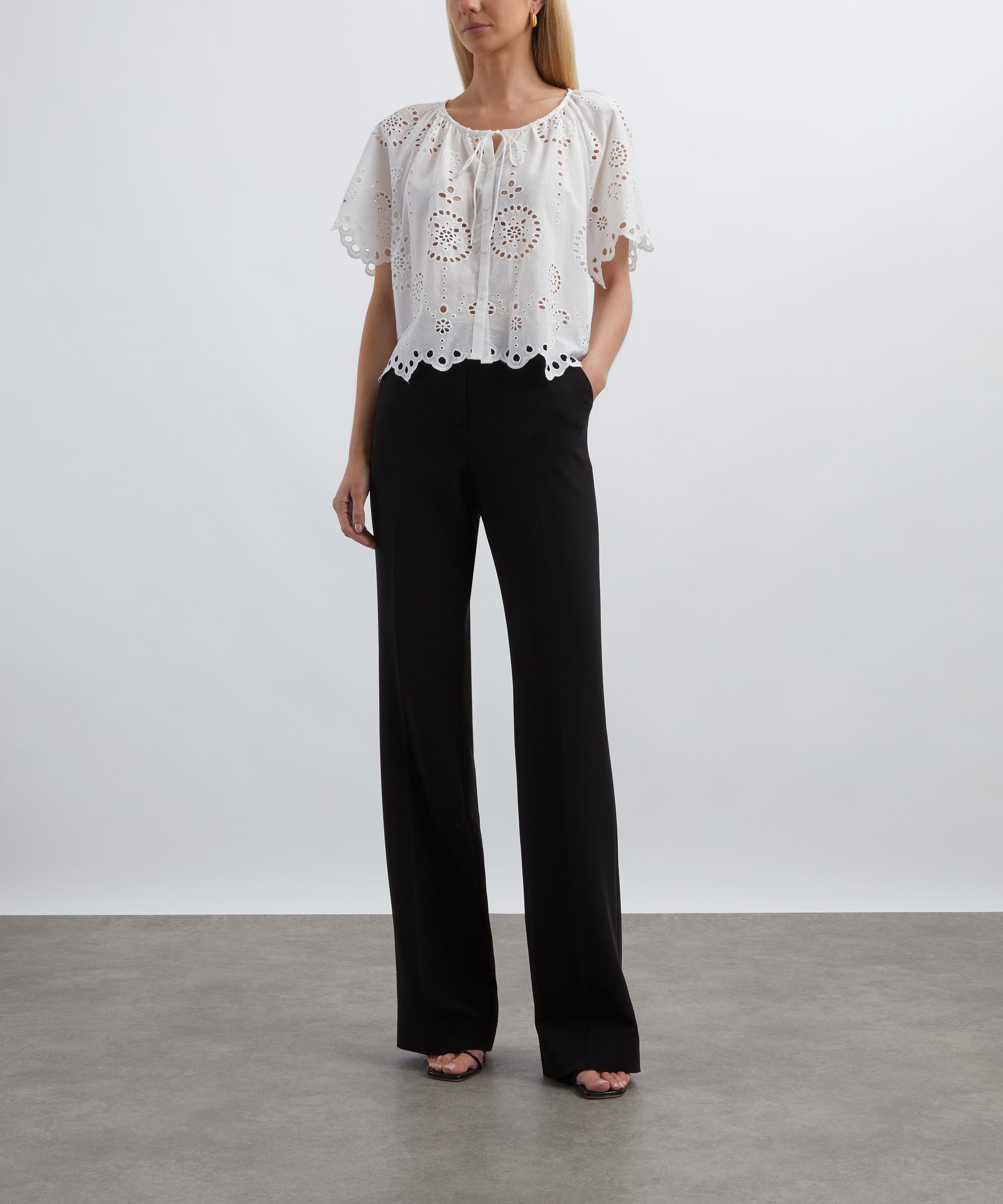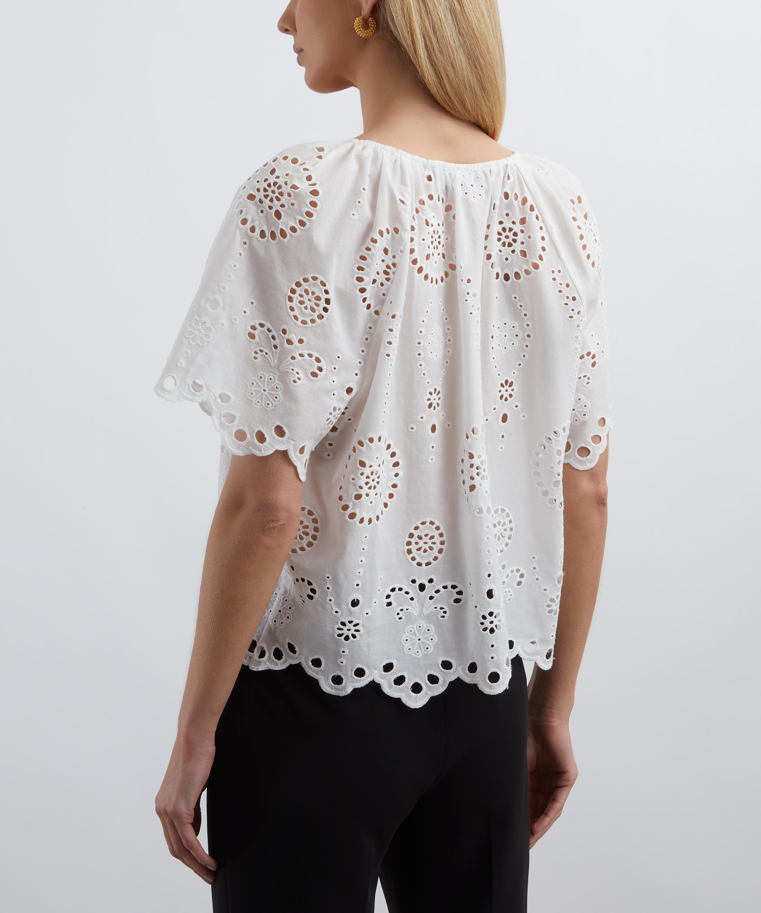 Crafted from lightweight cotton adorned with delicate floral broderie, this blouse exudes effortless refinement. Designed with a round neckline, short raglan sleeves, and a buttoned front, scalloped detailing along the hems adds an added touch of elegance to the piece.