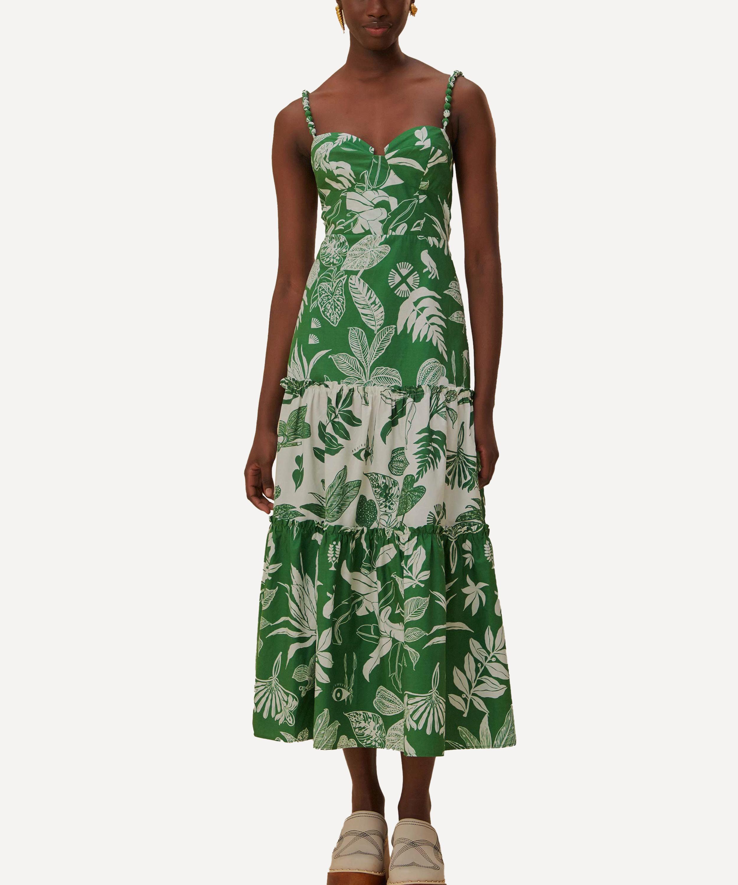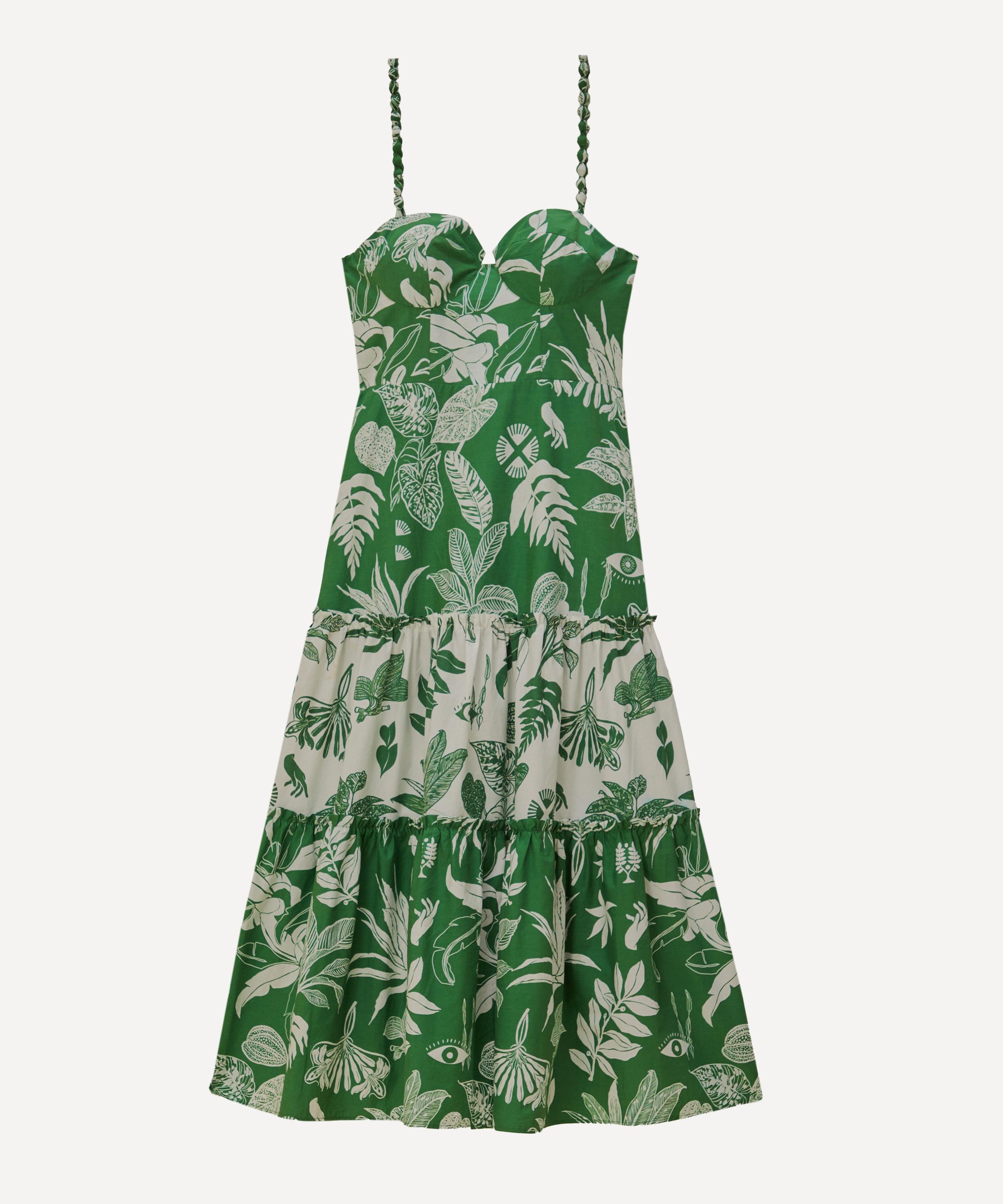 Adorned all-over in the bold and blooming Forest Soul print, this elegant midi-dress is the ultimate summer piece with its sweetheart neckline, and beaded straps. Crafted from cotton, its breezy tiered skirt is constructed from contrasting green and white panels.