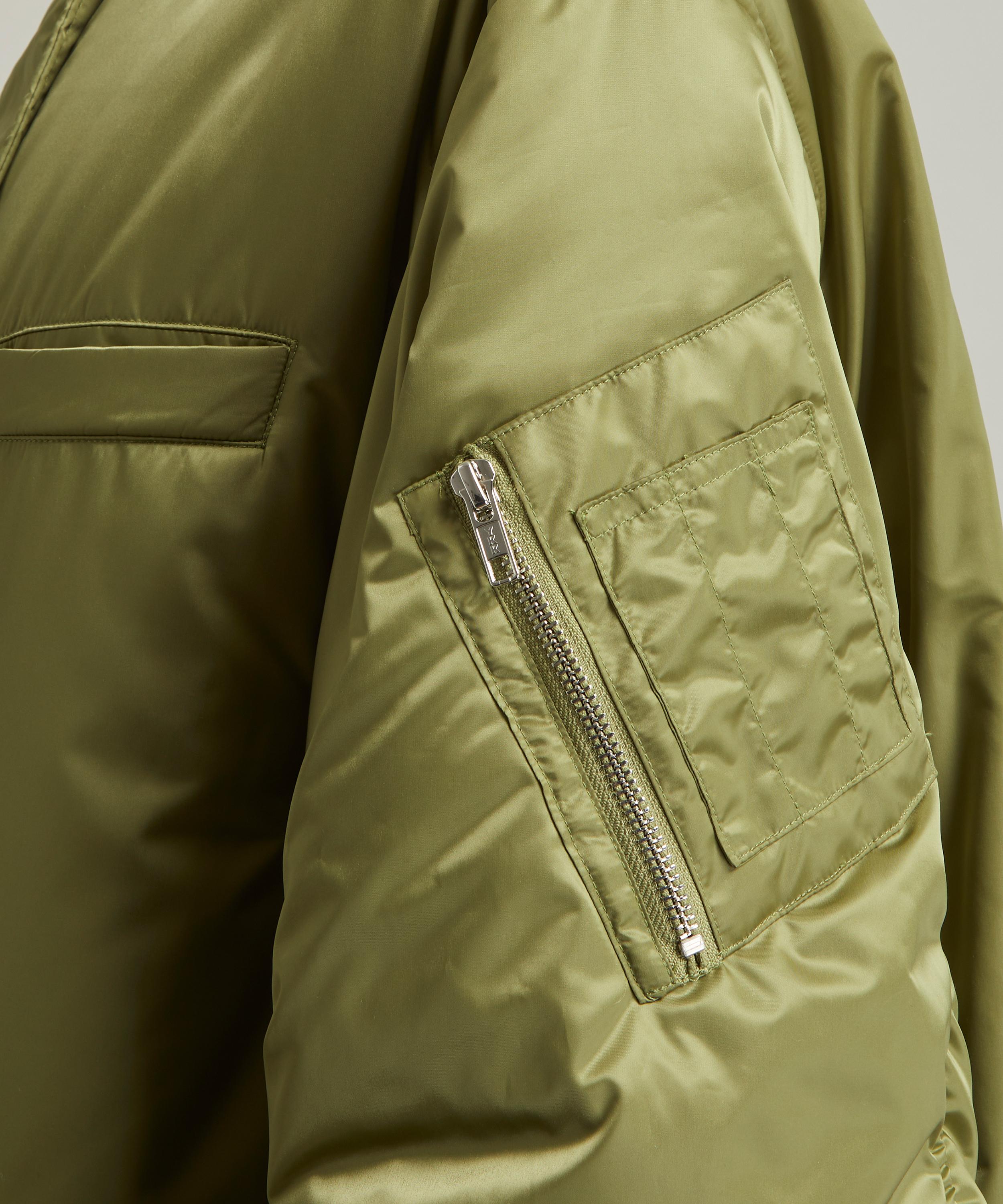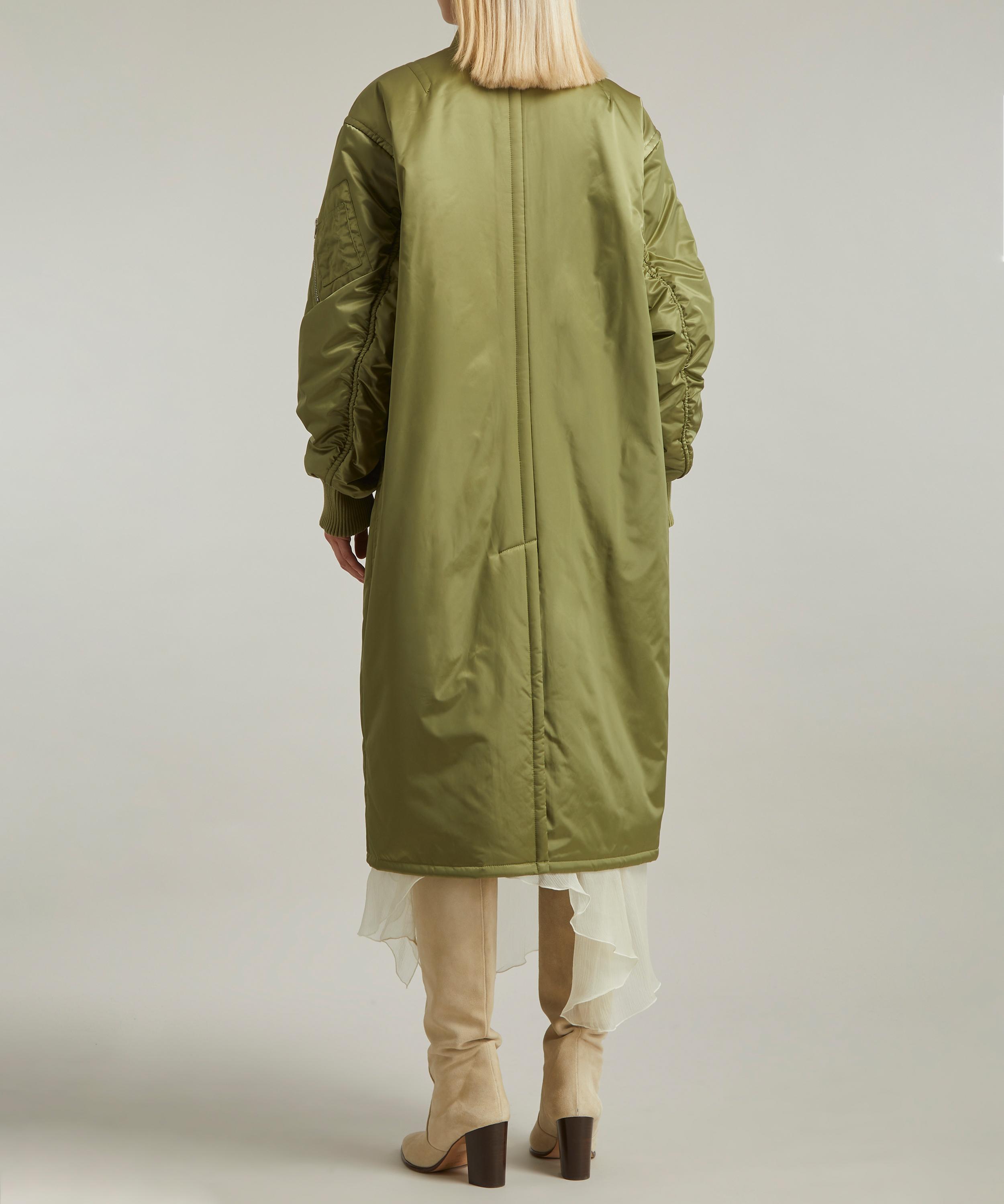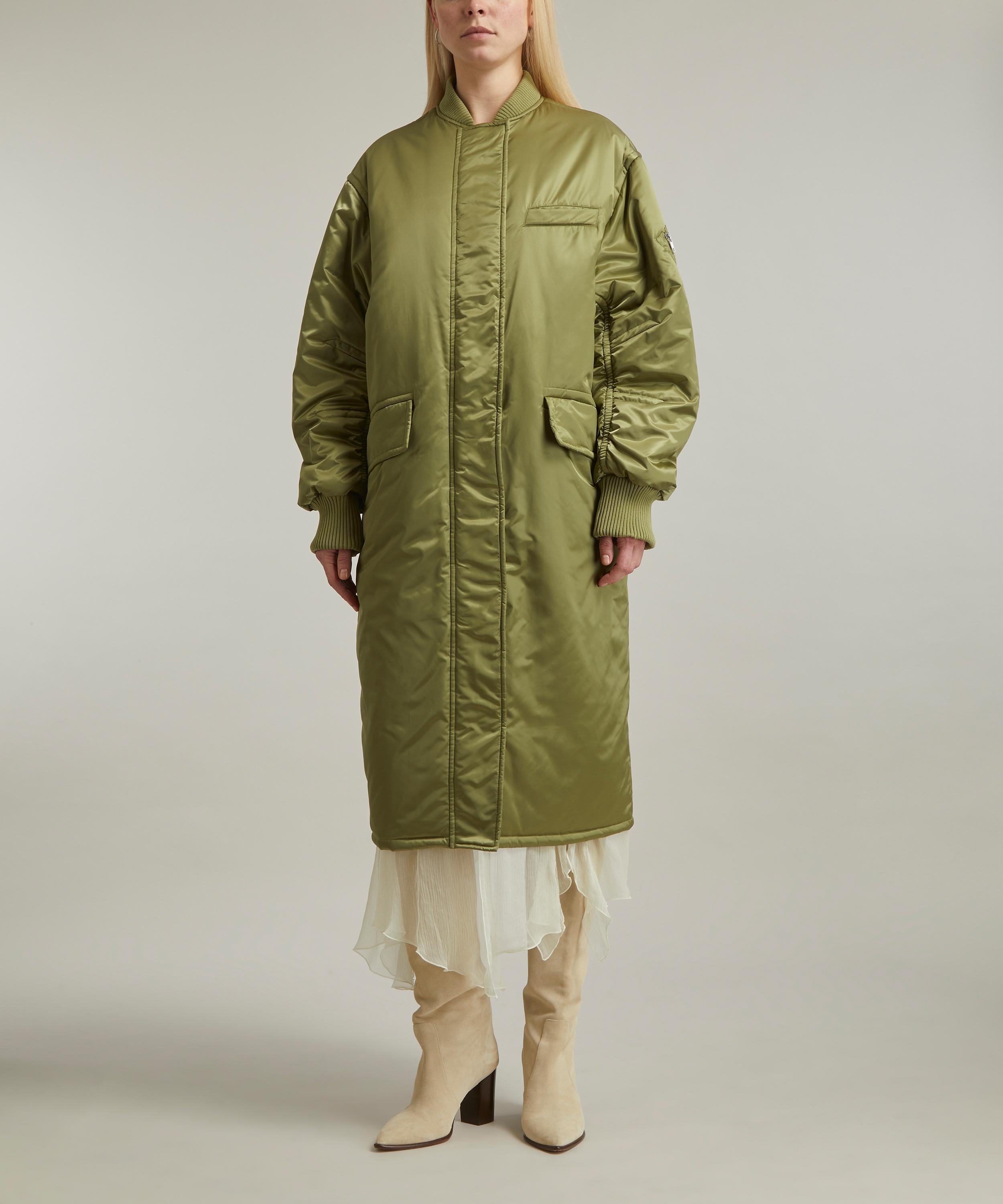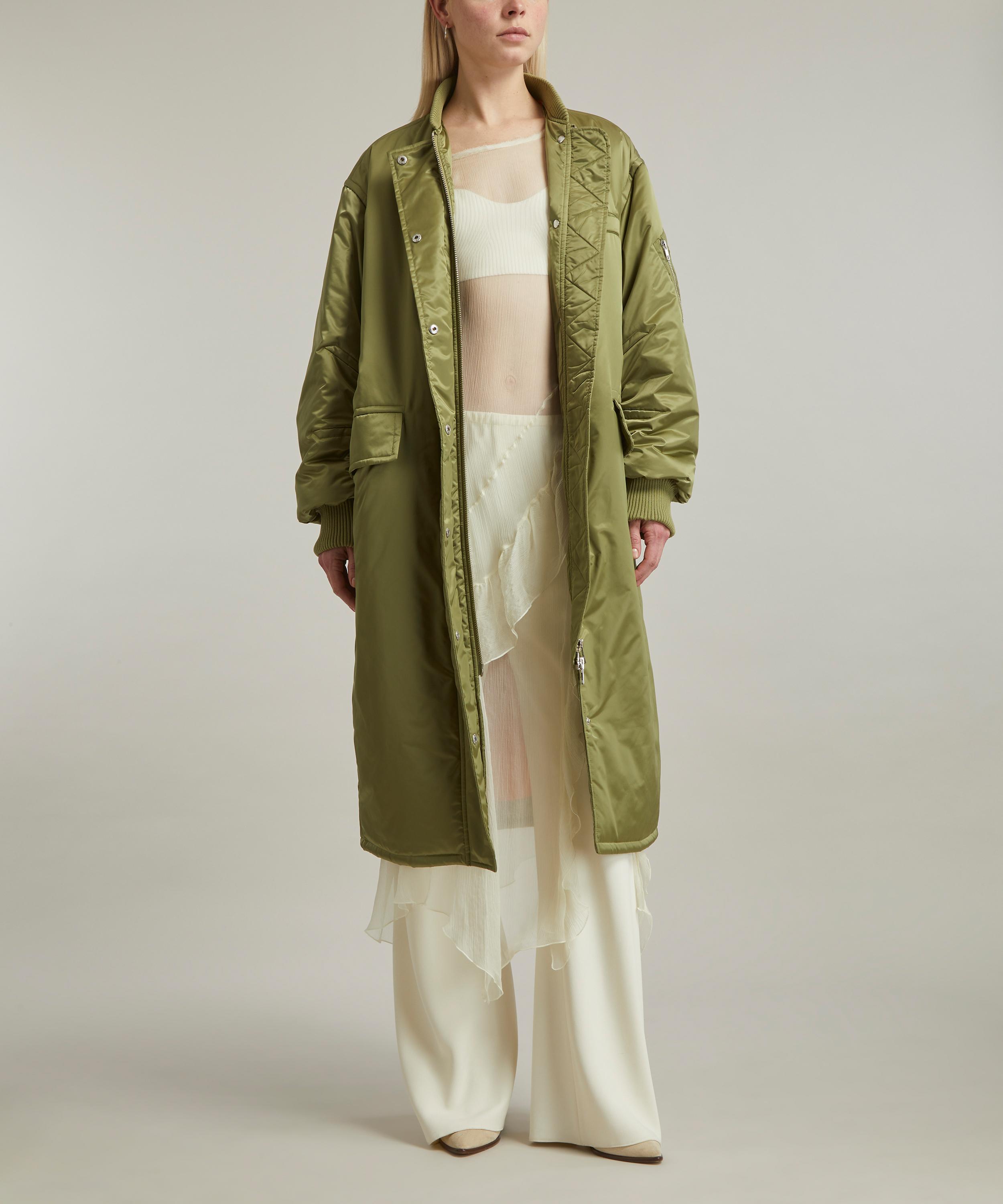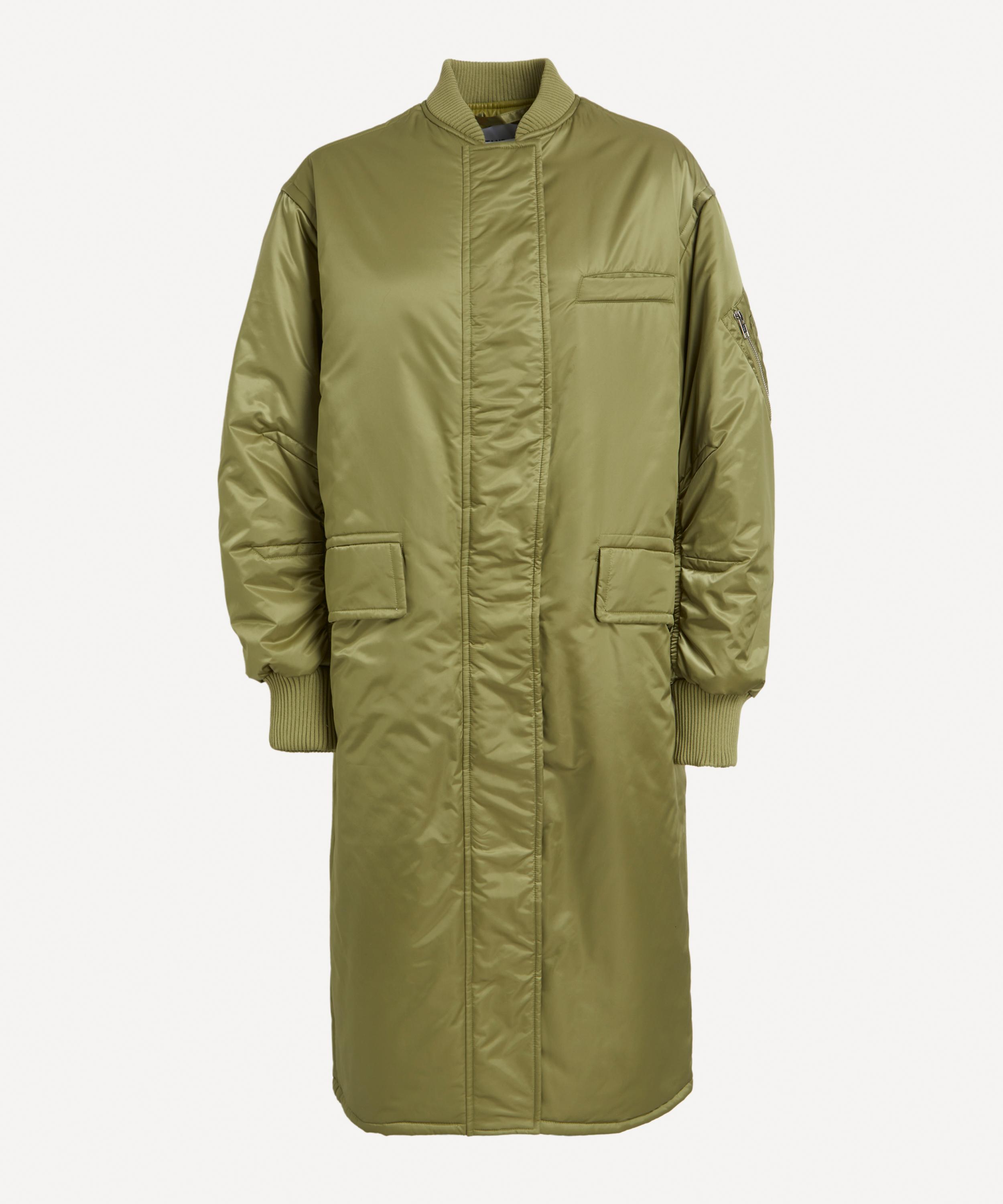 Super-slick with an air of Scandinavian simplicity, this longline bomber jacket boasts an oversized, cocoon-shaped silhouette. Crafted from a sheeny, sage-green fabric, it features classic detailing typical of a bomber jacket including a ribbed collar and cuffs, multiple pockets, and a front zip and push-button closure.