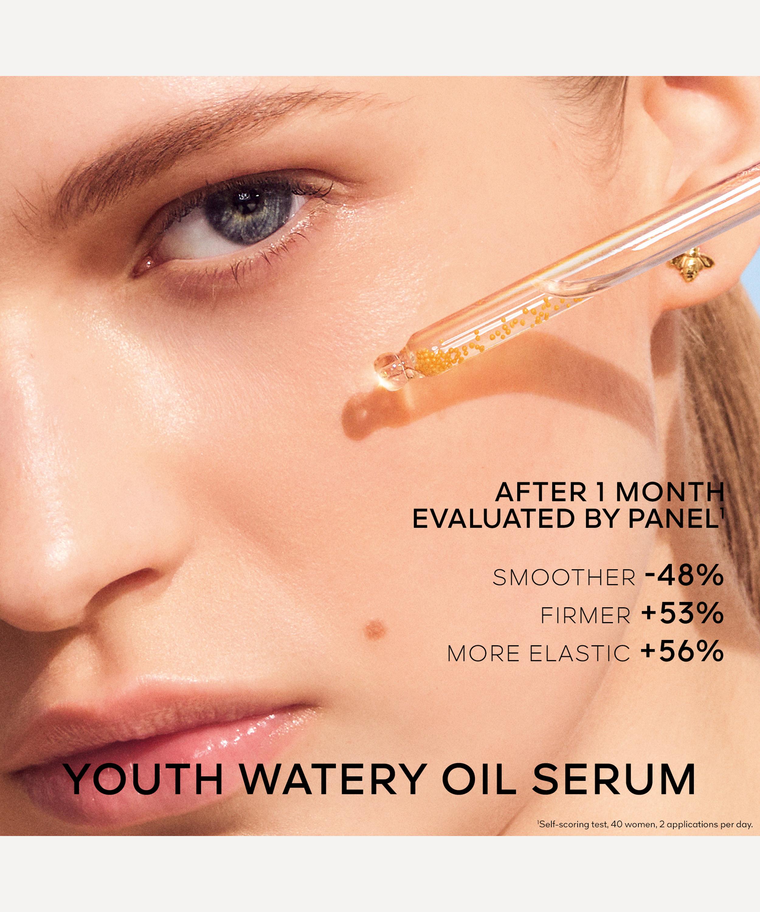 Abeille Royale Youth Watery Oil Serum: Step 1: Gently shake the bottle. Step 2: Take the equivalent of a pipette full, around 10 drops, and warm in the palms of your hands. Step 3: Using the palm of your hands, smooth into the skin, starting in the middle of the face and moving outwards. Step 4: Re-plump by making fists with your hands, placing them on your cheeks, then making upward rotating movements.