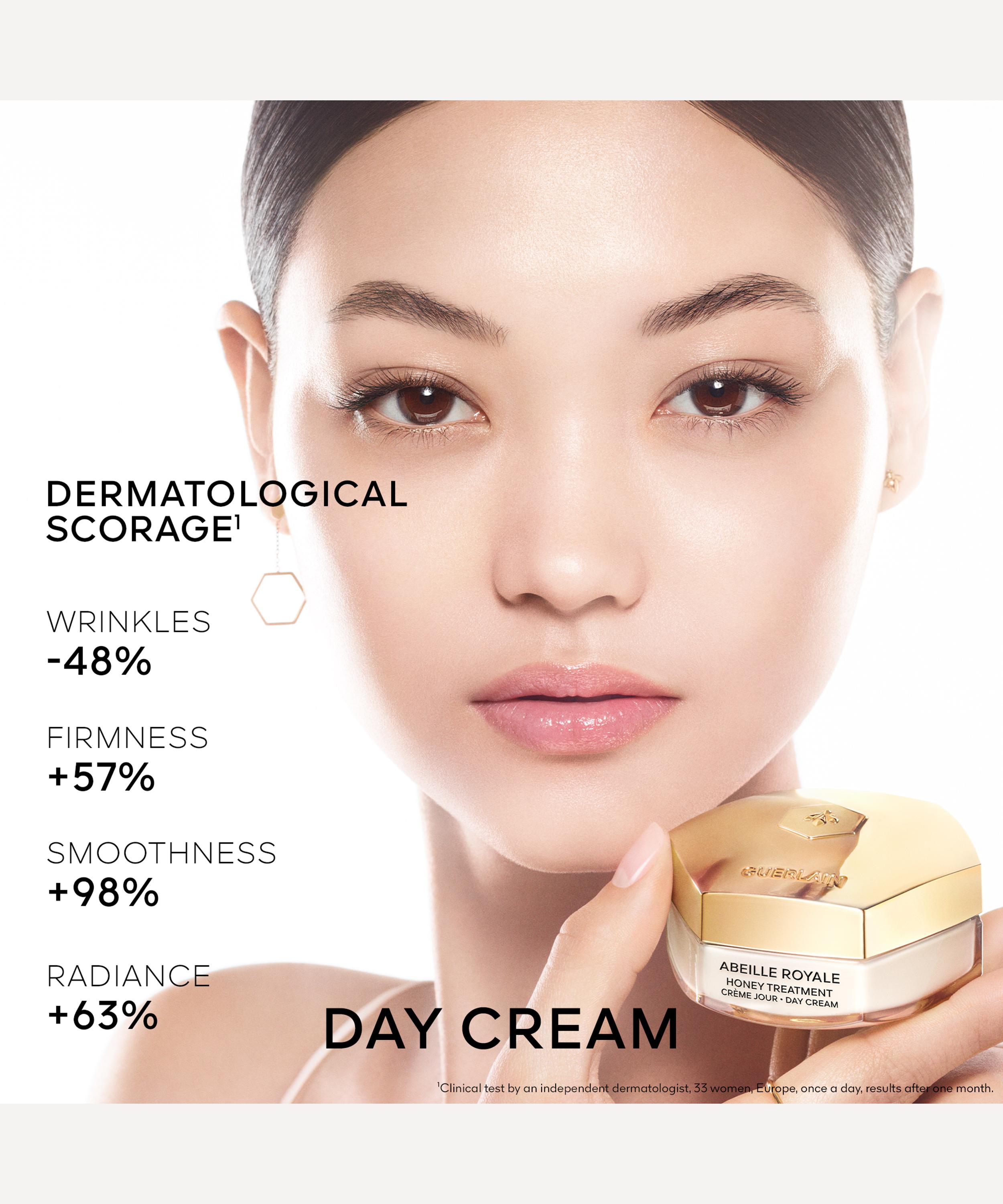 Abeille Royale Honey Treatment Day Cream: Applied to cleansed skin, on the face and neck, in the morning. With the edge of the index fingers, massage downwards over the sides of the nose. Smooth towards the outside of the face to the ears, still using the edge of the index fingers. Slide the palms of your hands flat along each side of the jaw, starting from the bottom of the chin and moving towards the ears. End with an external smoothing stroke over the crow’s feet area with the fingertips.