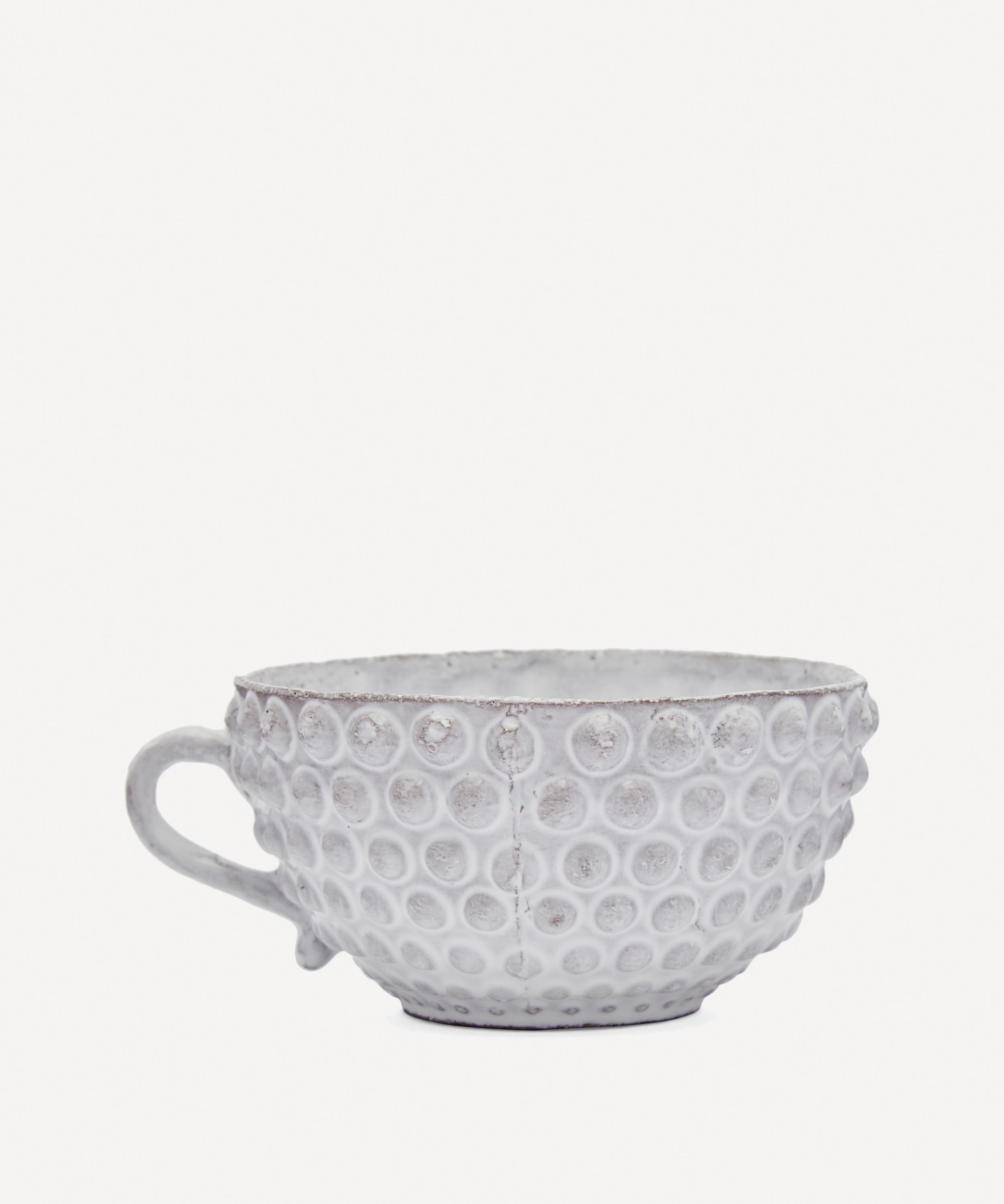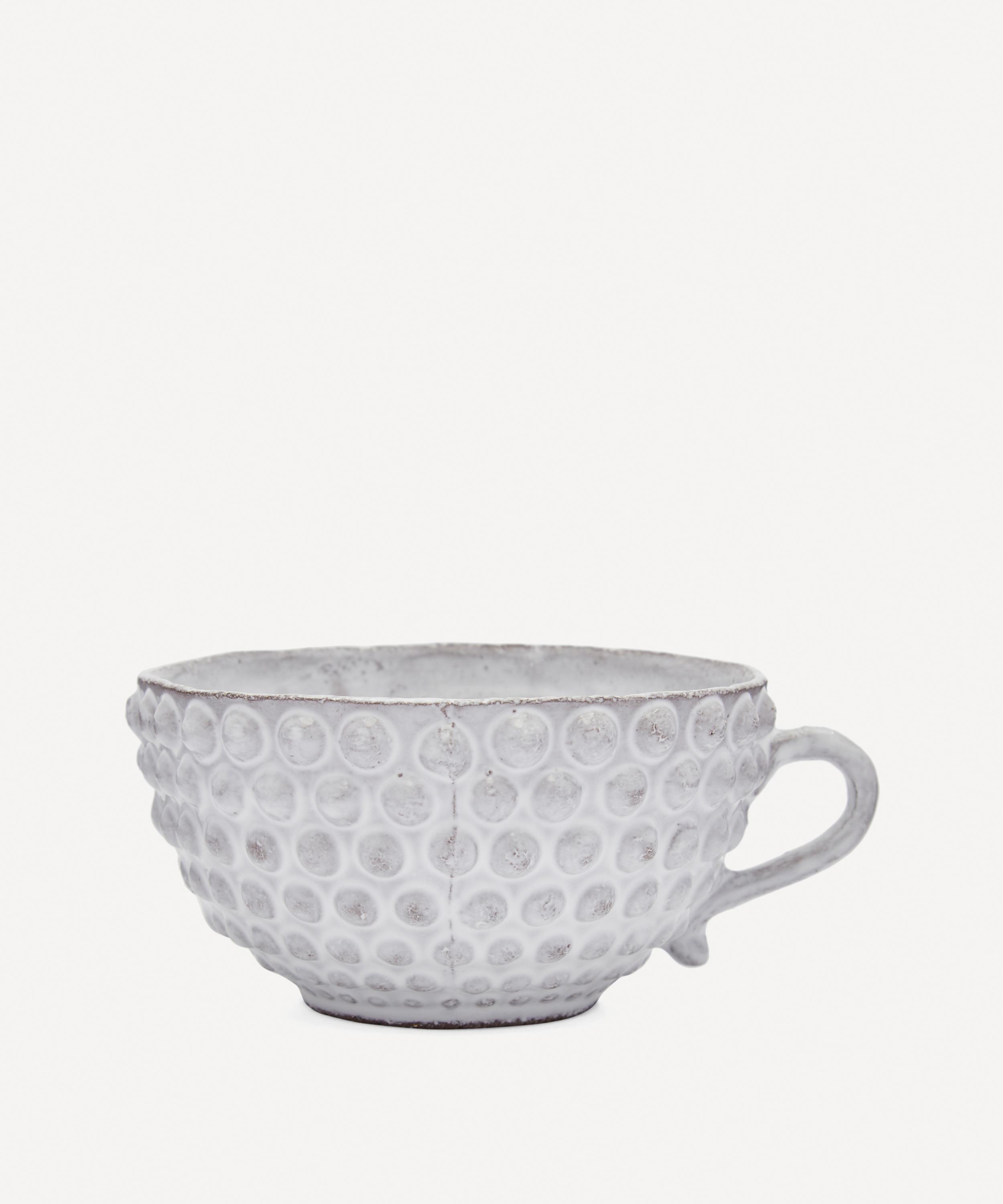 Votary of pre-industrial fabrication, Astier de Villatte is celebrated for being the one and only studio in Paris to hold and harbour the traditions of artisanal ceramic production. Restoring the ancestral systems of moulding and stamping, the Adélaïde tea cup is made using techniques from the Middle Ages which involve moulding a sheet of handmade clay, double firing the ‘biscuit’ piece and glazing the product in white enamel – a lengthy process that requires a drying time of up to one month. Characterised by a knobbly exterior and quaint handle, the tea cup is engraved with the brand’s signature crest - depicting an interlacing A & V - alongside the initials of one of the 40 master artisans who created it. Each handmade piece tells a beautiful story, it romances and imparts a sense of nostalgia into its owner. Arrange with other mugs in the collection to breathe an air of authenticity into your afternoon tea setting.