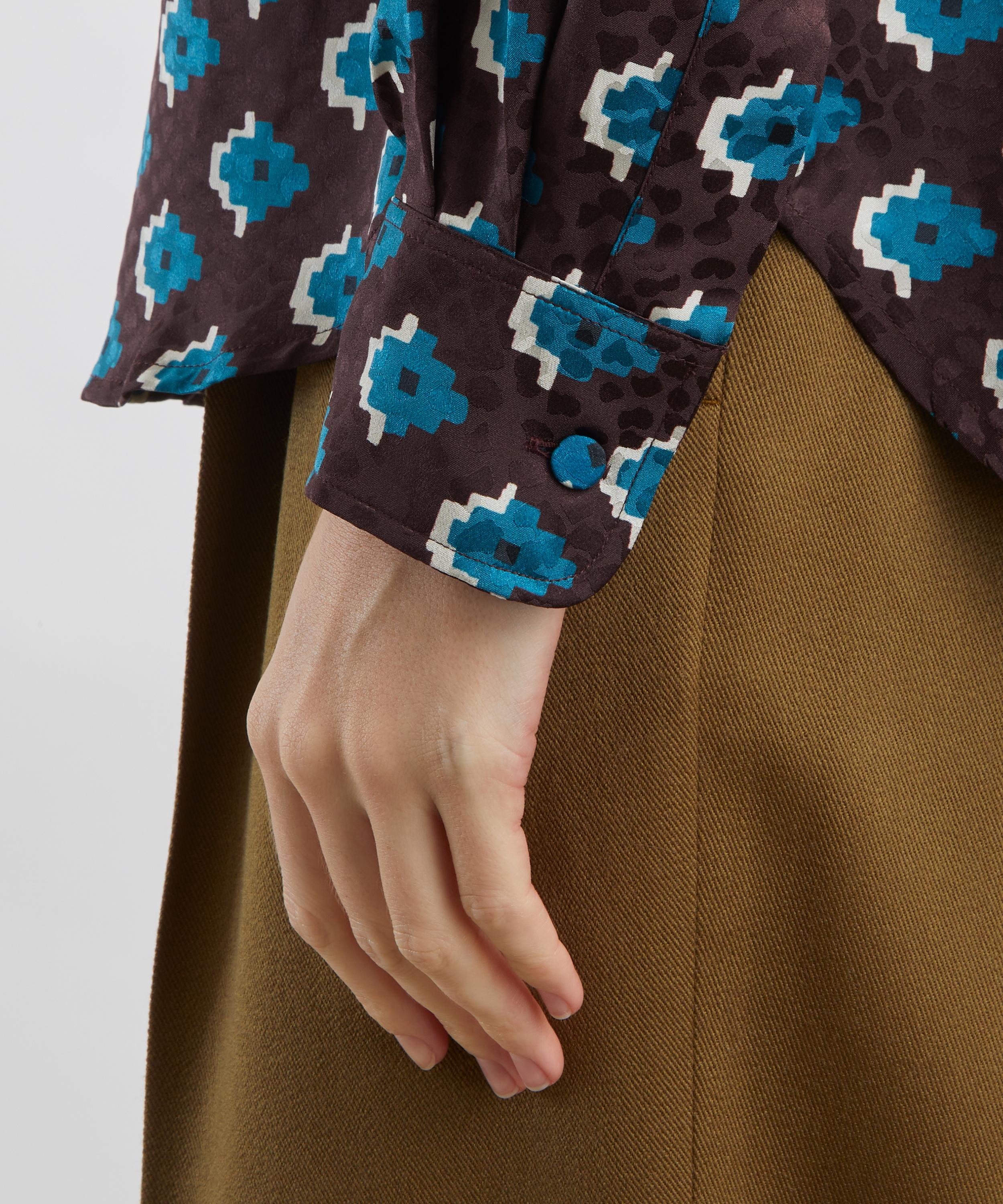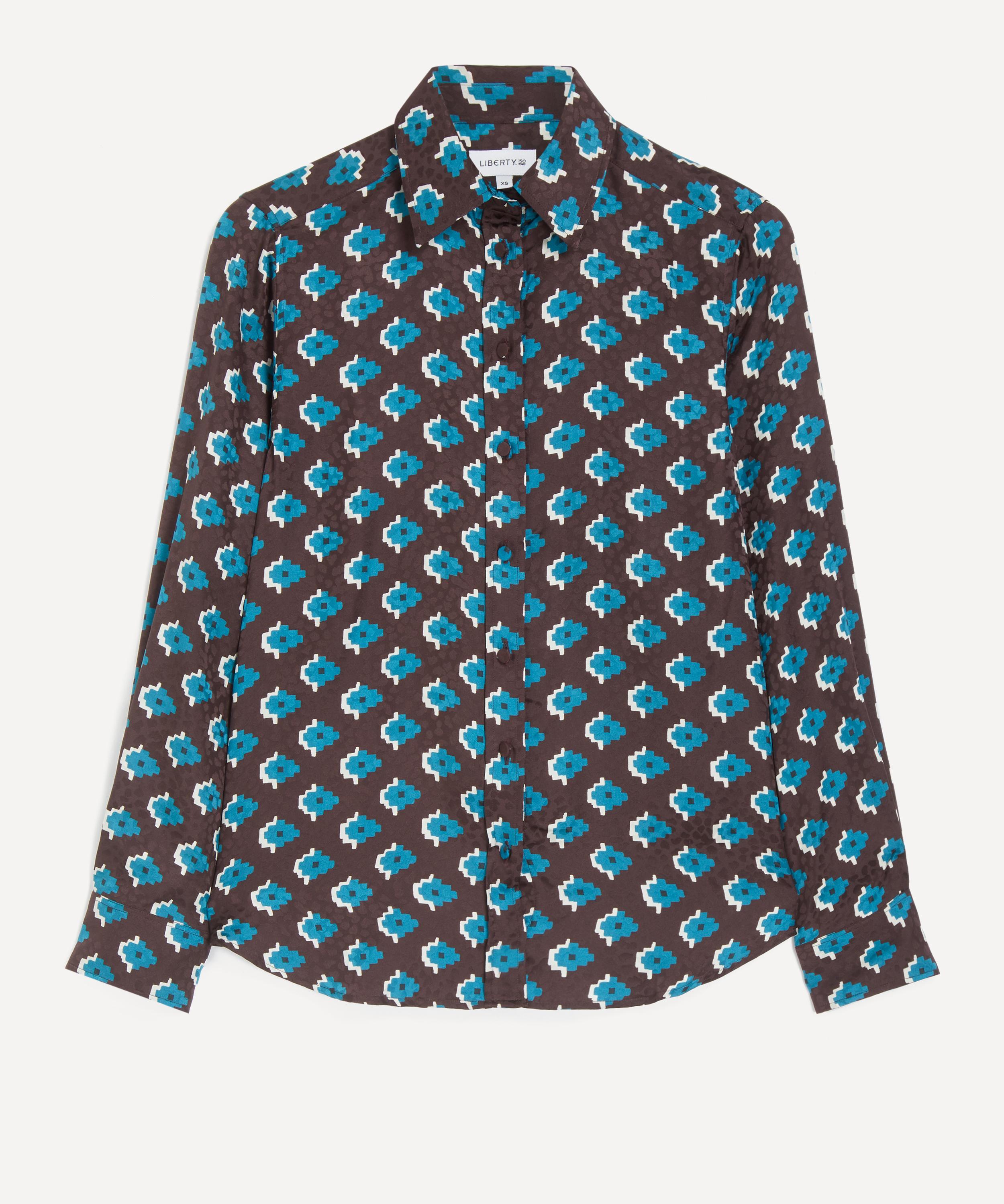 Crafted from silk jacquard, this sleek shirt is adorned with our Adamas print. Discovered as a tiny fabric fragment in the Liberty archive, this neatly arranged geometric pattern is reminiscent of traditional Central Asian or Middle Eastern kilim motifs. Featuring a grid of angular diamond shapes, the design’s simplicity and repetition creates bold shadow contrasts and a strong, graphic presence.