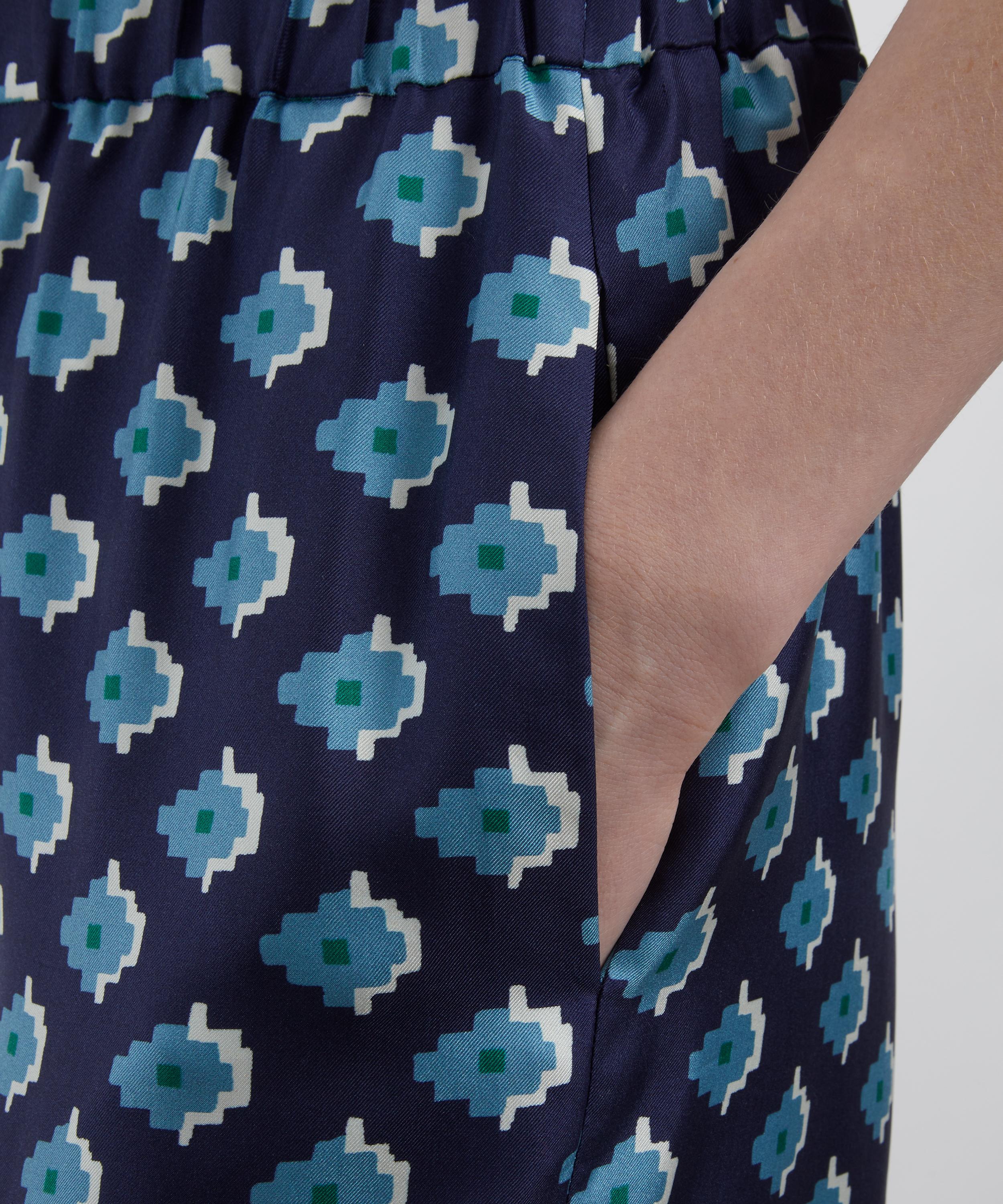 Printed in our very own cutting-edge Liberty fabric mill in northern Italy, this particular style of trouser showcases the Adamas print - discovered as a tiny fabric fragment in the Liberty archive, this neatly arranged geometric pattern is reminiscent of traditional Central Asian or Middle Eastern kilim motifs. Featuring a grid of angular diamond shapes, the design’s simplicity and repetition creates bold shadow contrasts and a strong, graphic presence.