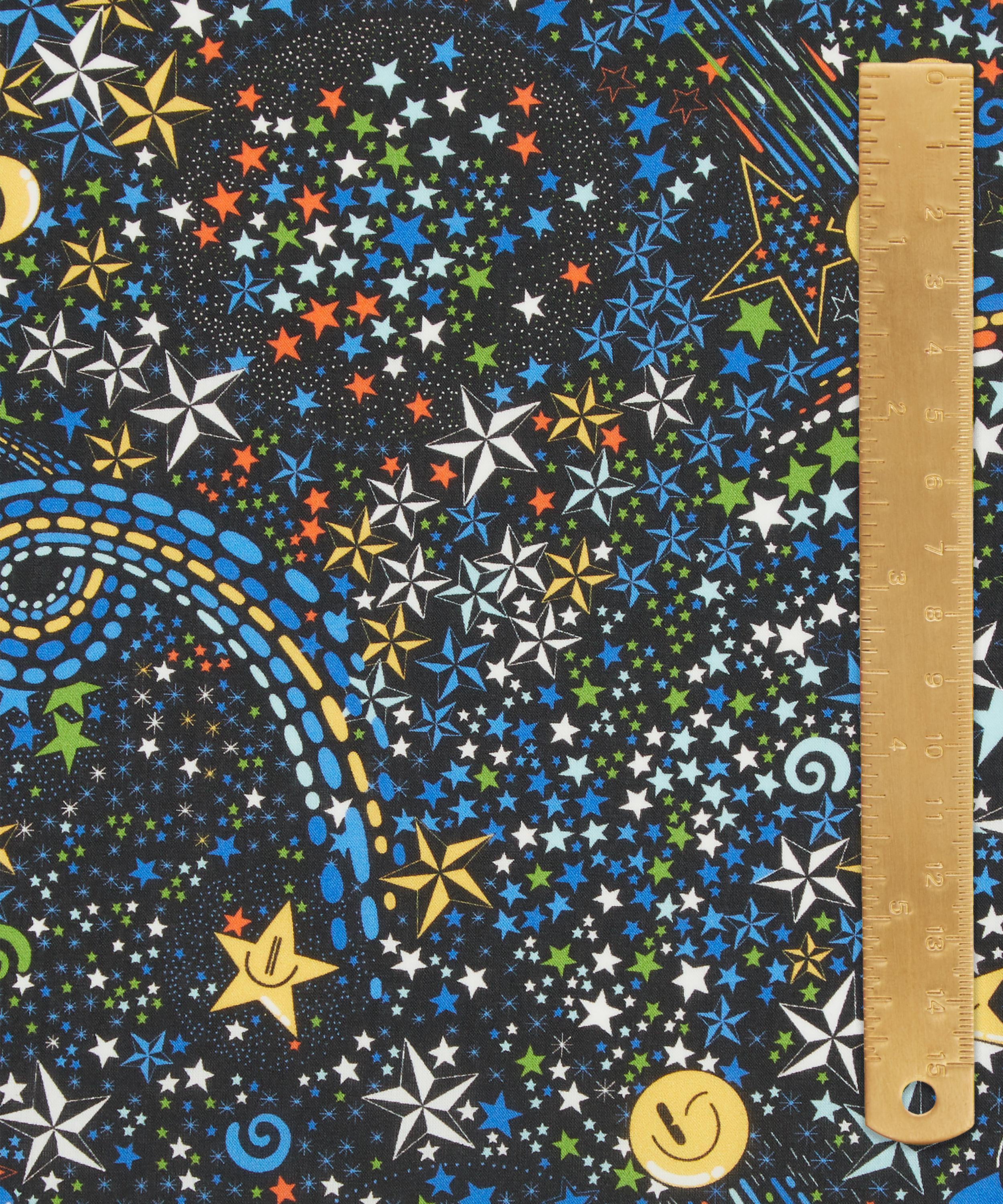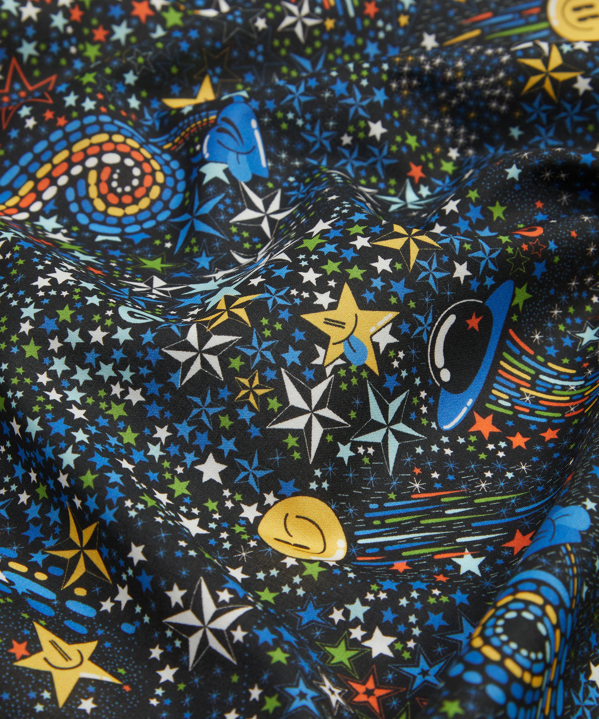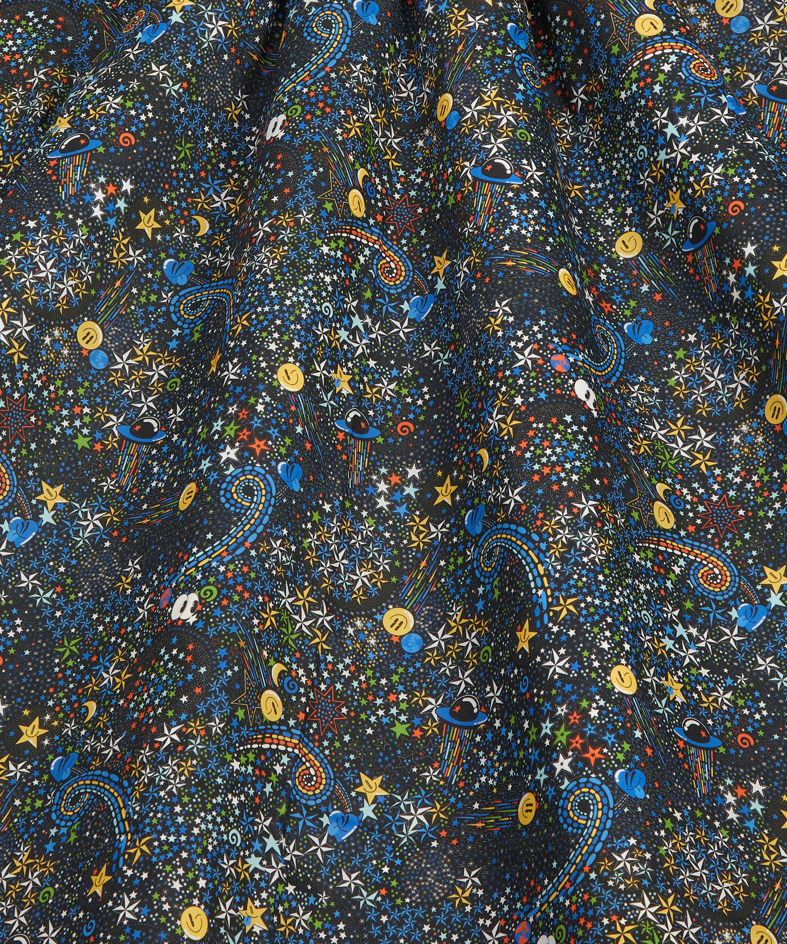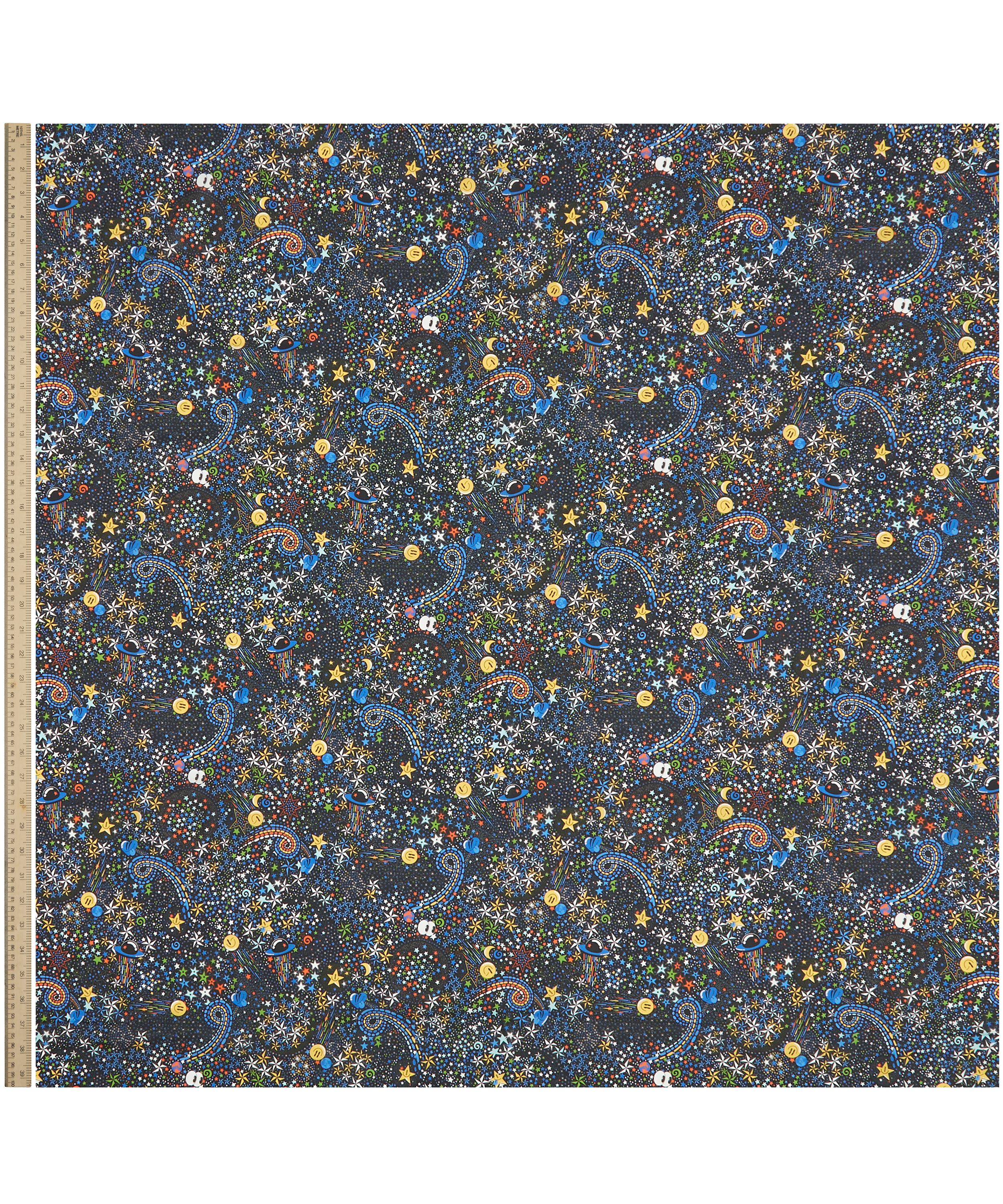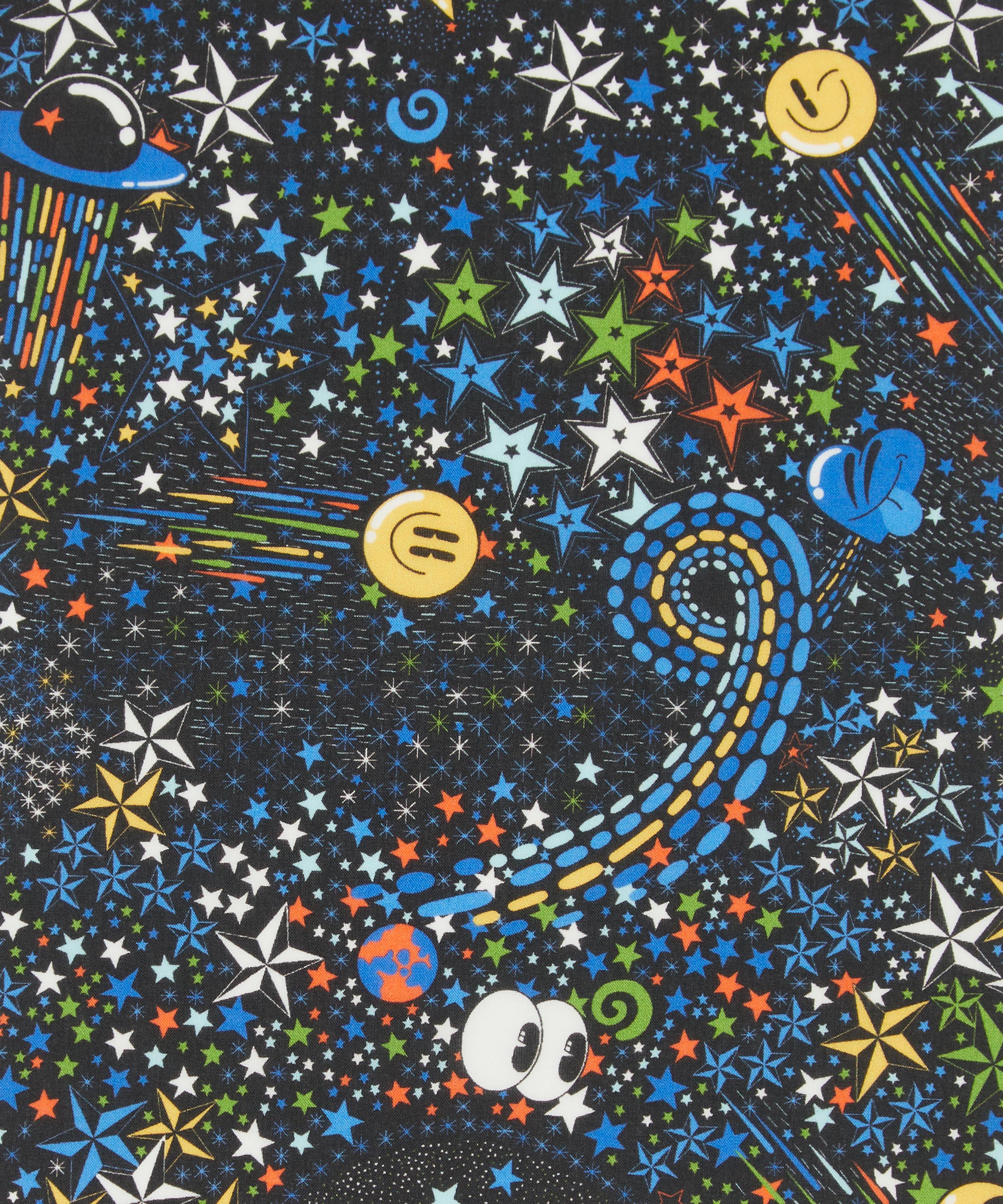 Originally created by the Liberty studio in 2010, this magical pattern has been given a playful makeover with the addition of Hattie Stewart’s quirky illustrations. Twinkling galaxies and swirling stars are interrupted by cheeky characters, flying UFO’s, and even curious eyes staring into space. This print is part of the Floral Wonderland narrative of the AW24 collection, which celebrates a world of never-before-seen species and hybrid varieties created from the Designer’s imagination – a real carnival of nature.