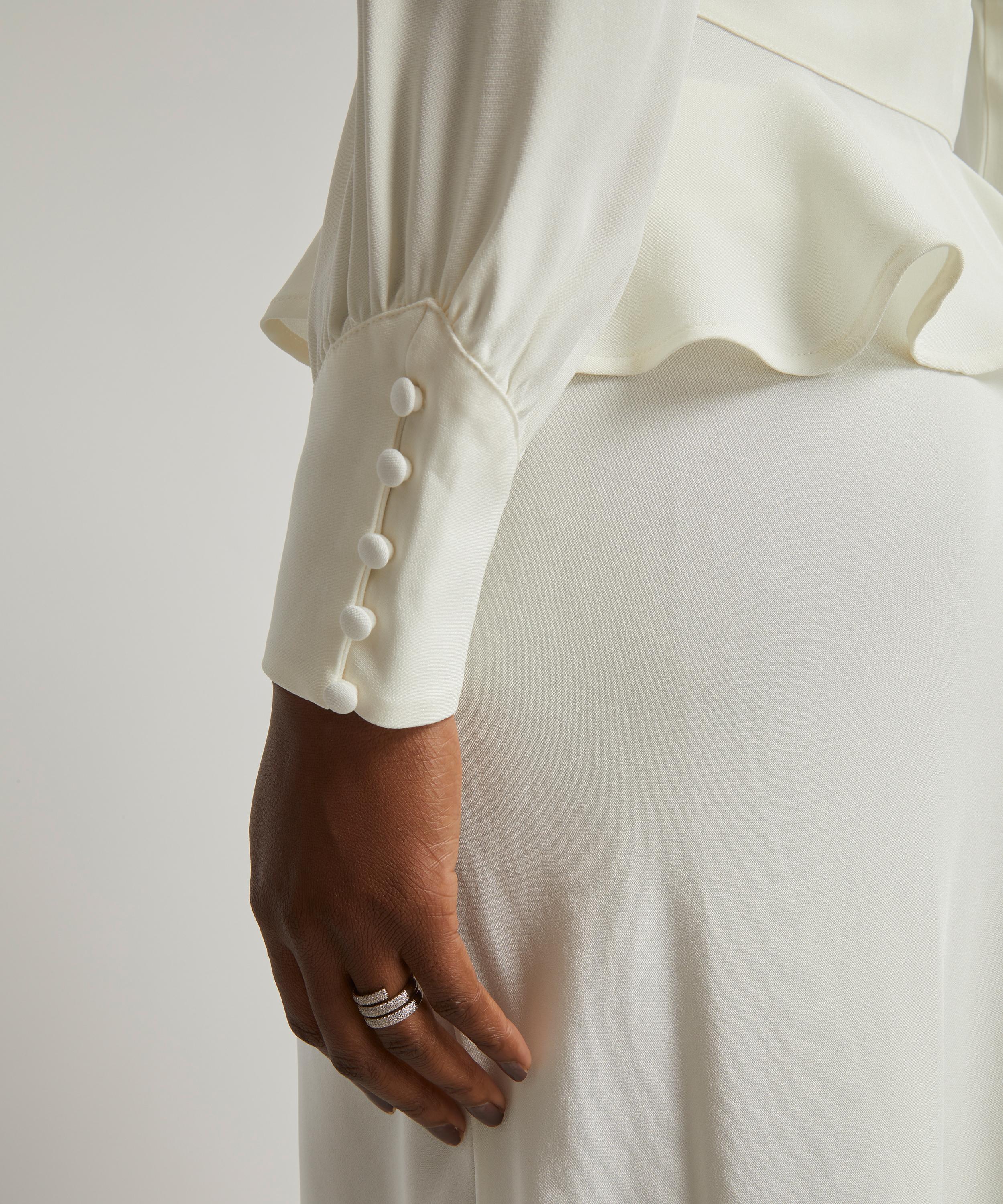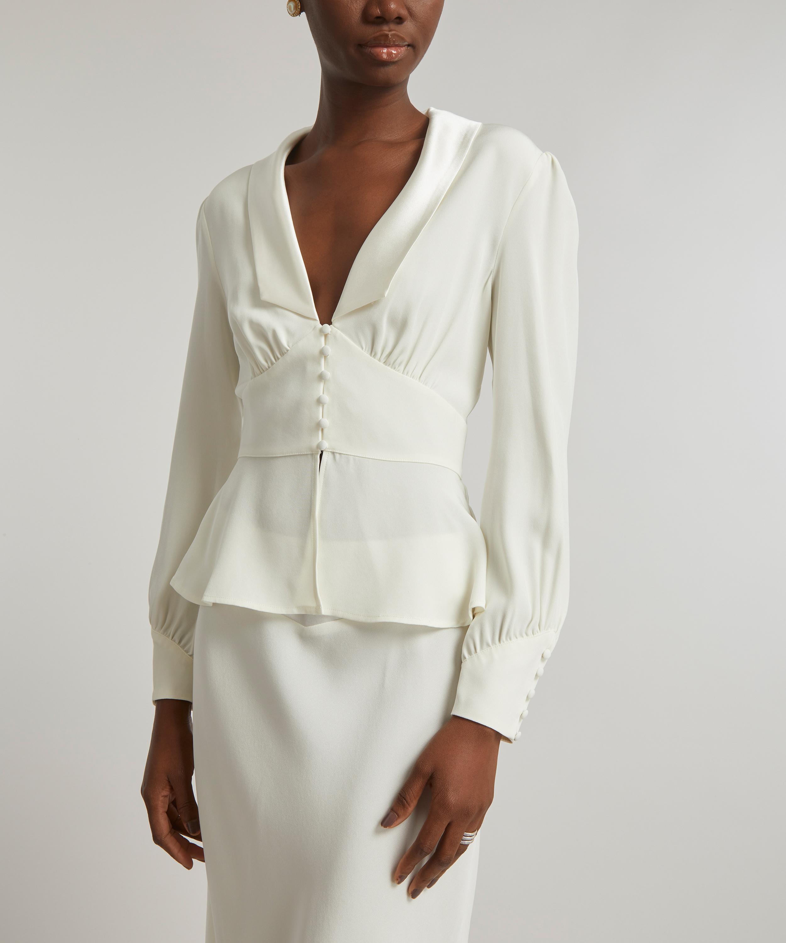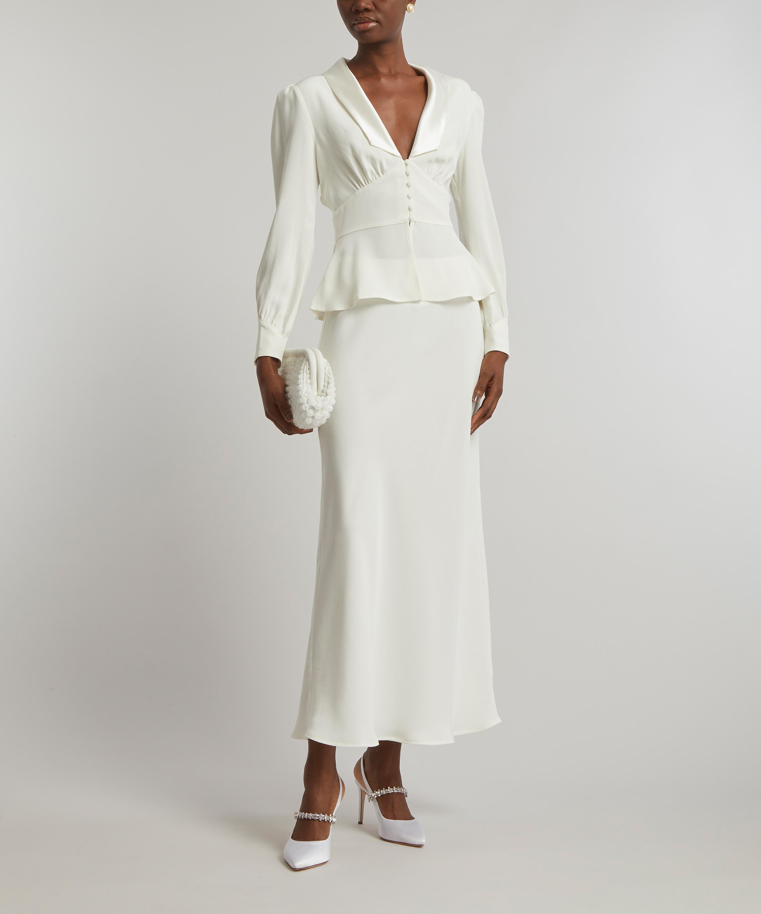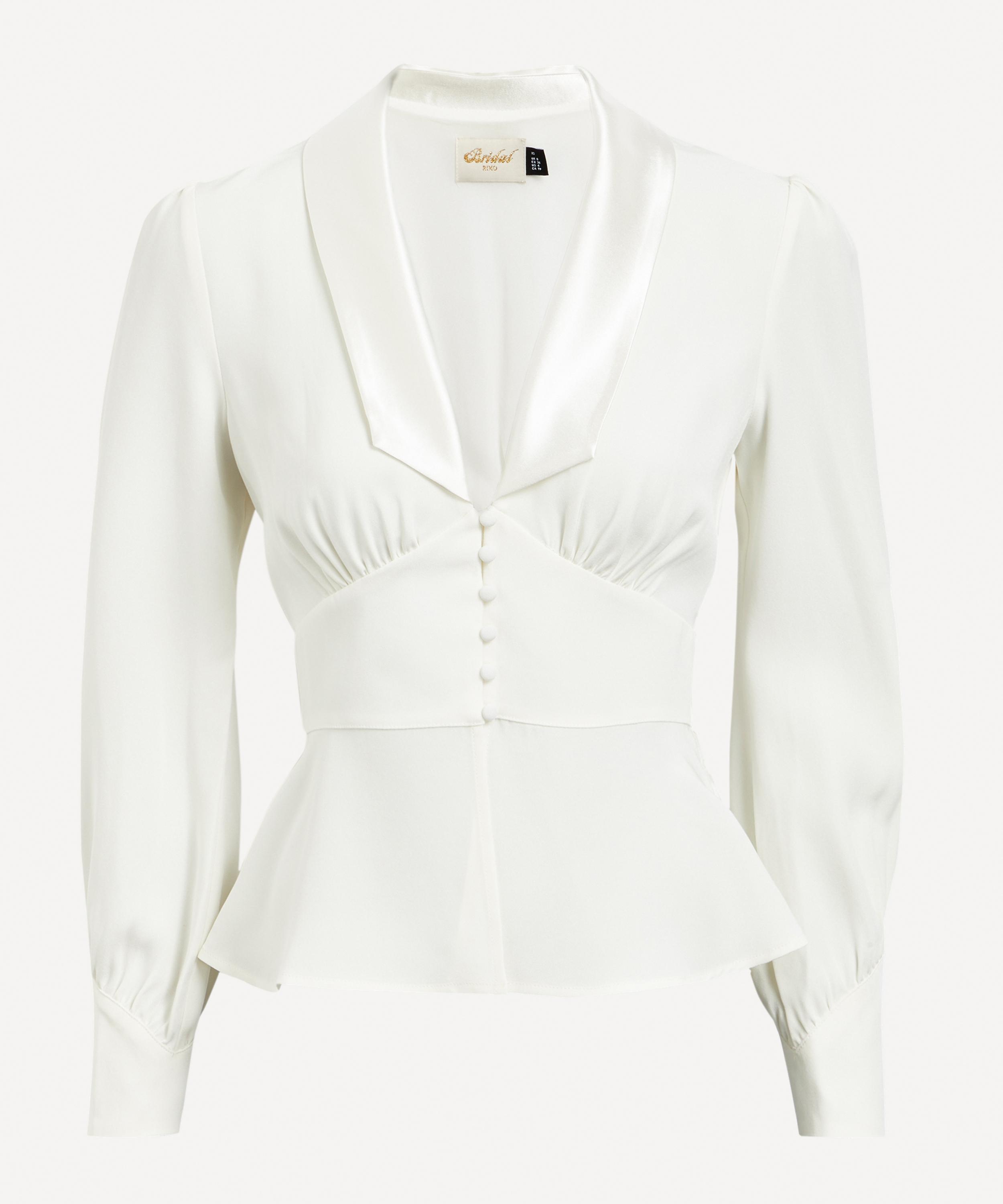 Effortlessly flattering and feminine, RIXO’s vintage-inspired bridal styles look as beautiful in antique frames as they do on Instagram – the Adeline jacket is no exception. Cut from satin-back silk crepe to a minimally structured silhouette with a gathered waist and a delicately draped peplum hem. Inspired by vintage styles, this elegant jacket is complete with a modest V-neckline, an angled collar and long blouson sleeves, fitted with classic barrel cuffs. Wear it with the matching Joan skirt for a retro-infused finish.