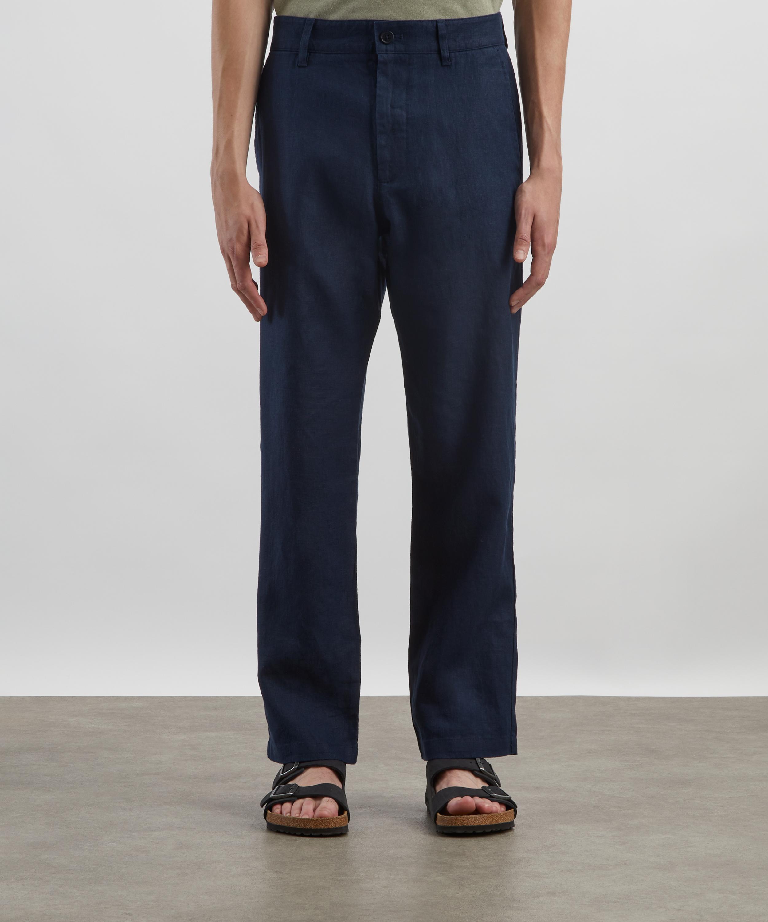Crafted from lightweight, breathable linen, the Aden trousers feature a classic straight-leg silhouette, enhanced slanted side pockets, and dual back welt pockets for a polished, effortless look.