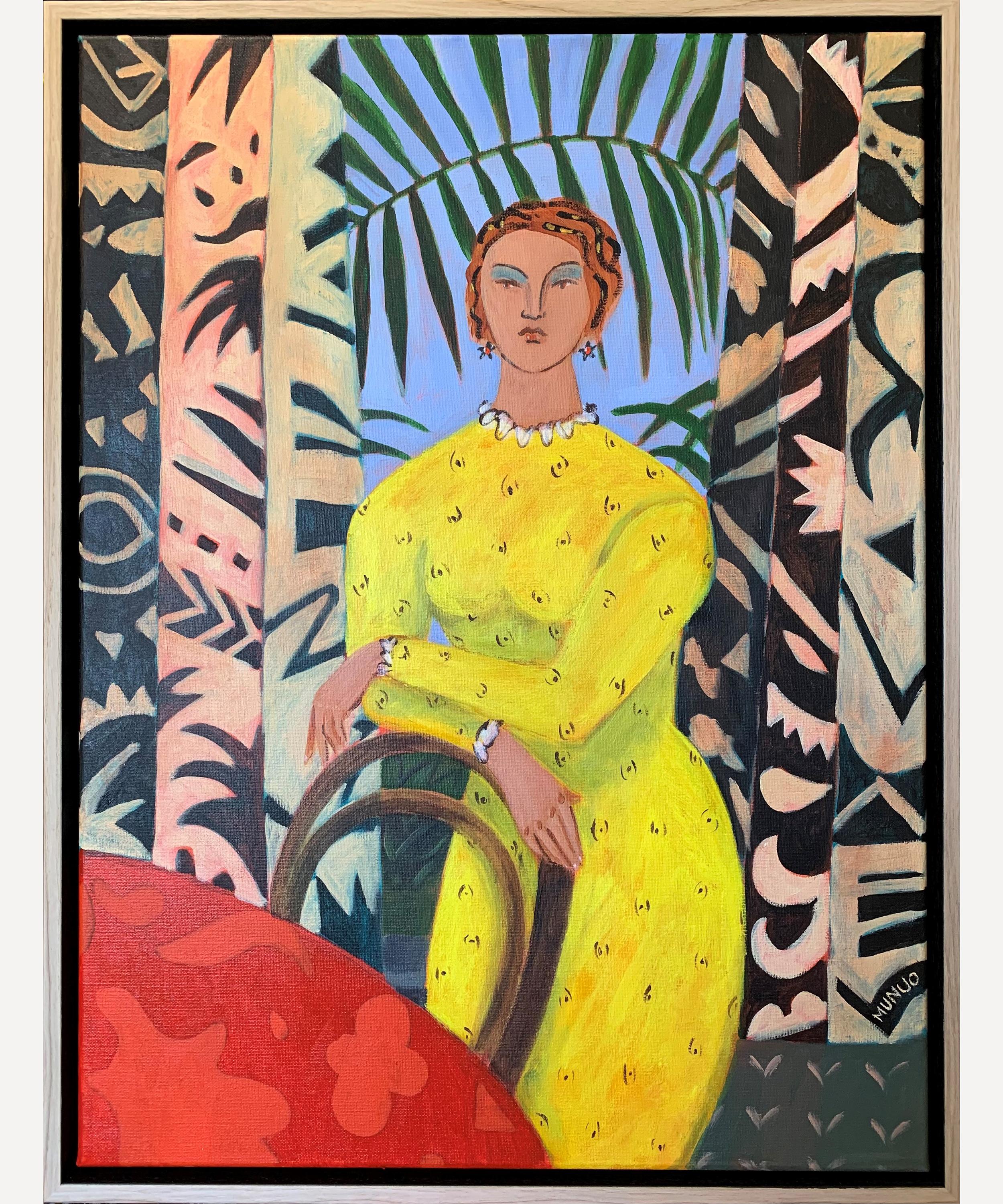 With inspirations including the modern masters, her interior surroundings and family, Munuo's distinctive mid-century style compositions fuse spontaneous and expressive gestures with joyful colour harmonies and compositional structure. Boldly exploring the relationship between the figure, objects and their environment, each original piece is destined to be the focal point of any room.