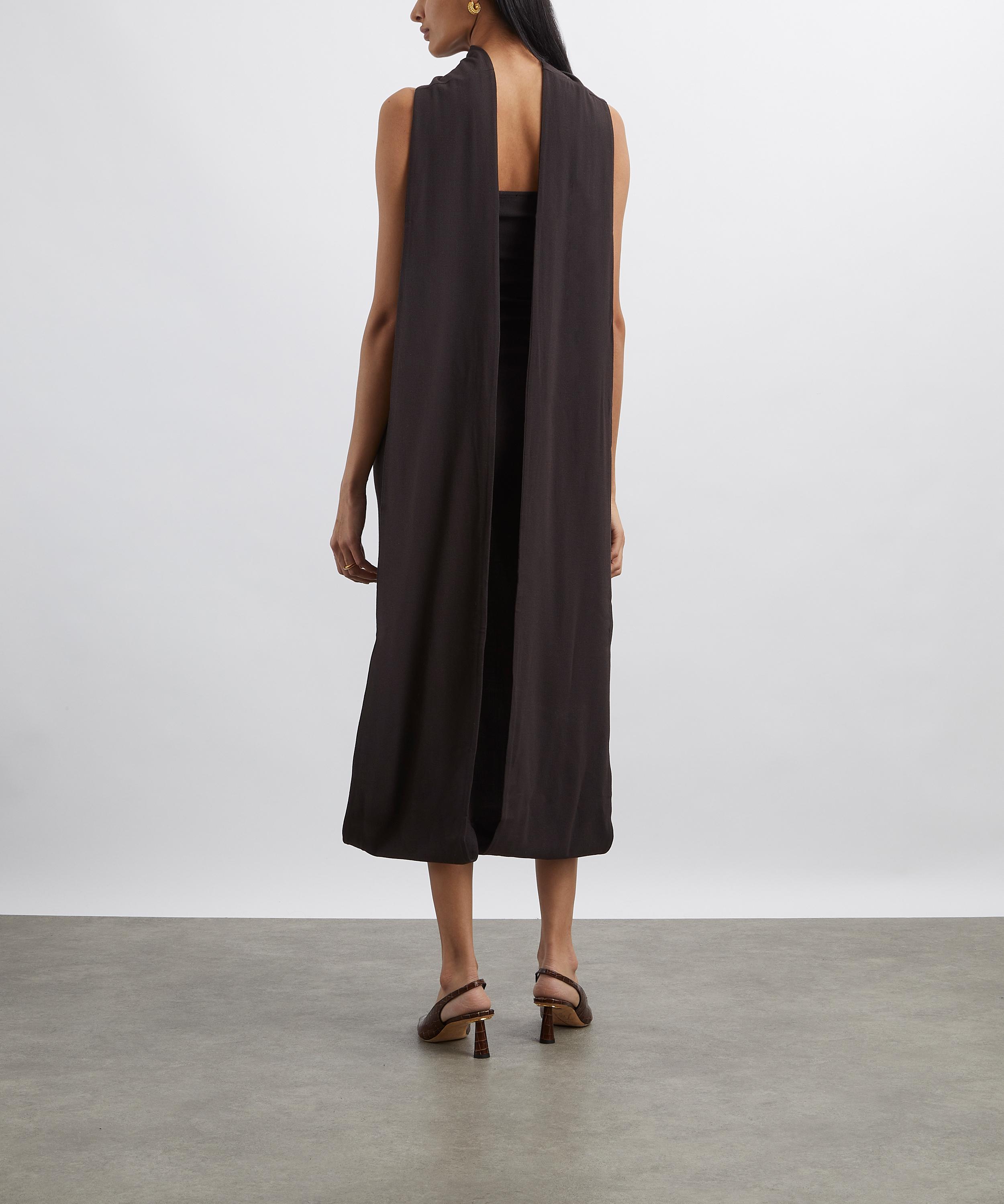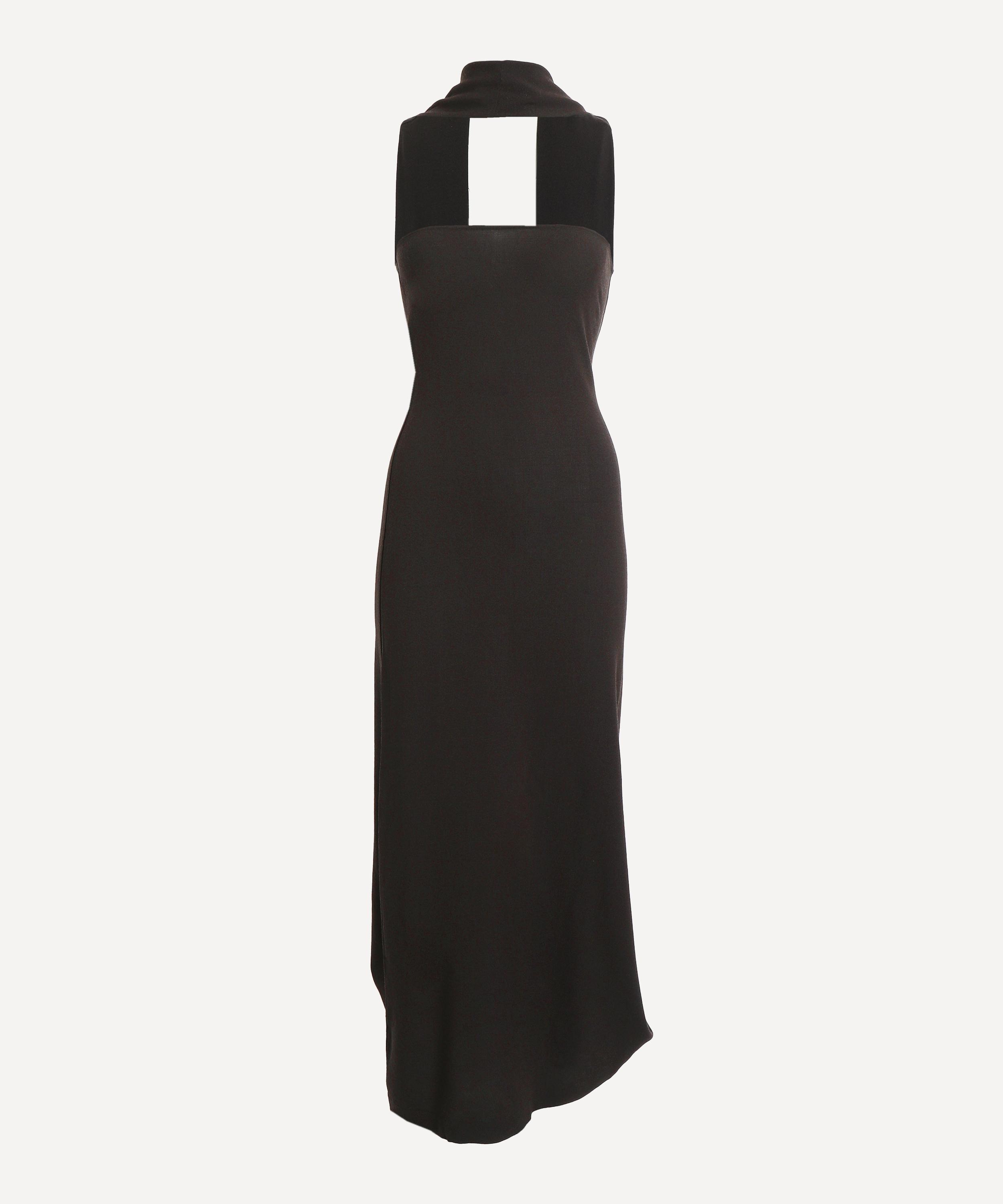Constructed from stretchy wool, this sleeveless dress is defined by a fitted bandeau bodice. A folded front panel extends from the skirt to create a draped high neckline, lending sculptural elegance to the streamlined silhouette.