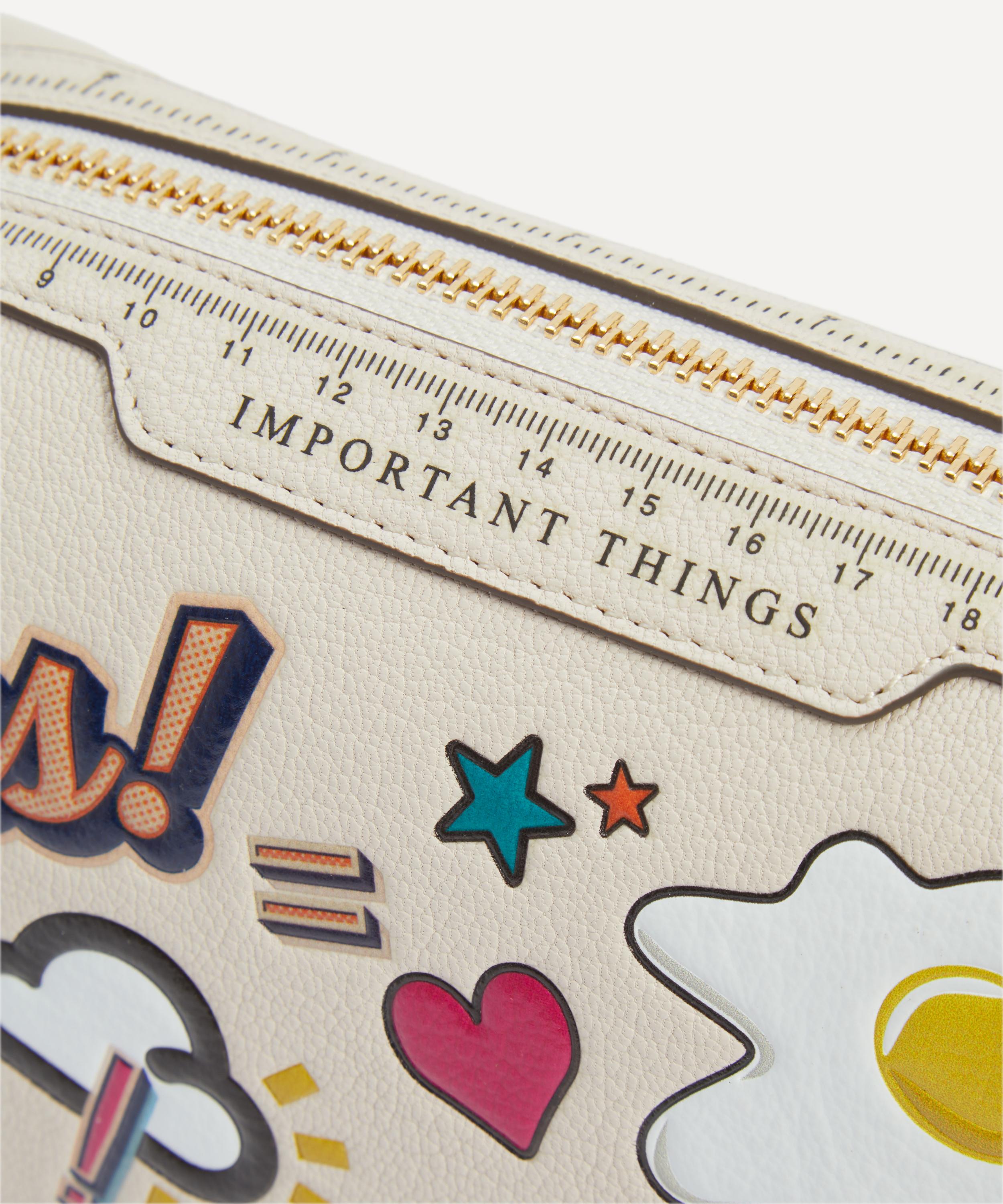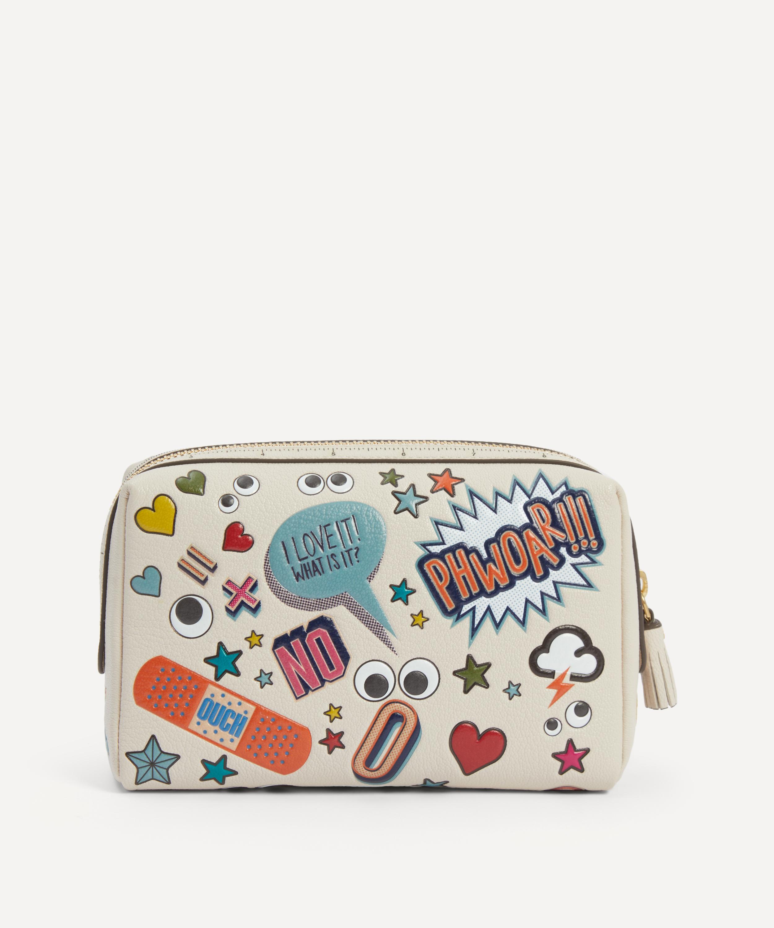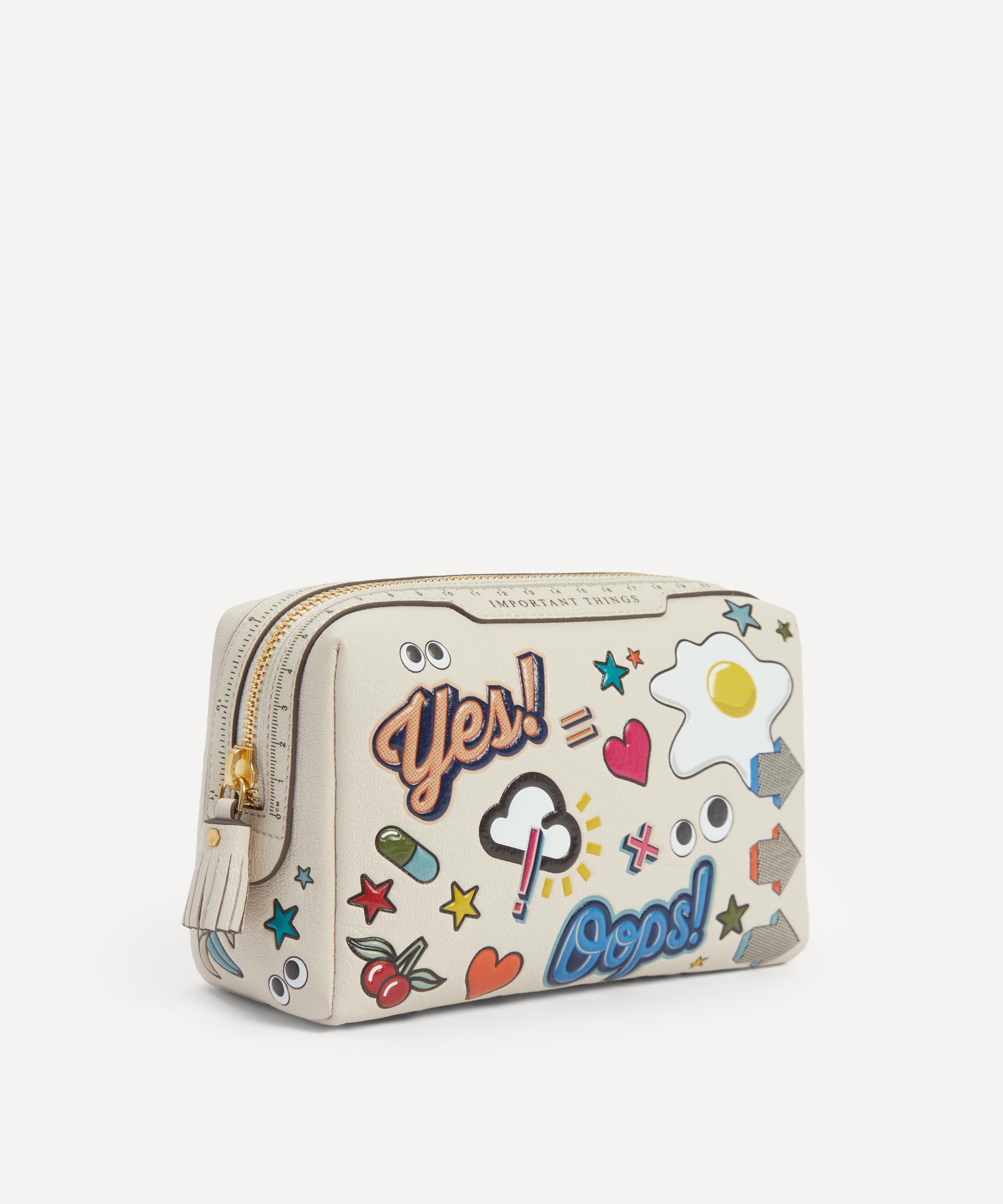 Ready to explore the world in style, Anya Hindmarch’s All Over Stickers Important Things pouch is perfect for daily dressing or long-haul trips.