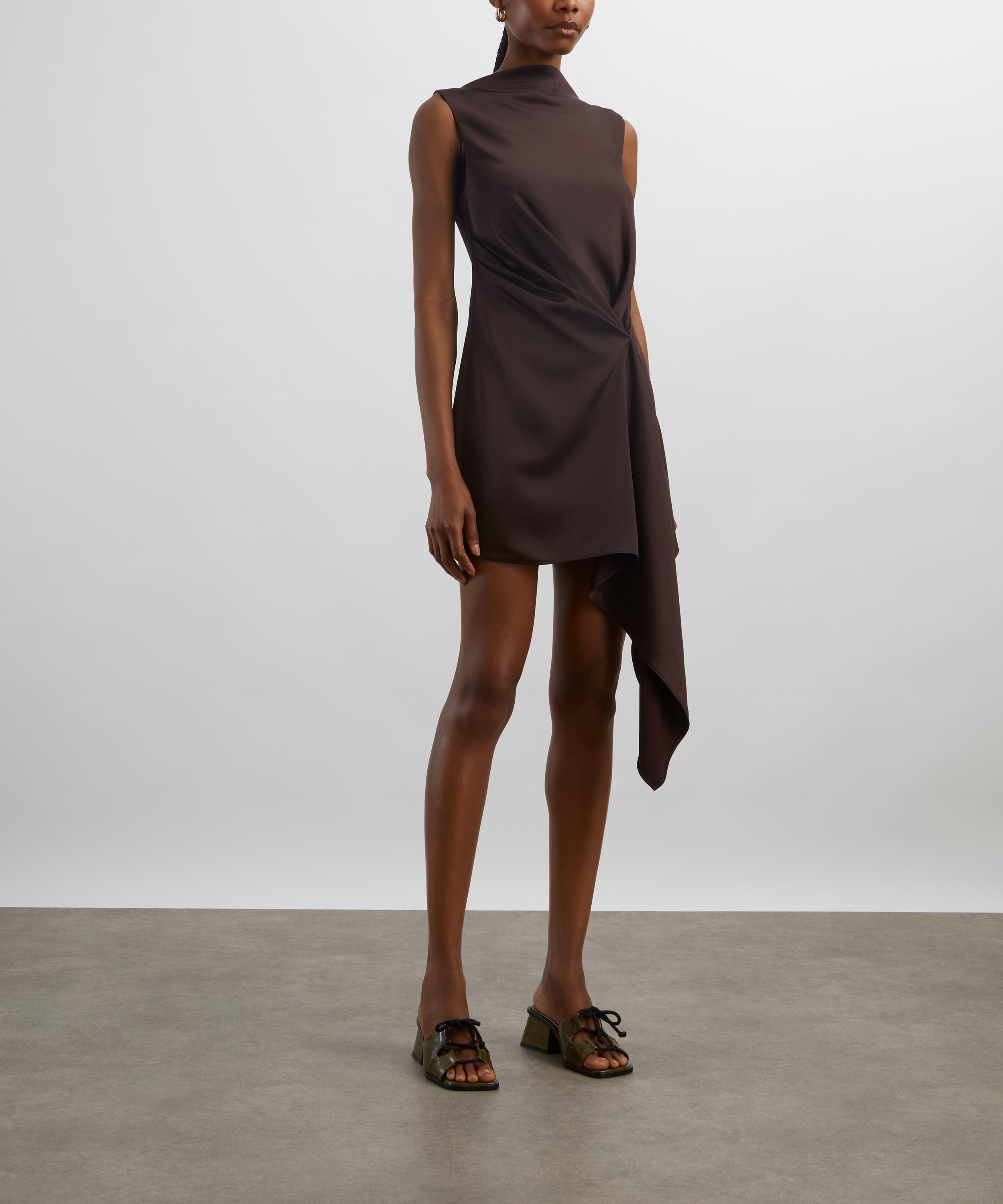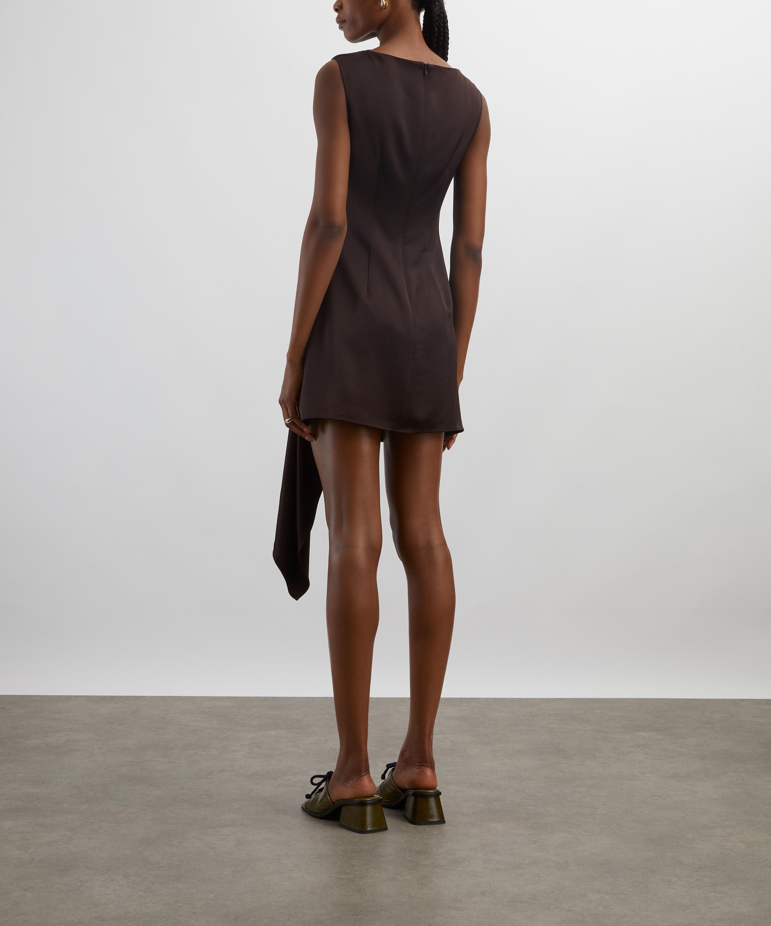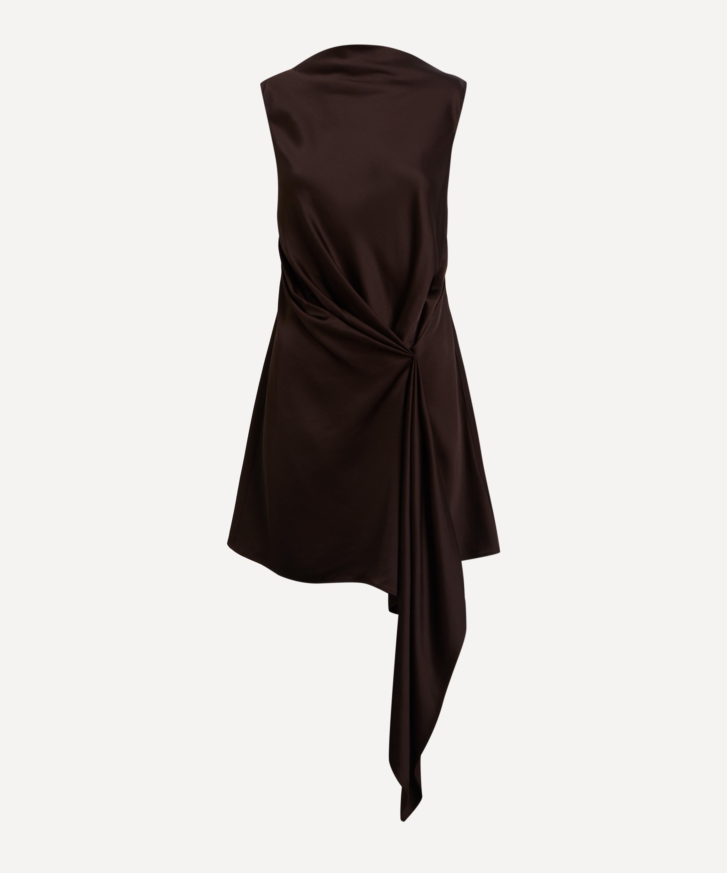 Crafted from sumptuous satin in an exclusive chocolate colourway, the Alyssa Mini exudes refined allure in a sleek, sleeveless silhouette. Its high neckline is balanced by an elegant asymmetric front drape, adding sculptural interest to the timeless design. The bodice is lined for a flattering, structured fit, while an invisible back zip ensures a seamless finish.
