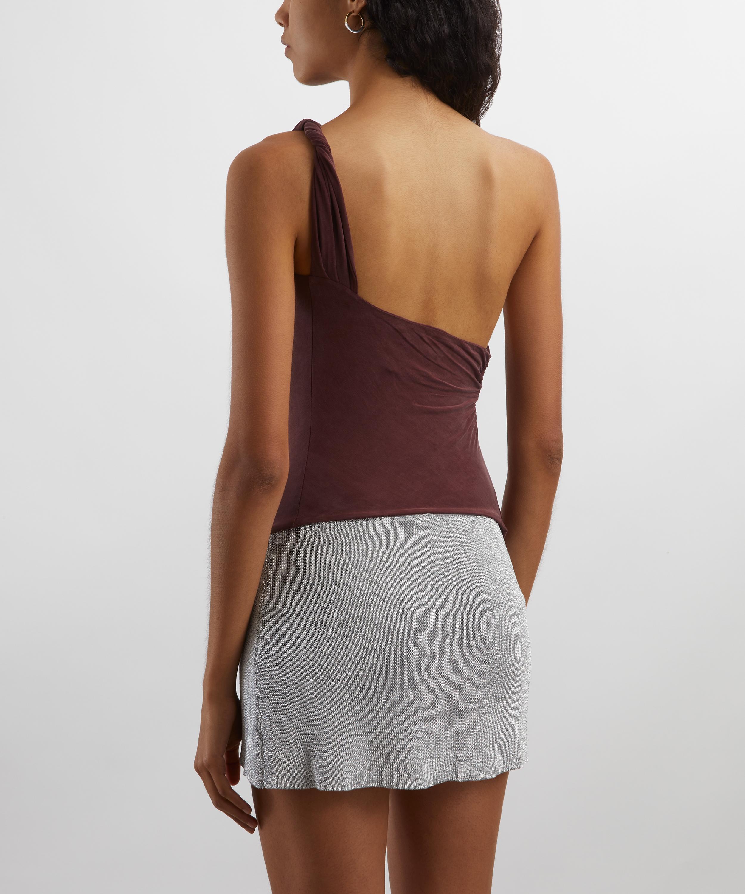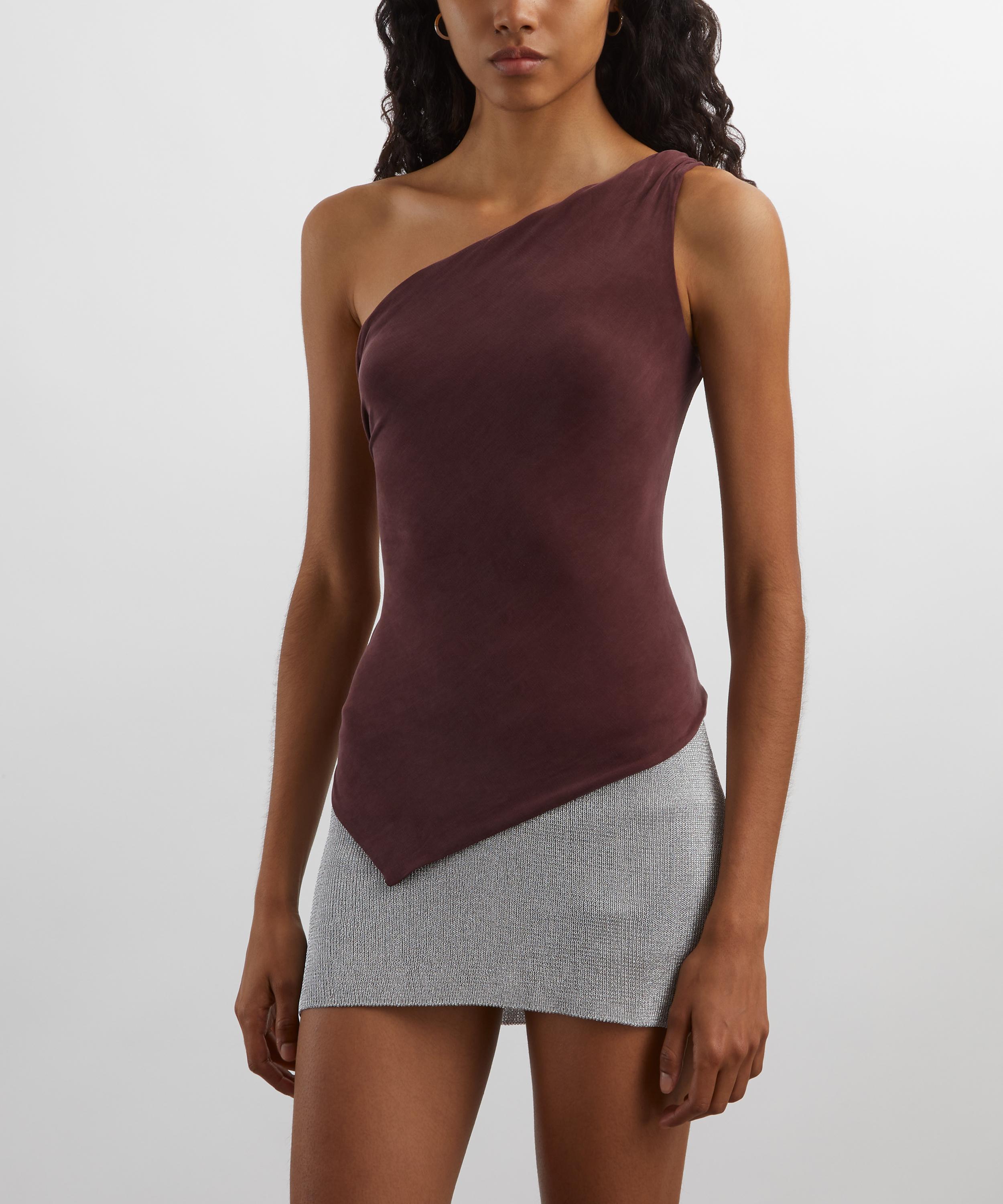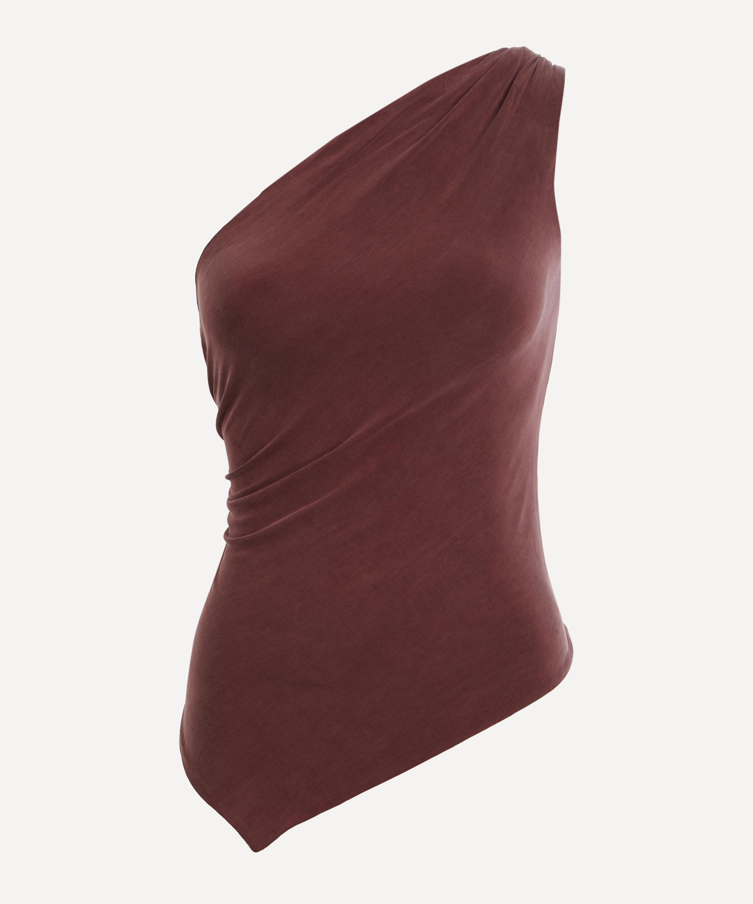 In a rich brown hue, the One-Shoulder Top is a flirty and playful statement piece, designed with a twisted single-shoulder strap, subtle ruching along the sides, and an asymmetric hem for a flattering silhouette.