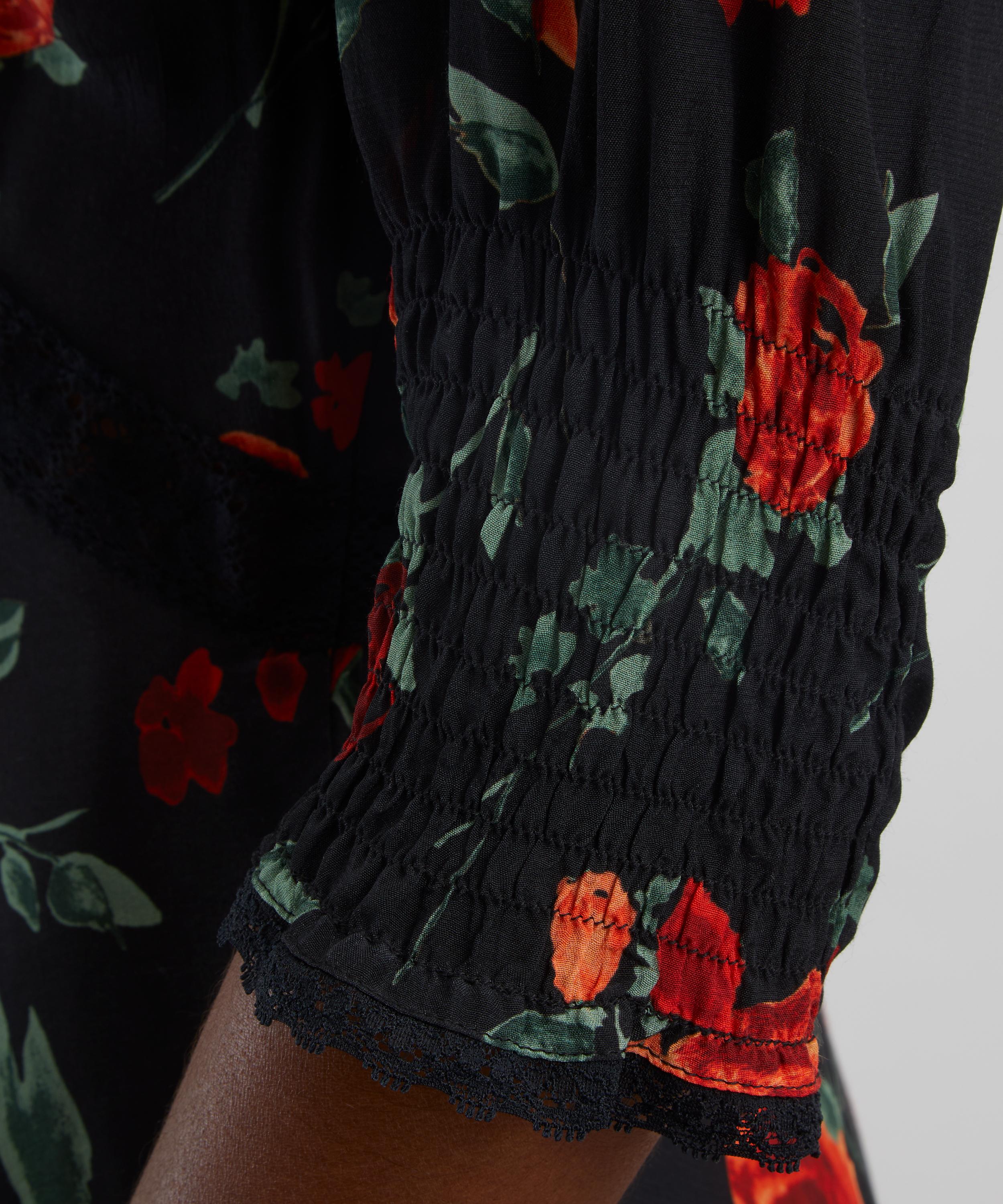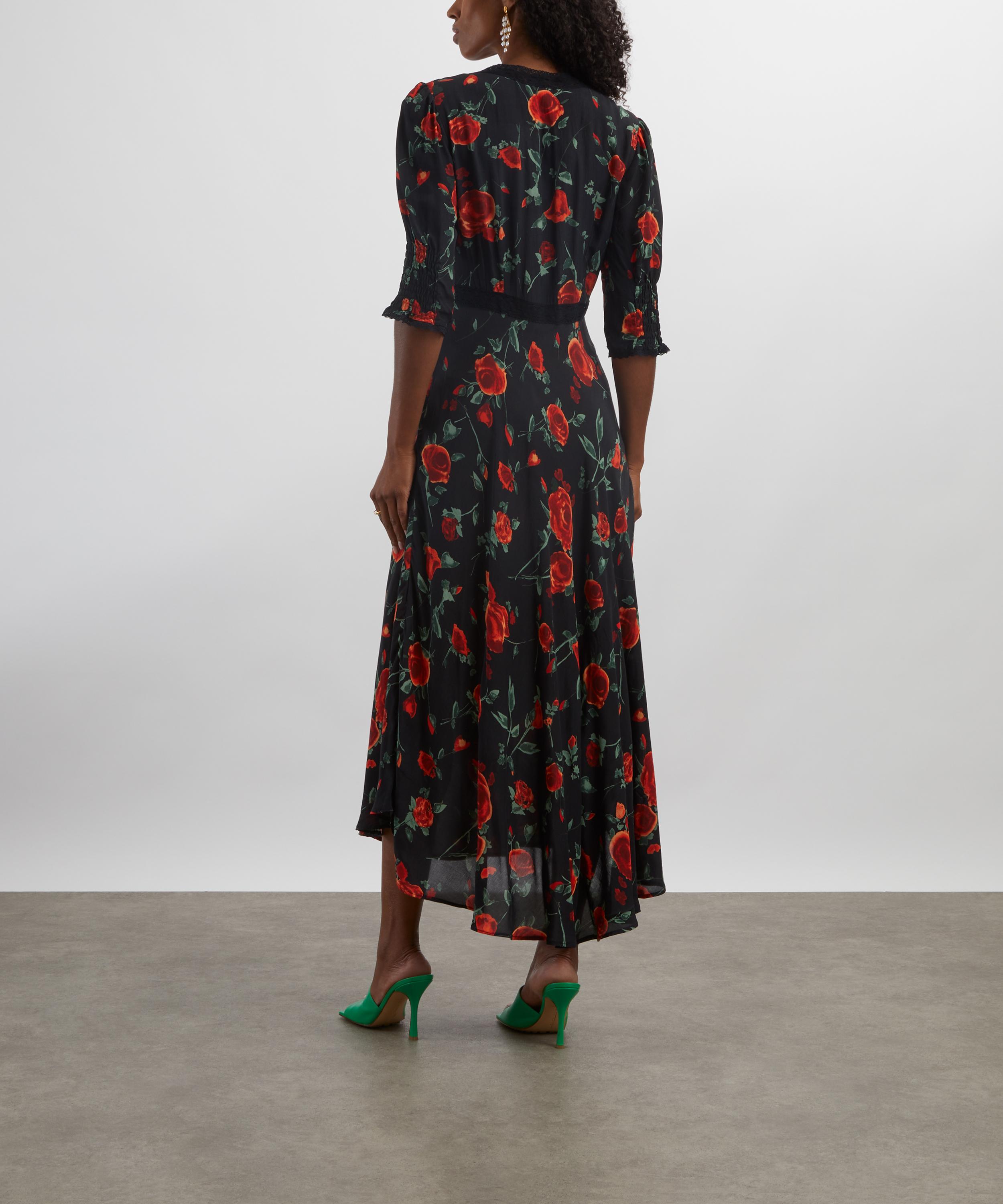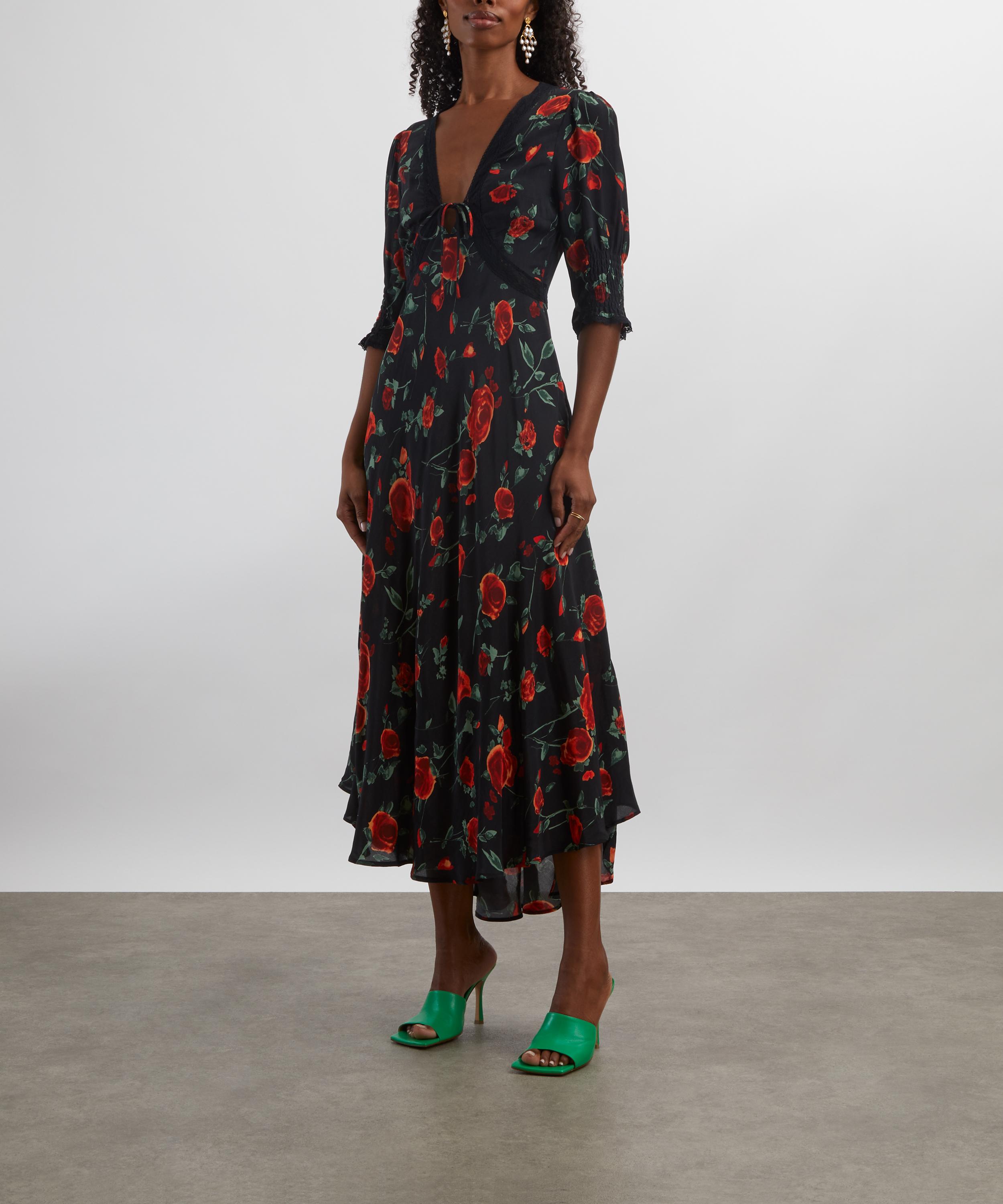 Crafted from lightweight crepe and adorned with a vintage-inspired rose print, this midi dress embodies effortless elegance. A deep V-neckline, empire waist, and delicate lace trims lend a romantic, timeless charm, making it perfect for both sunlit days and graceful evenings.