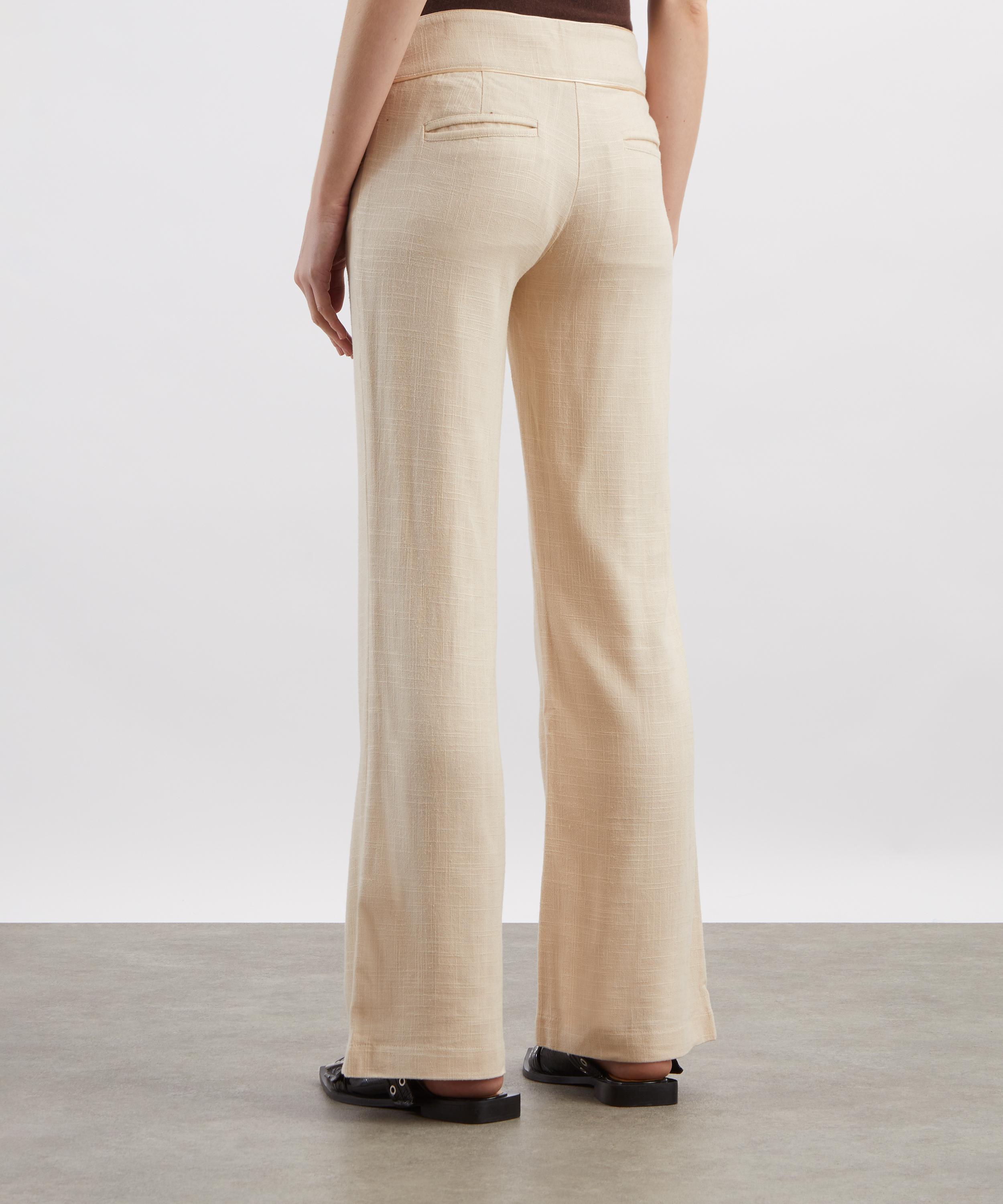 Cut from a soft Italian linen-blend in a light beige tone, these low-rise trousers are designed with a wide-leg fit, detailed with a curved waistband and mother-of-pearl button closure, offering an effortlessly tailored finish.